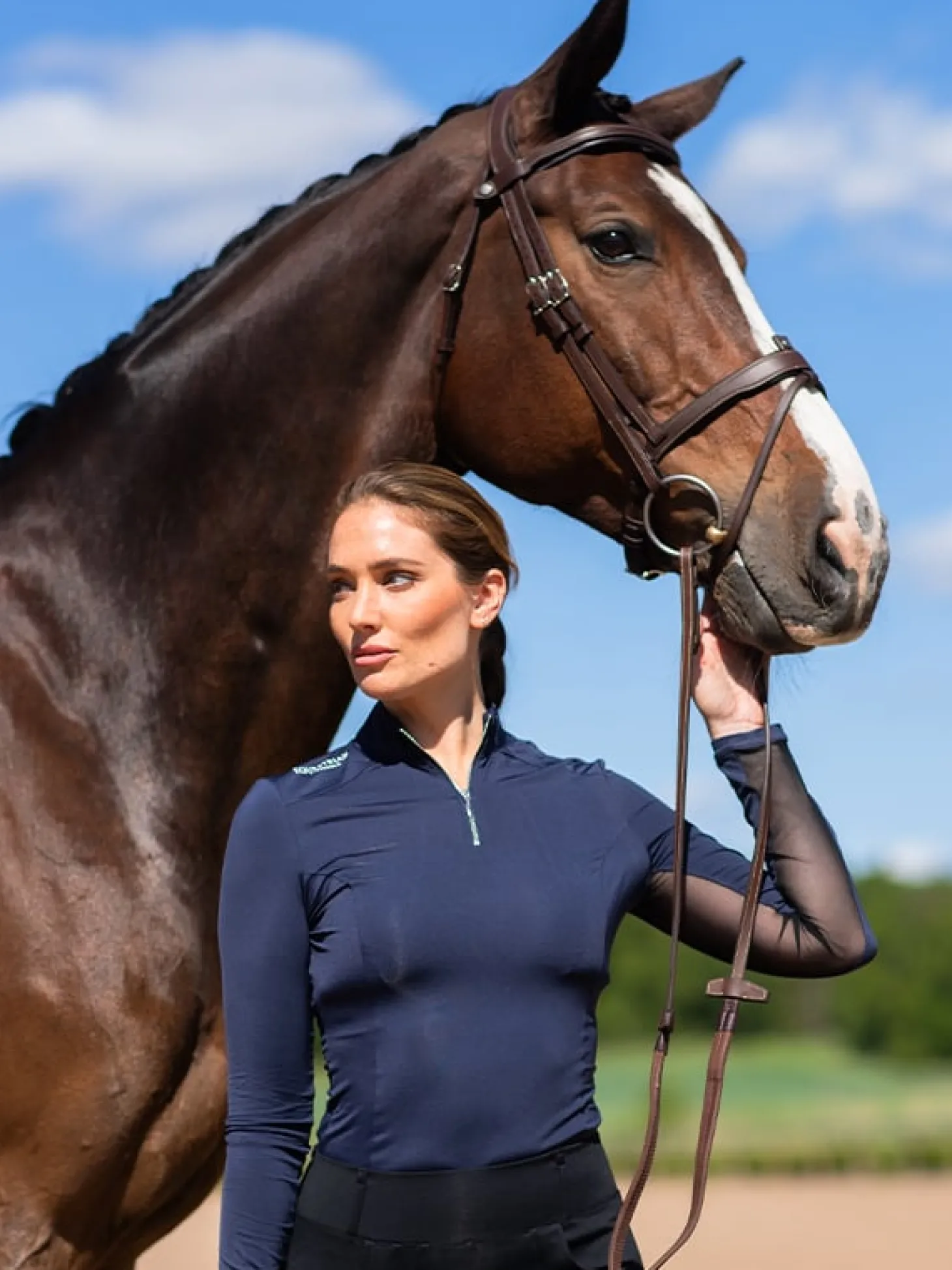 Dieses ultimative Reittop für wärmere Tage ist in einem eleganten marineblauen Design mit einem silbernen Reißverschluss auf der Vorderseite gehalten. Es besteht aus einem atmungsaktiven Netzeinsatz und ultradünnem Material, das atmungsaktiv ist und einen kühlenden Effekt hat.
