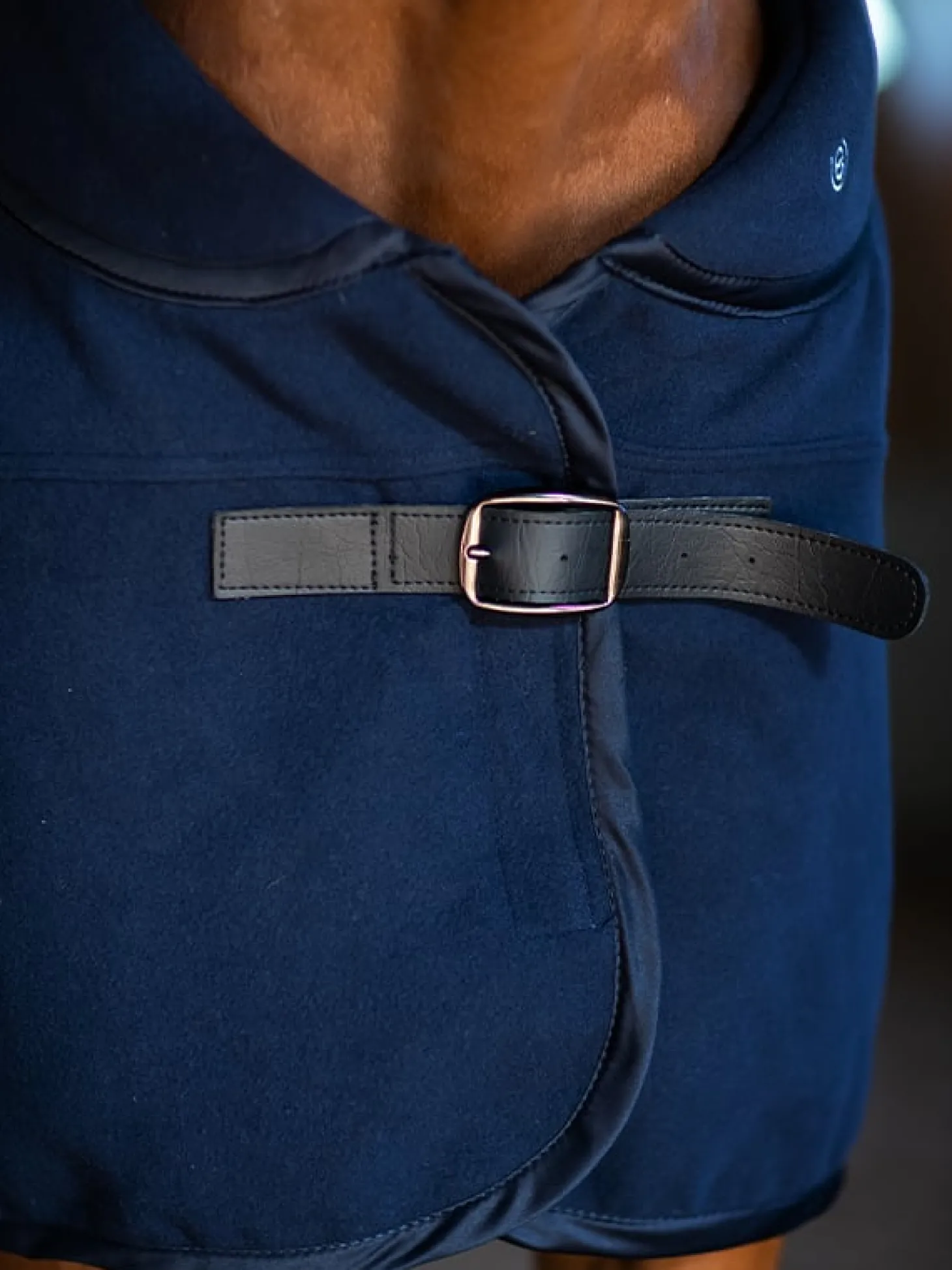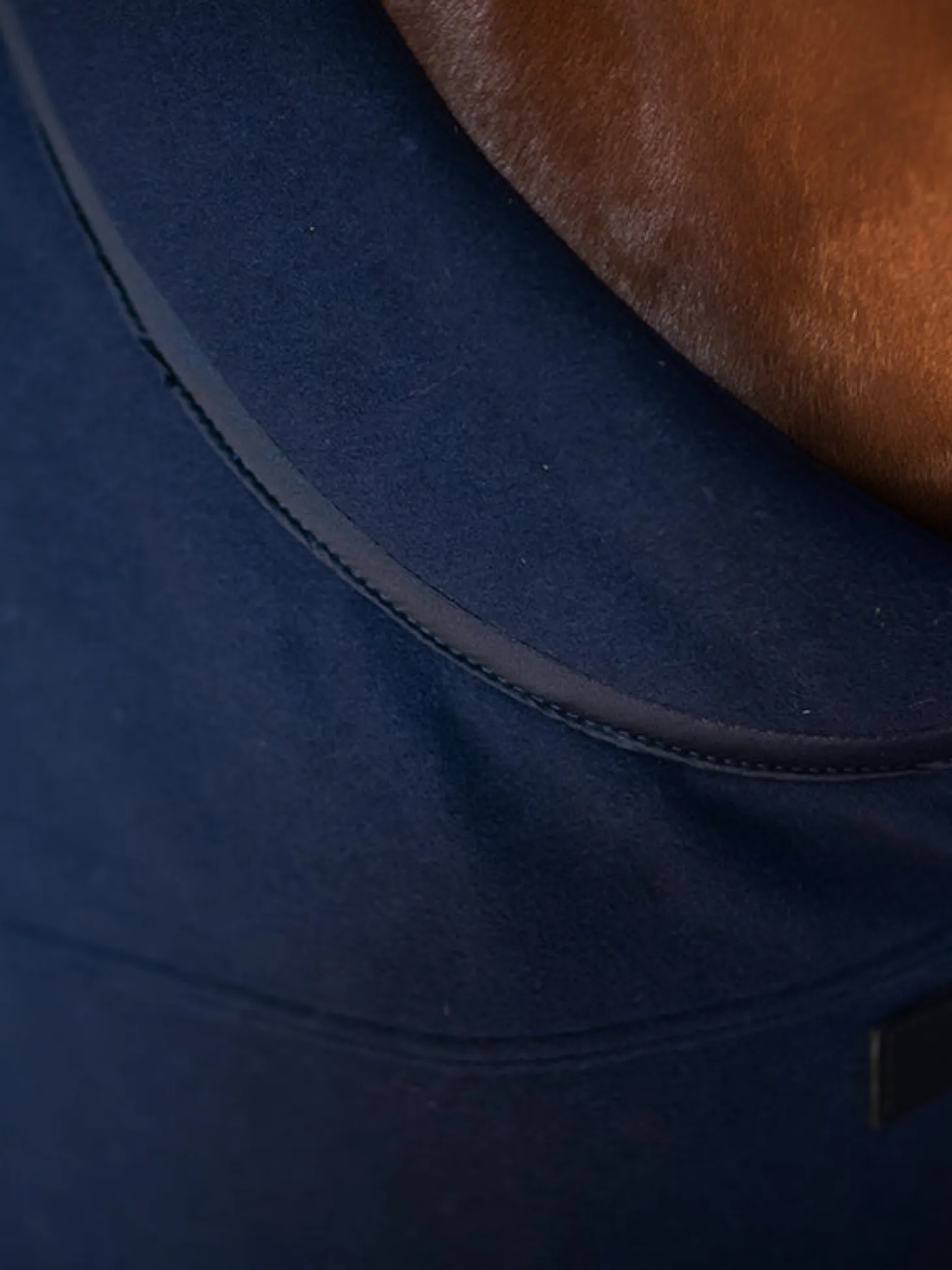 Eines der herausragenden Merkmale dieser Decke ist der gepolsterte Wollkragen in Marineblau, der nicht nur gut aussieht, sondern auch zusätzliche Wärme und Schutz für den Halsbereich bietet. Dies ist besonders wichtig für Pferde mit empfindlicher Haut oder solche, die zu Scheuerstellen neigen.