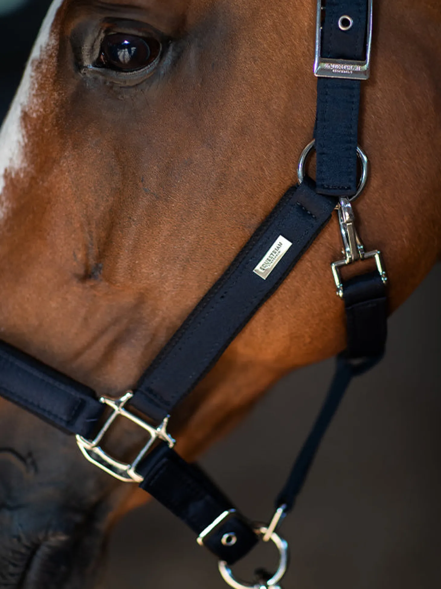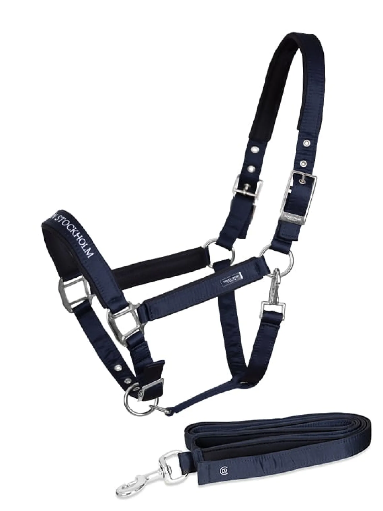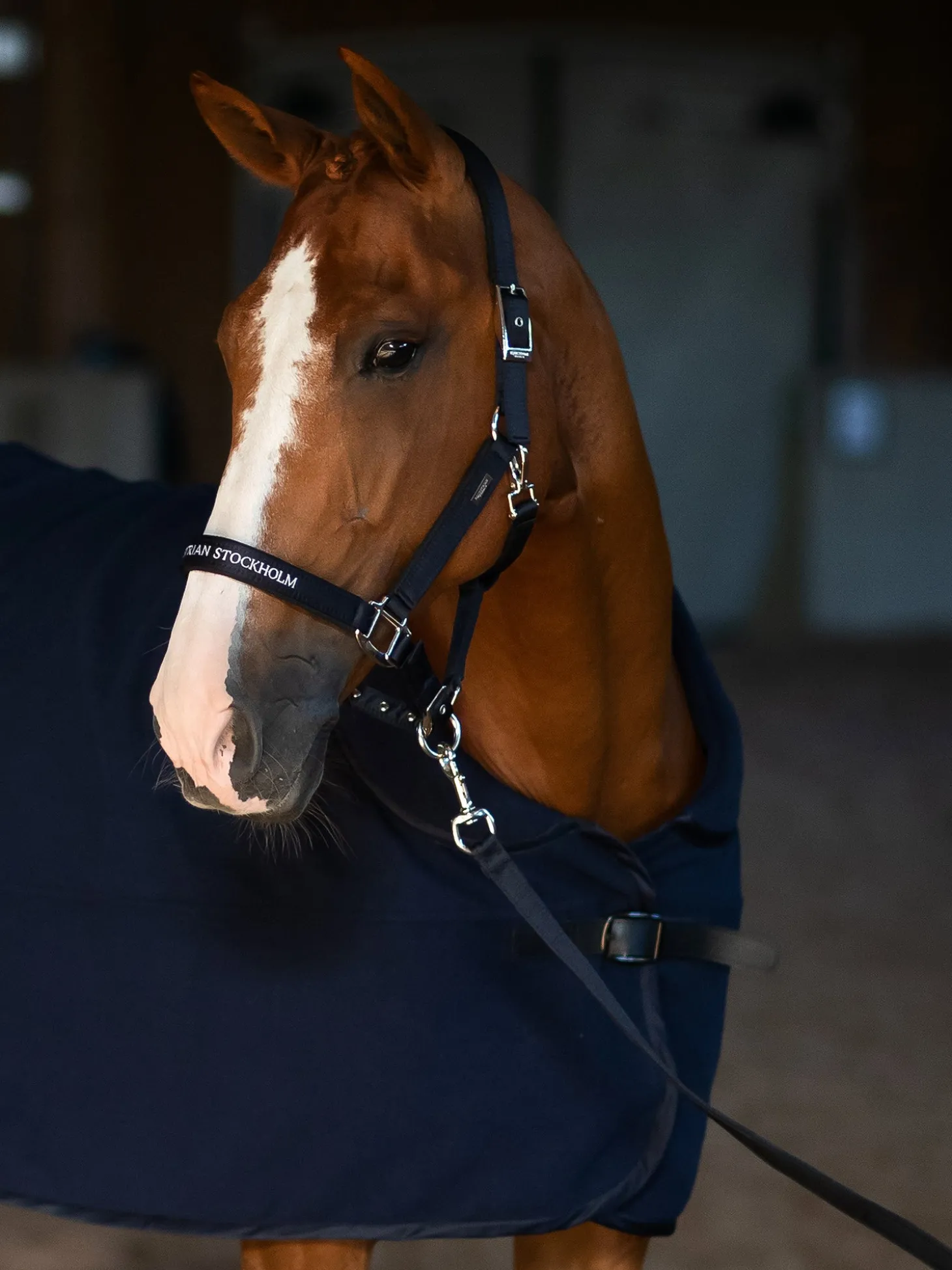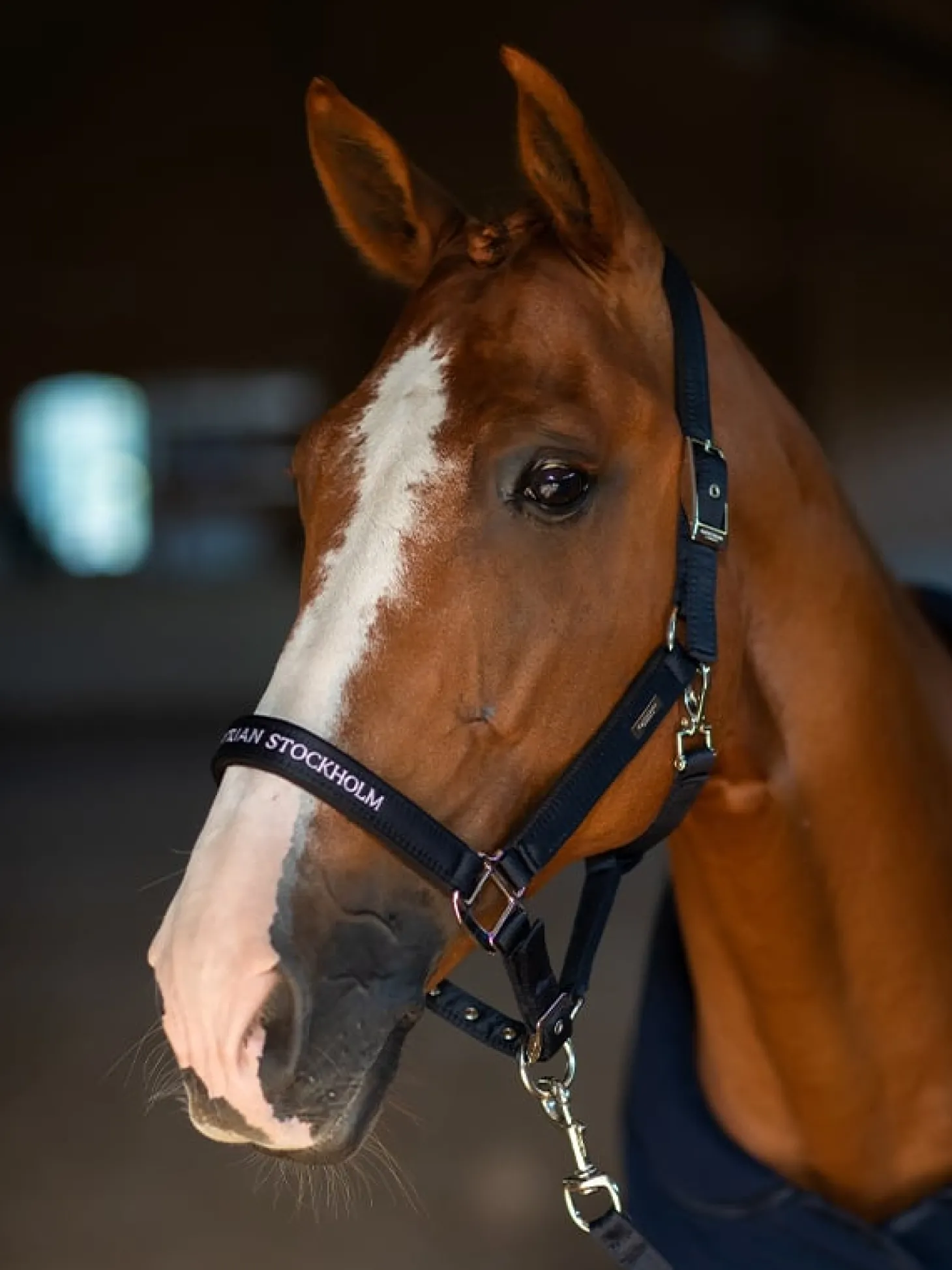 Verschönertes Equestrian Stockholm Logo auf dem Nasenriemen in Weiß. Kombinieren Sie das Halfter mit anderen Teilen aus der Modern Tech Navy Kollektion für einen kompletten Look. Das Halfter wird mit einem weich gepolsterten Führstrick geliefert.