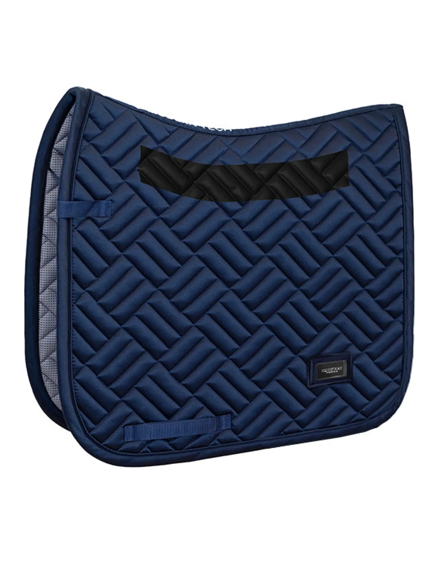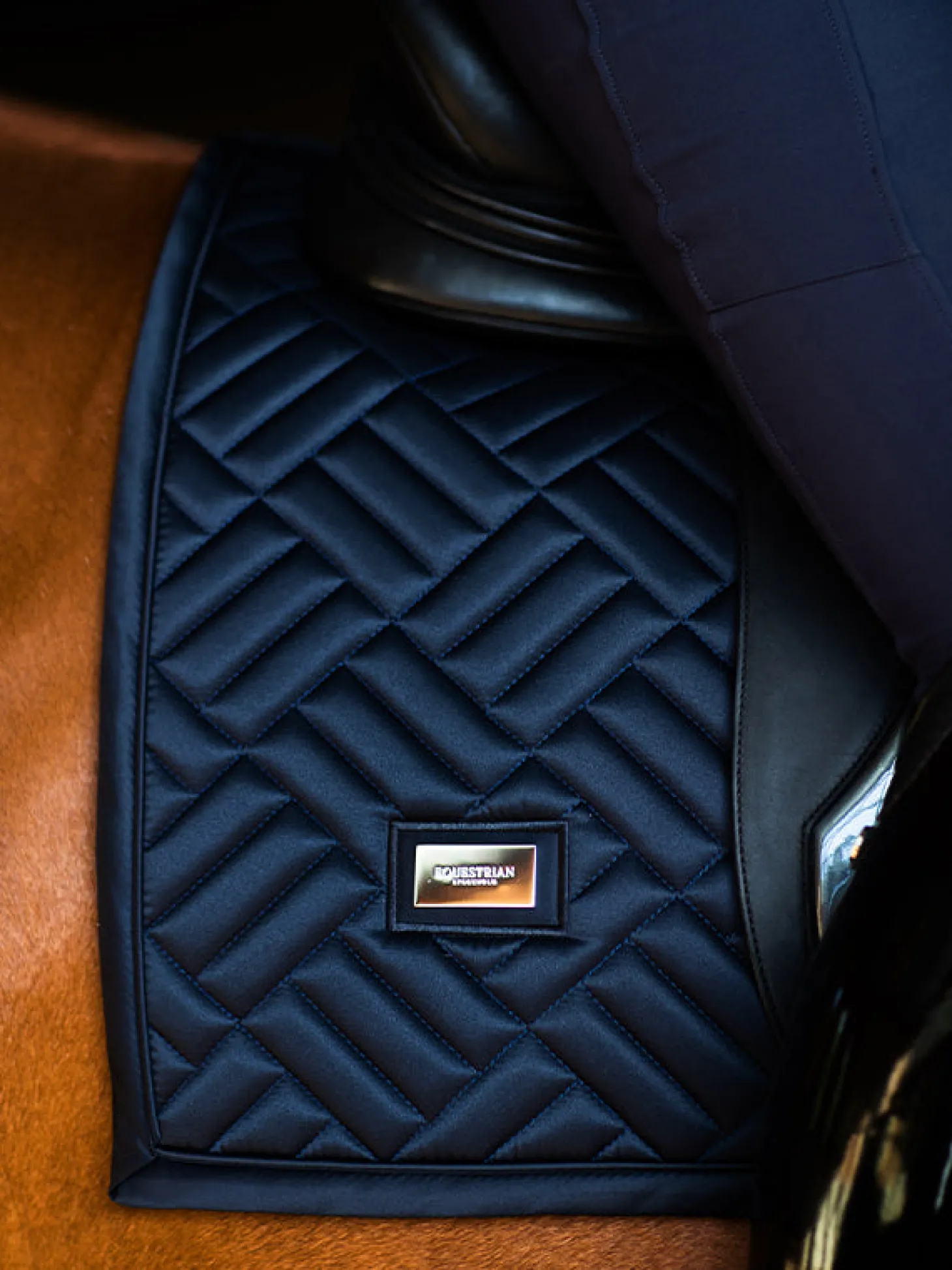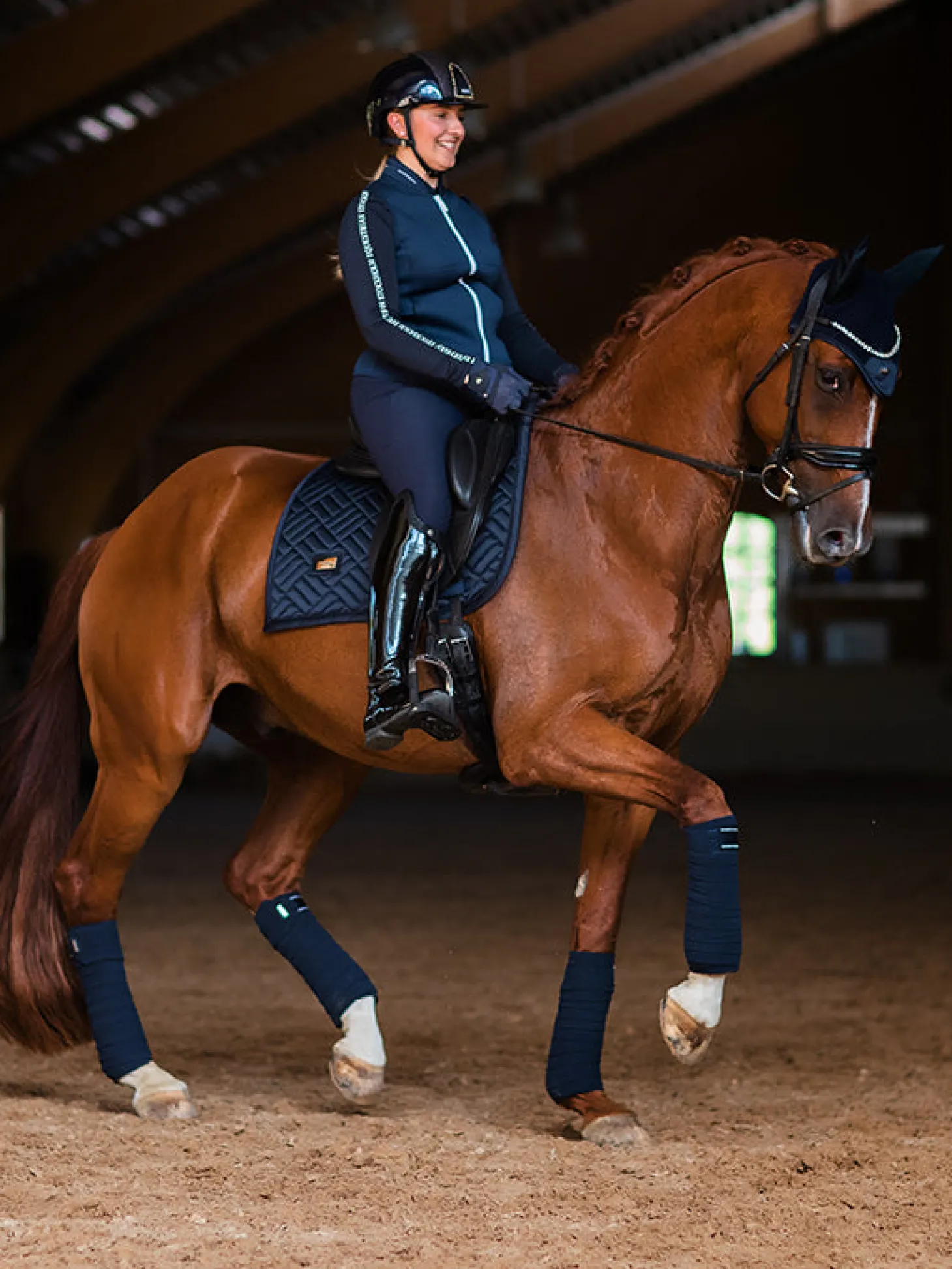 Elegante Schabracke in moderner Labyrint-Steppung in Marineblau mit marineblauen und weißen Details. Optimiert mit einem breiten Silikon Grip Panel auf der Sattelfläche, das Sie stabil während des Rittes hält. Verziert mit dem Equestrian Stockholm Abzeichen in Silber. Das Bambusmaterial ist aufgrund seiner thermoregulierenden Wirkung das ganze Jahr über perfekt – kühlend im Sommer und wärmend im Winter. Außerdem ist es schnelltrocknend, feuchtigkeitsableitend und antibakteriell. Kombinieren Sie die Schabracke mit anderen Teilen aus der Modern Tech Navy Kollektion für einen stilvollen Look von Kopf bis Fuß.
