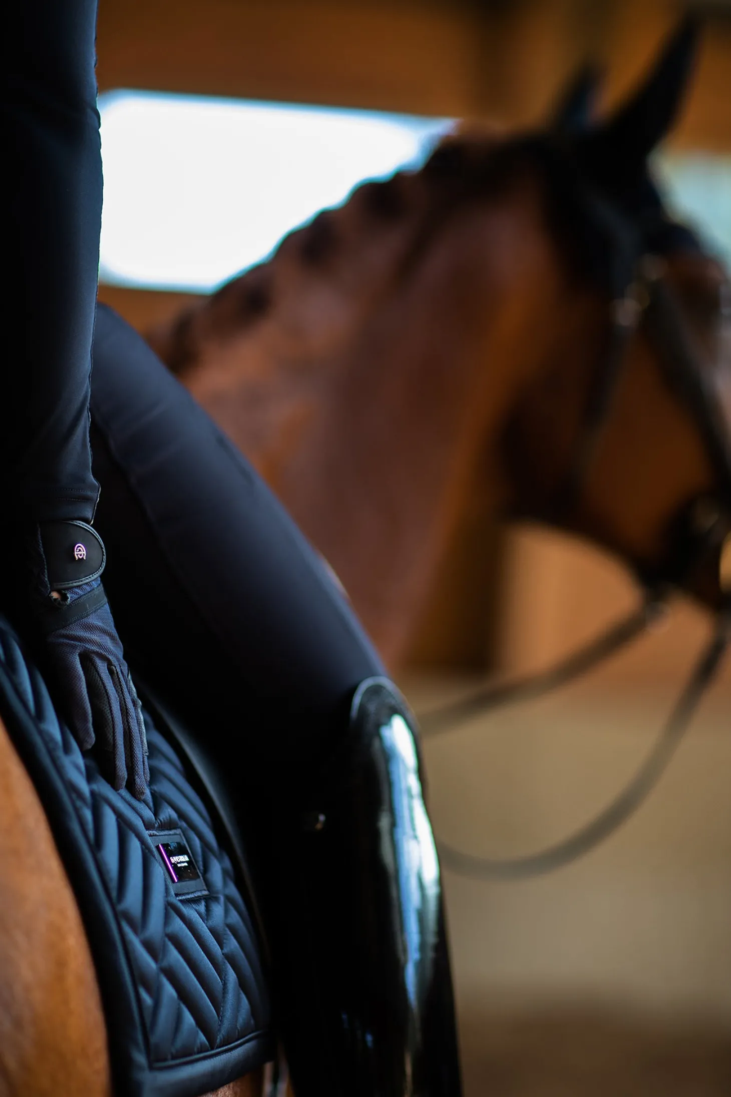 Details: Breites Silikon Grip Panel auf der Sattelfläche in Schwarz / Marineblaues Top Binding mit weißem Equestrian Stockholm Logo / moderne Mabyrinth-Stepung
