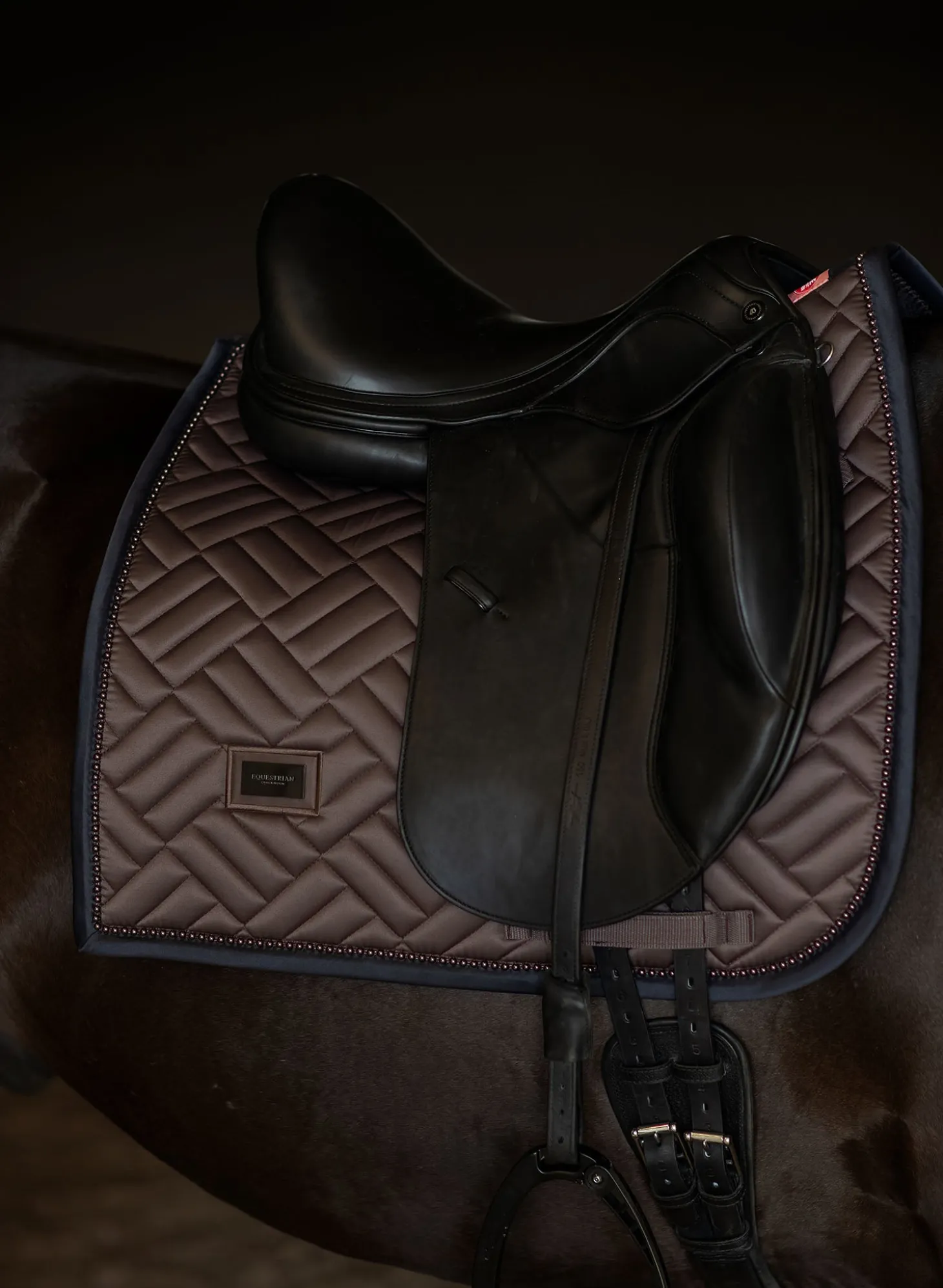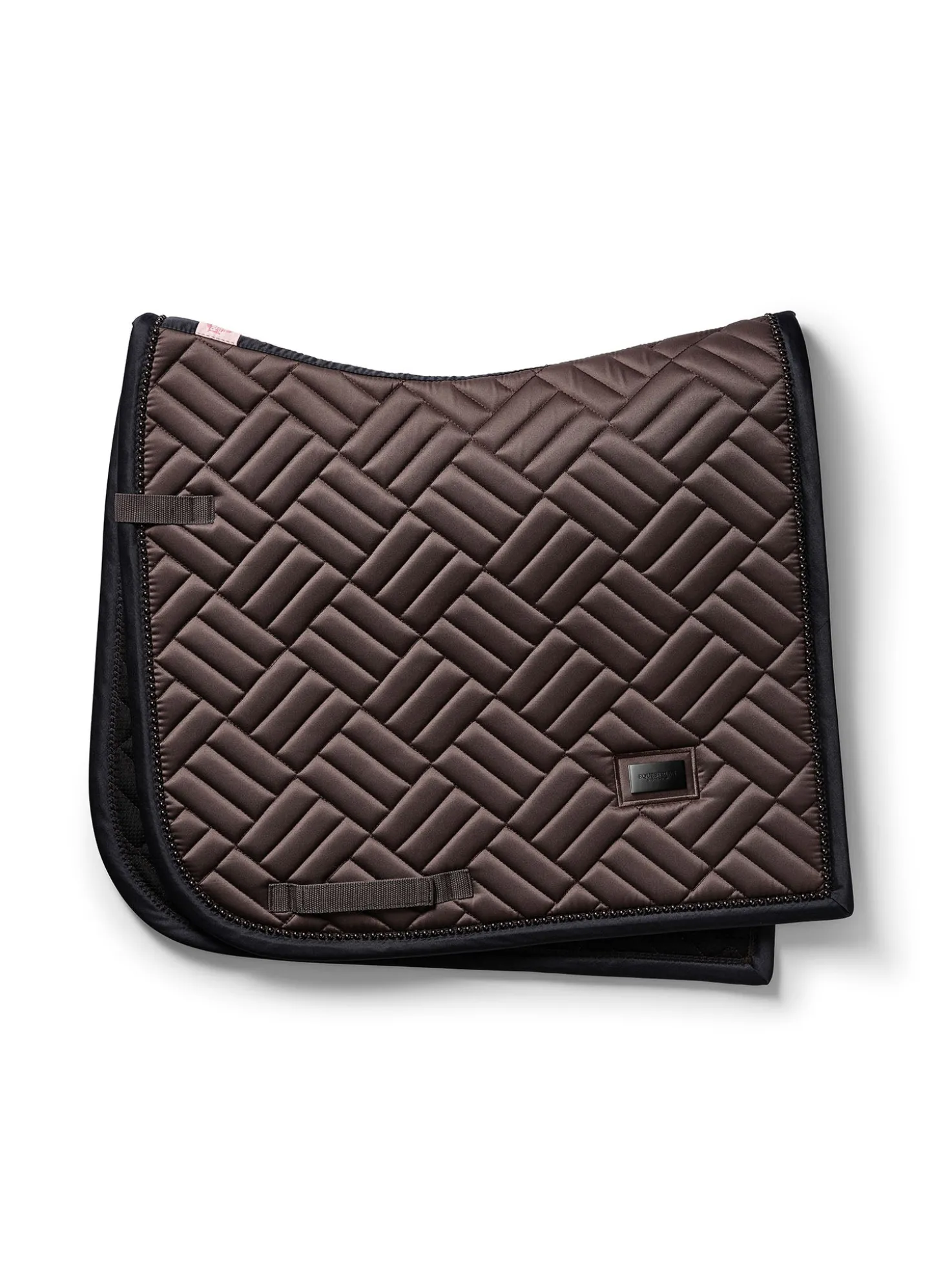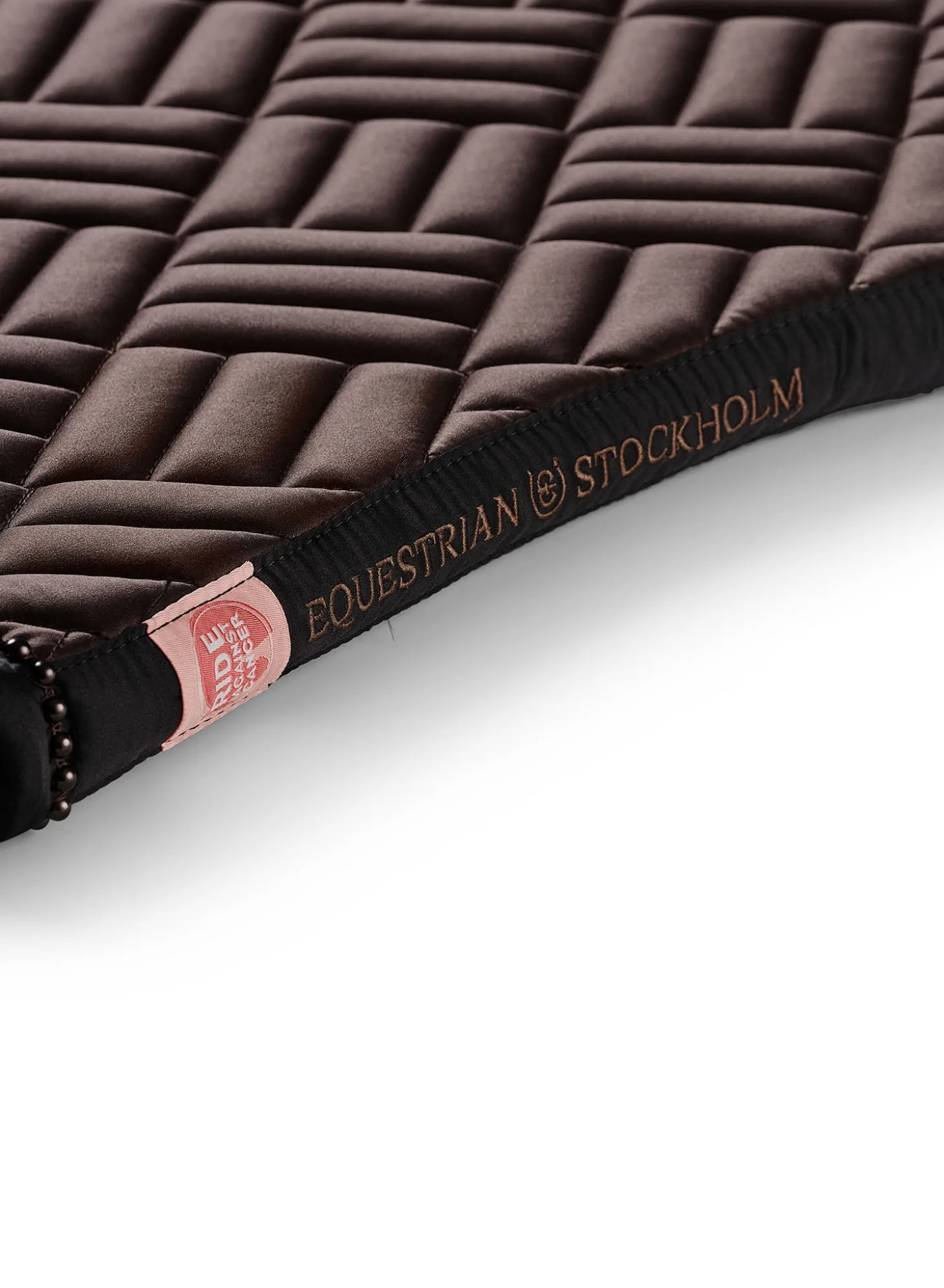 Details: Schwarzer Rand mit mokkabraunem Equestrian Stockholm Logo / Ride against cancer Label / Moderne Steppung / Mokkabraune Perlen