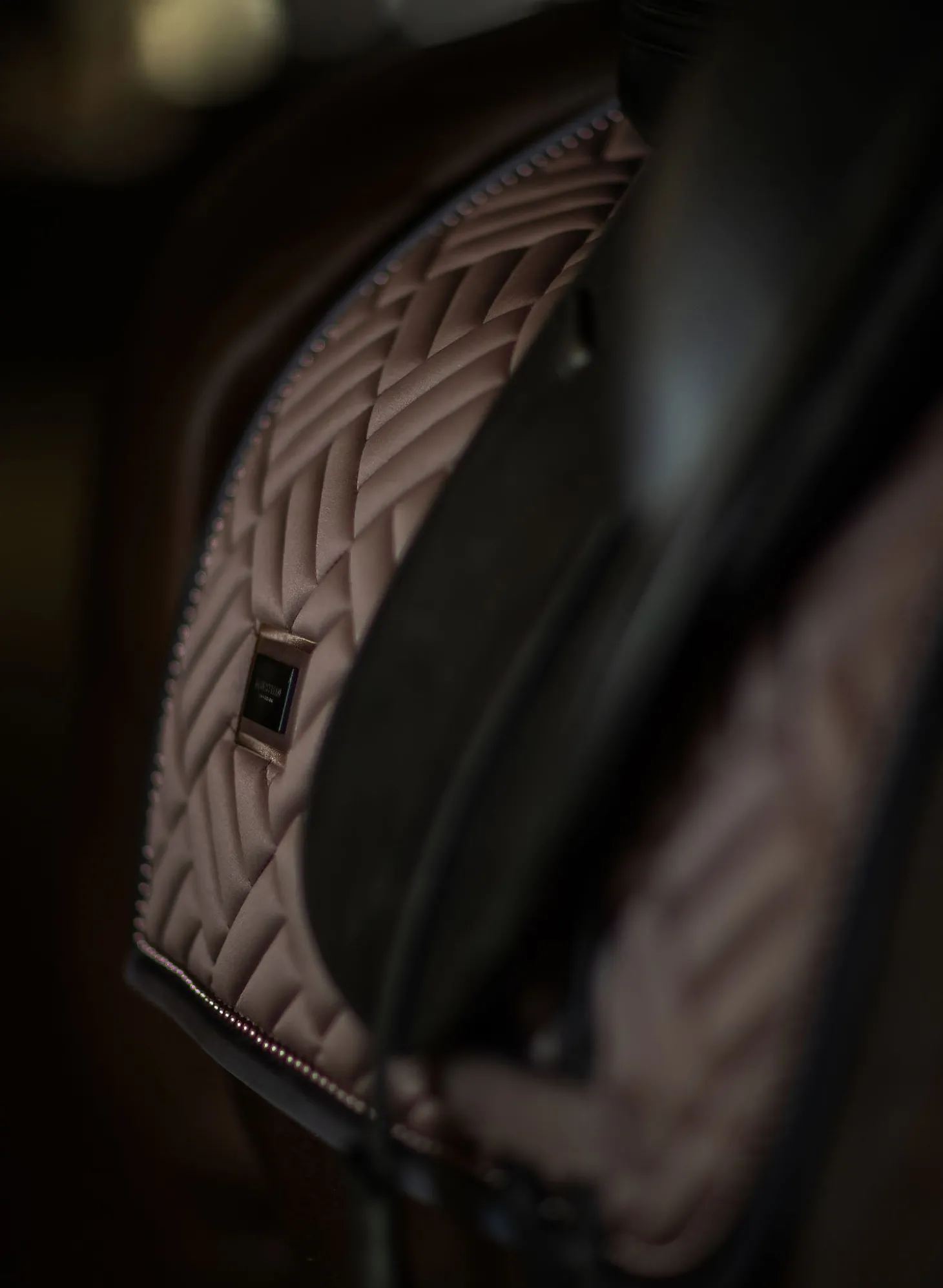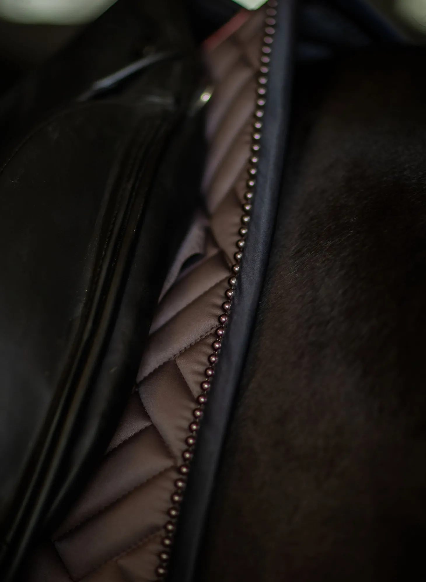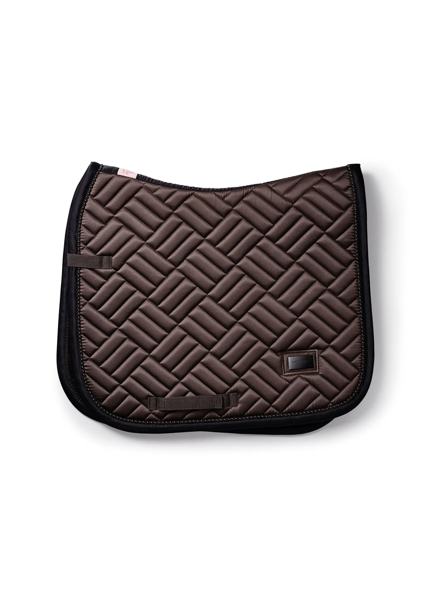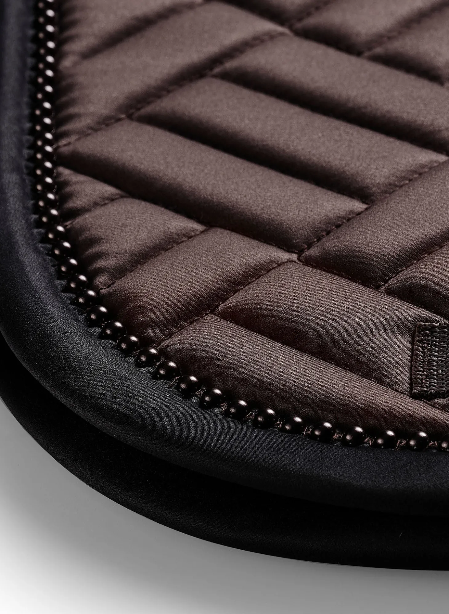Details: Schwarzer Rand mit mokkabraunem Equestrian Stockholm Logo / Ride against cancer Label / Moderne Steppung / Mokkabraune Perlen