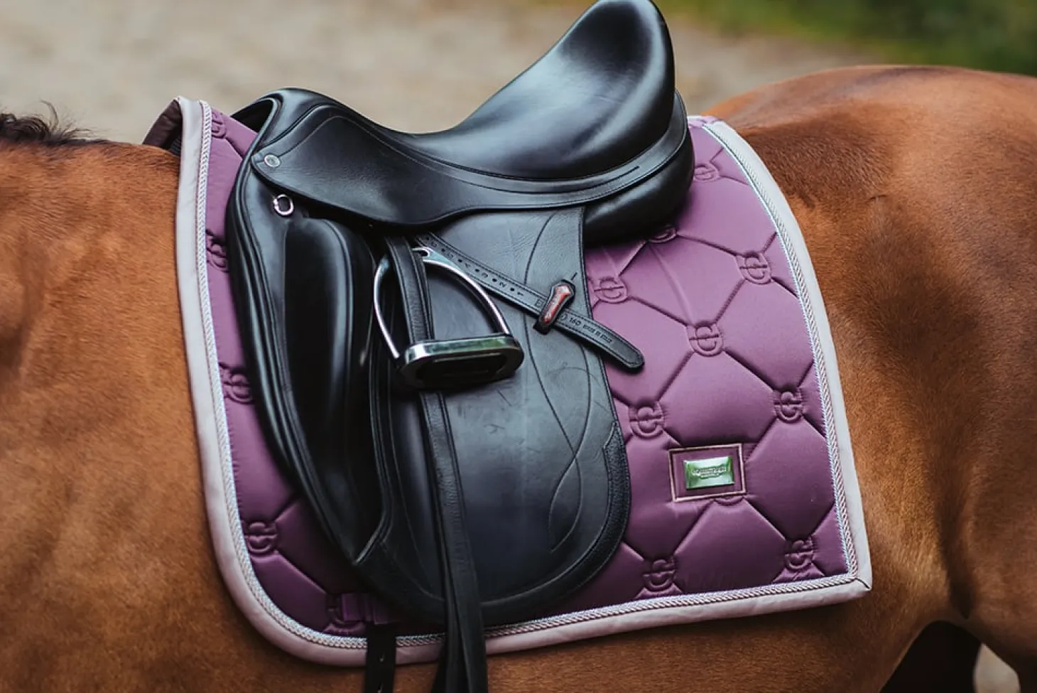 Eine wunderschöne Schabracke in einem romantisch zartem Lila mit fliederfarbigen und silberner Paspelierung. Verziert mit einem stilvollen silbernen Equestrian Stockholm Abzeichen. Bestehend aus einem glänzenden, schmutzabweisenden Material, das gut atmet und Ihr Pferd während der schweißtreibenden Session trocken hält. Die Schabracke ist mit dem Muster von Equestrian Stockholm gesteppt.