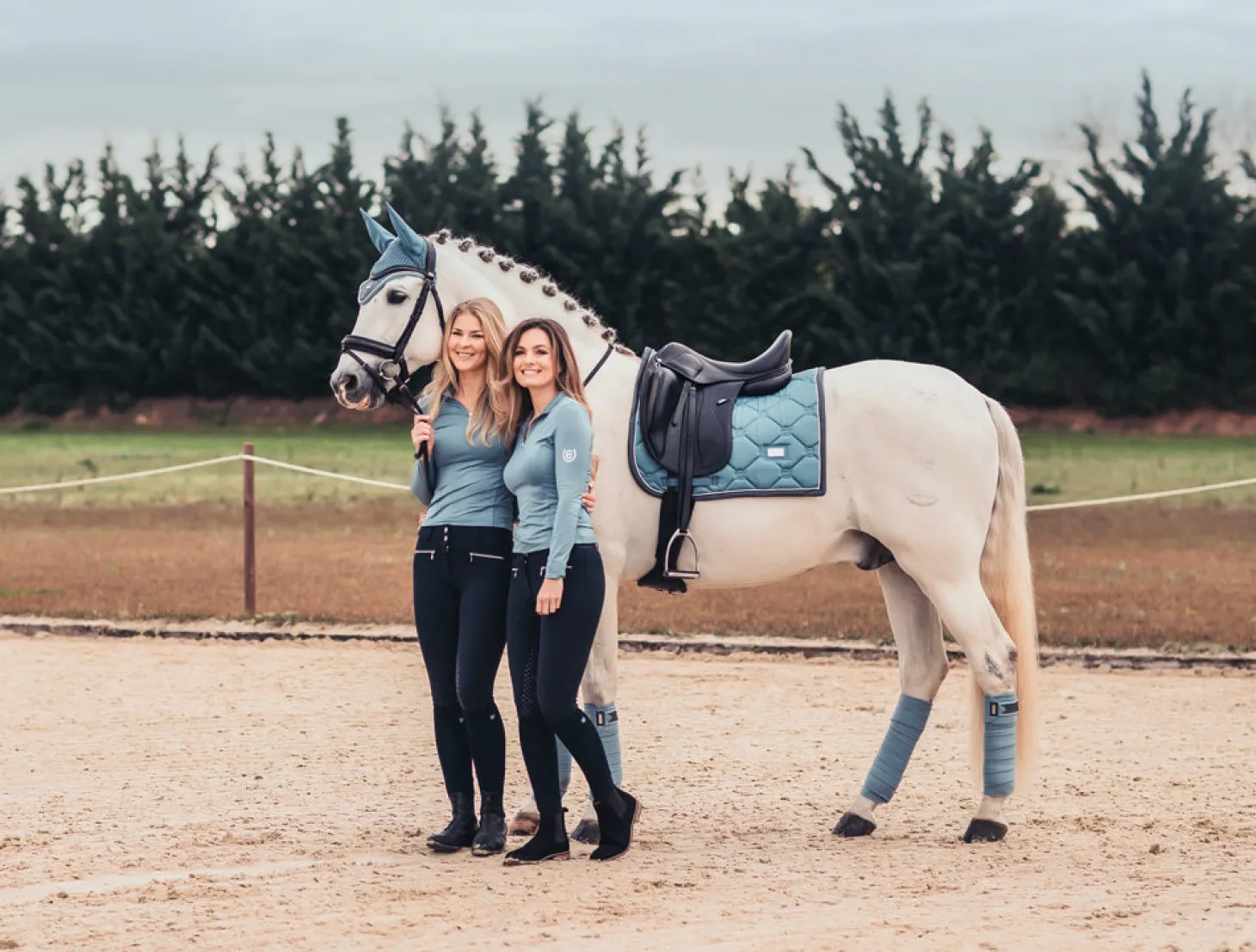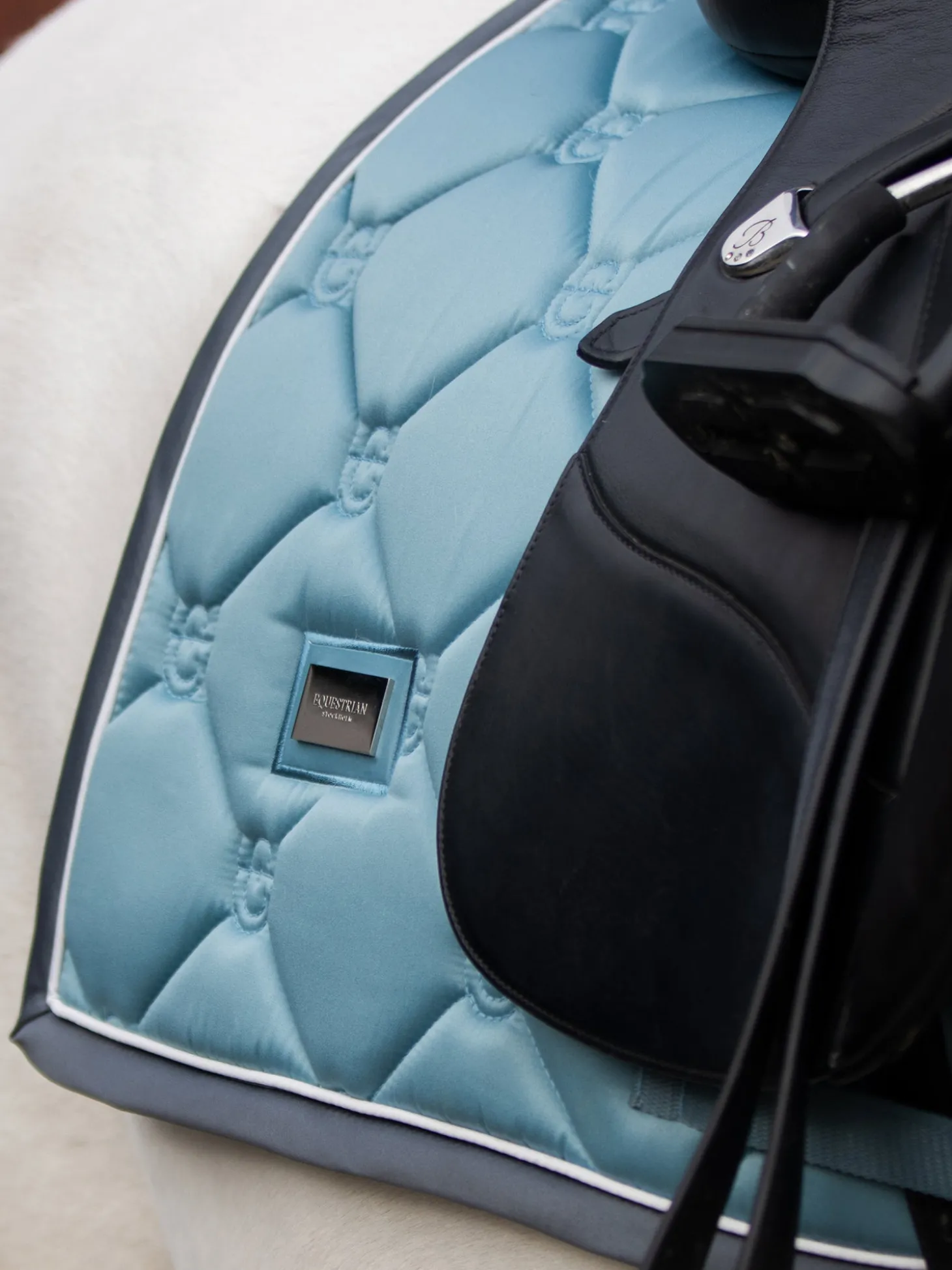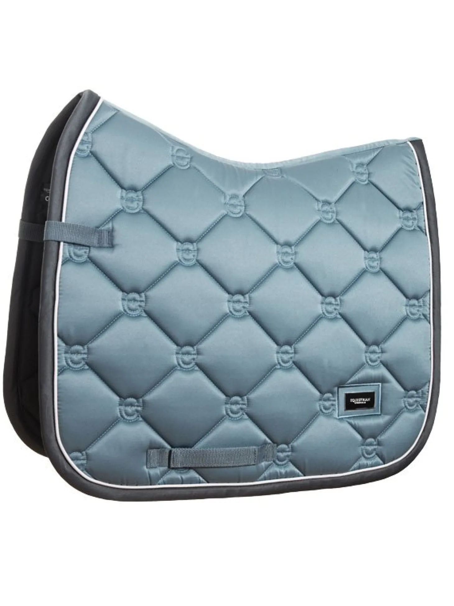 Die wundervolle Dressurschabracke bereitet ein wirklich luxuriöses Gefühl, perfekt für das Training. Hellblau mit einem grau Band und Weiß Kordeln eingefasst. Das Außenmaterial der Schabracke ist glänzend und schmutzabweisend mit schnelltrocknendem Stoff an der Innenseite. Sie passt perfekt zu unseren anderen Produkten der Steel blue Kollektion.