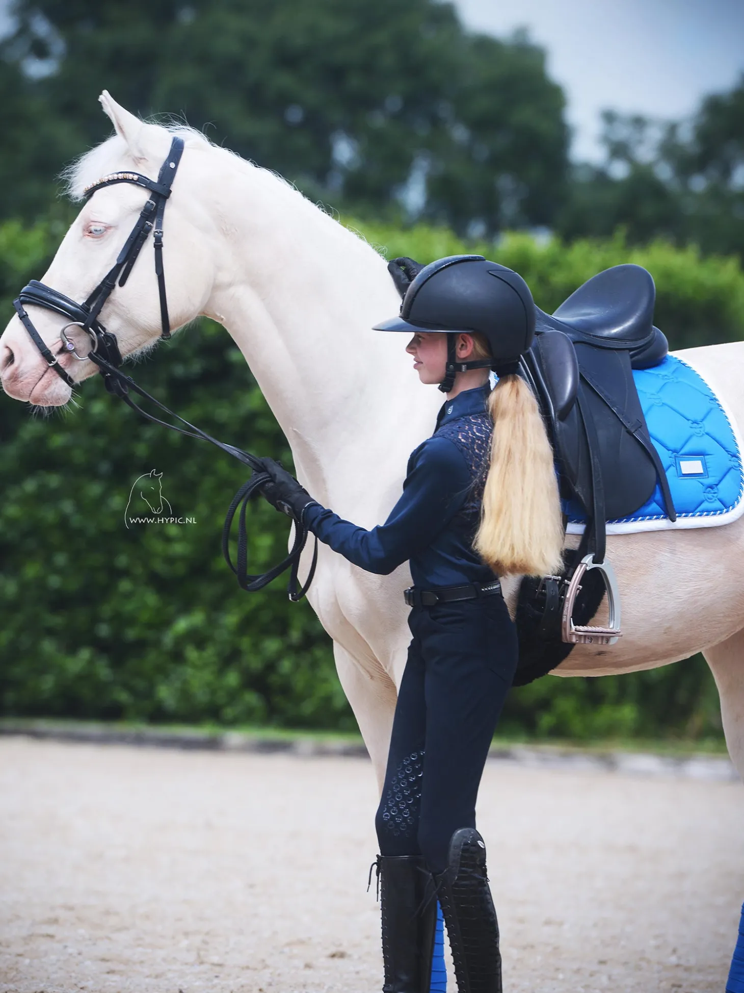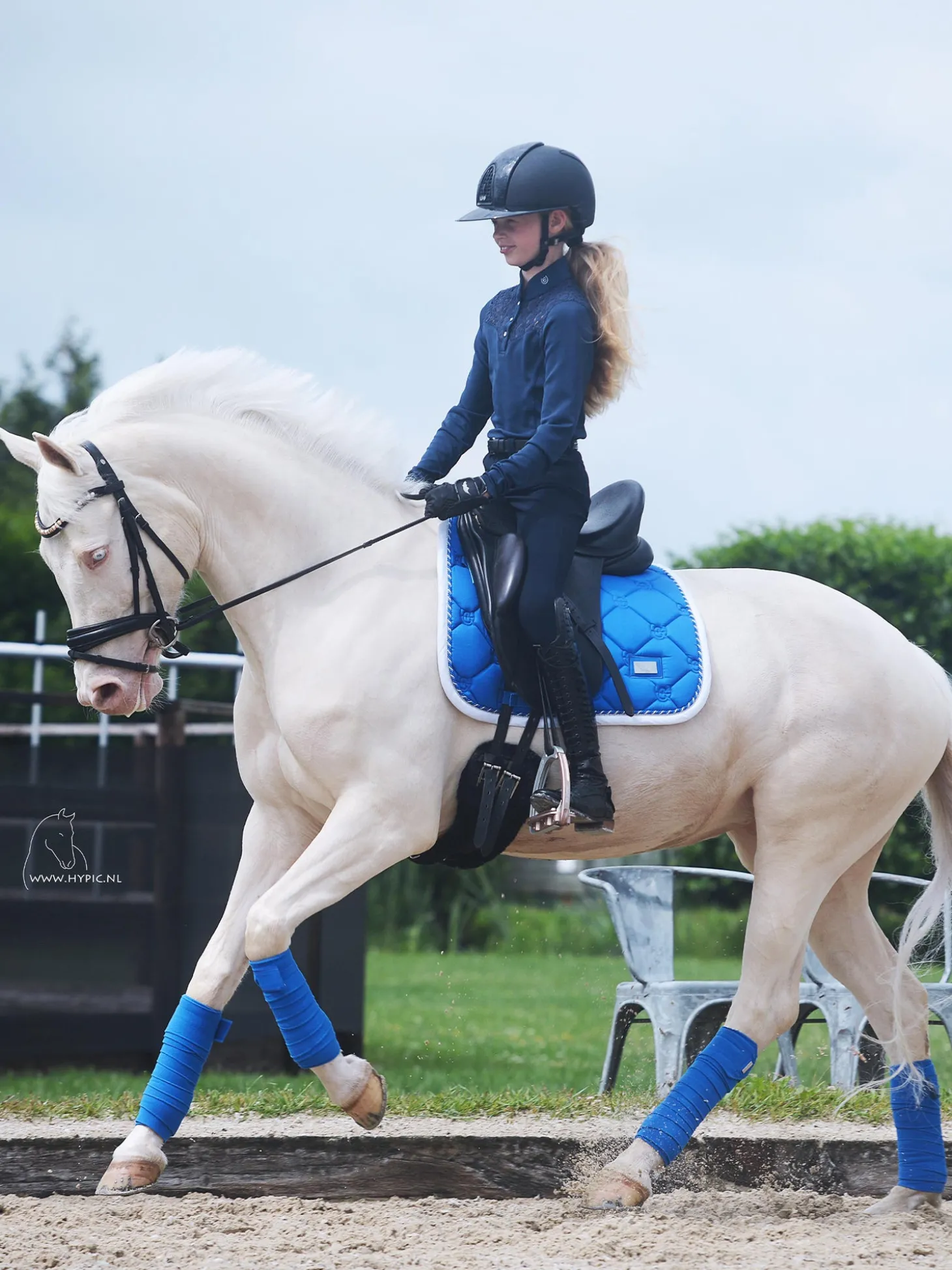 Frische blaue Farbe mit weißer Einfassung und schönen Details in Silber. Gesteppt in Mustern mit dem luxuriösen Logo von Equestrian Stockholm.