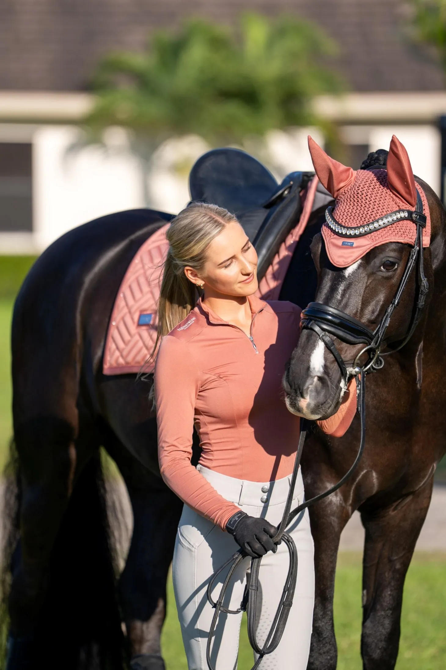 Elegante Schabracke mit moderner Steppung in Korallenrosa mit silbernen Details. Verziert mit dem Equestrian Stockholm Abzeichen in Silber. Das Bambusmaterial ist aufgrund seiner thermoregulierenden Wirkung das ganze Jahr über perfekt – kühlend im Sommer und wärmend im Winter. Außerdem ist es schnelltrocknend, feuchtigkeitsableitend und antibakteriell. Kombinieren Sie die Schabracke mit anderen Teilen aus der Coral Kollektion für einen stilvollen Look von Kopf bis Fuß.
