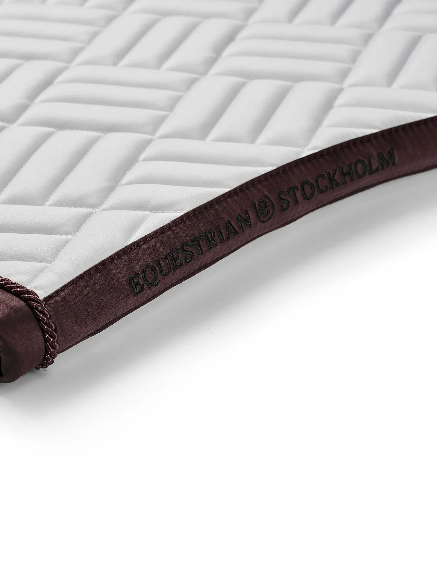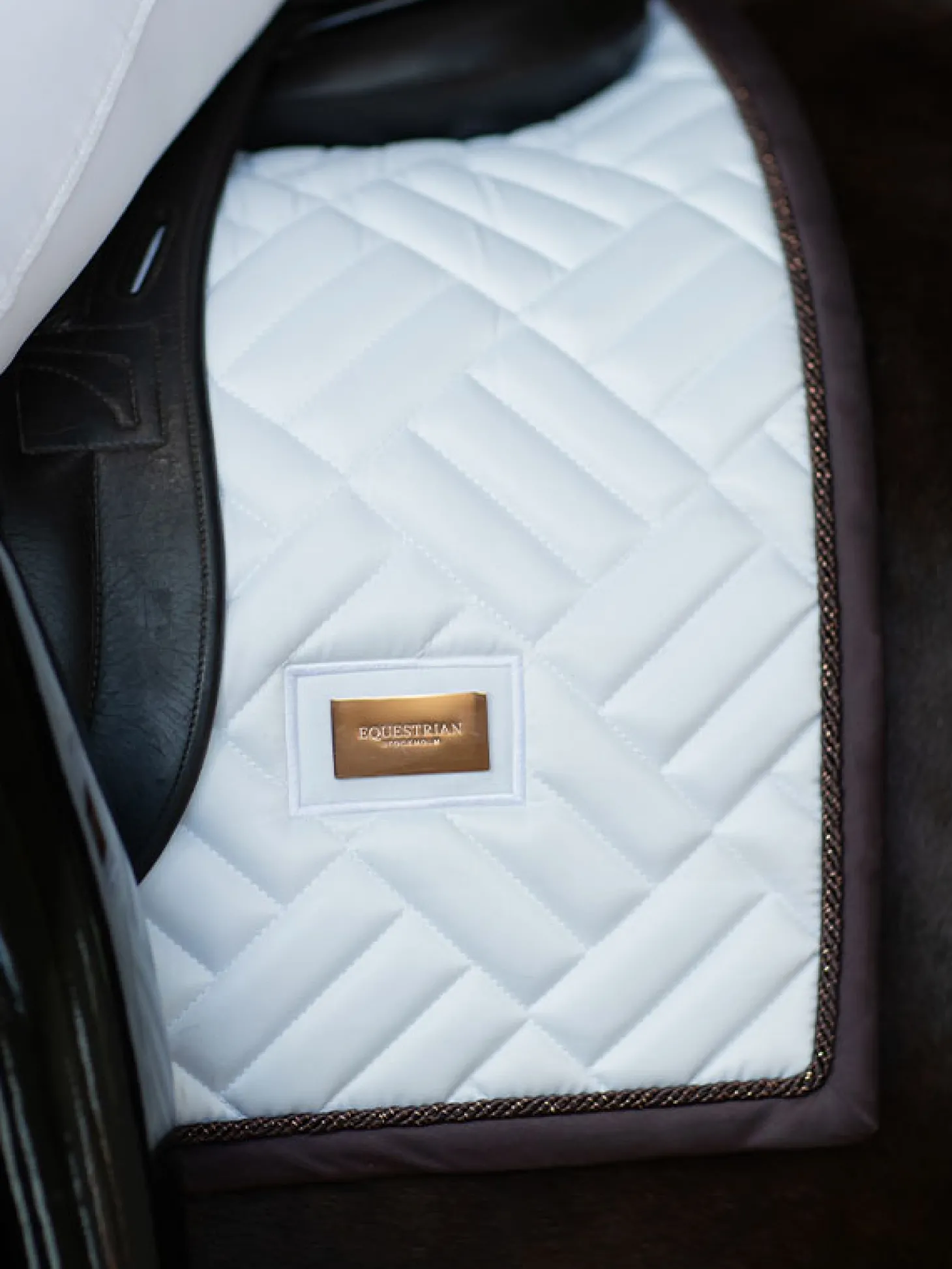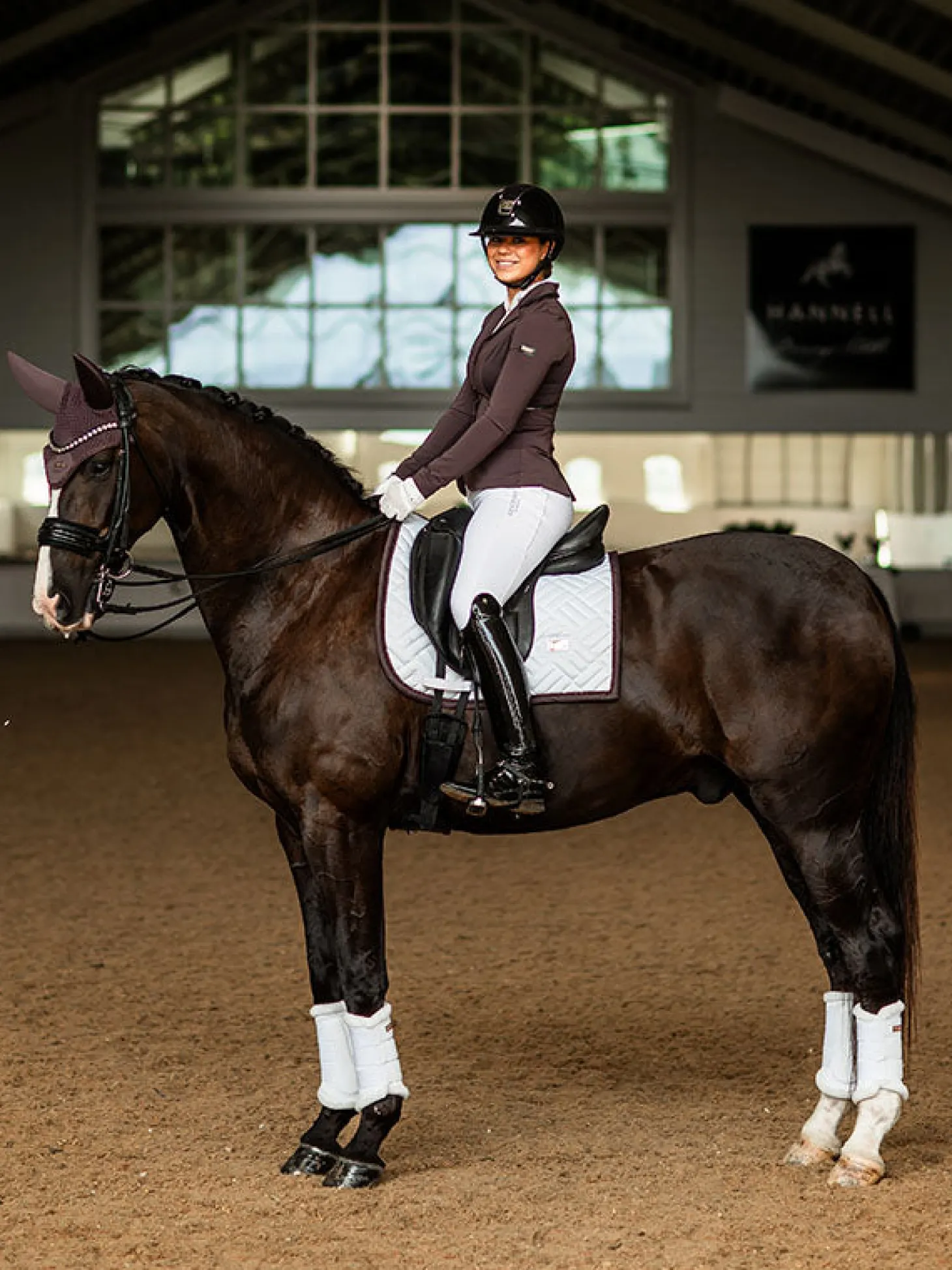 Elegante Schabracke mit moderner Labyrinth Steppung in Weiß mit braun/lila und roségoldenen Details. Verziert mit dem Equestrian Stockholm Abzeichen in Roségold. Das Bambusmaterial ist aufgrund seiner thermoregulierenden Wirkung das ganze Jahr über perfekt – kühlend im Sommer und wärmend im Winter. Außerdem ist es schnelltrocknend, feuchtigkeitsableitend und antibakteriell. Kombinieren Sie die Schabracke mit anderen Teilen aus der Moonless Night Kollektion für einen stilvollen Look von Kopf bis Fuß.