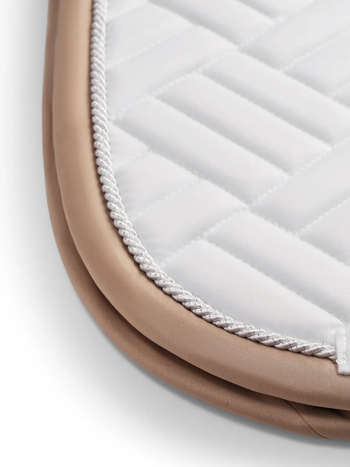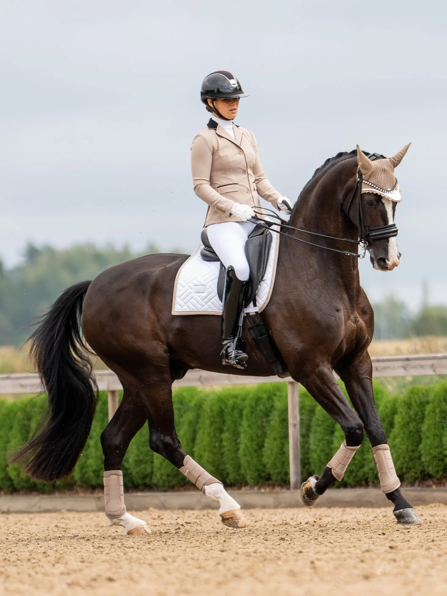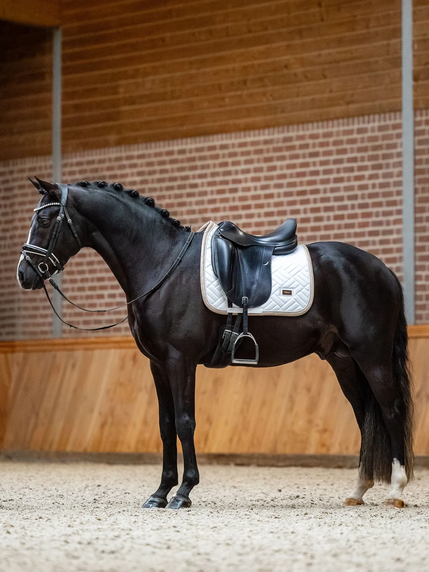 Elegante Schabracke mit moderner Steppung in Weiß mit silbernen und beigen Details. Verziert mit dem Equestrian Stockholm-Emblem in Silber. Das Bambusmaterial ist aufgrund seiner thermoregulierenden Wirkung das ganze Jahr über perfekt geeignet – es kühlt im Sommer und wärmt im Winter. Außerdem ist es schnell trocknend, Feuchtigkeit ableitend und antibakteriell. Kombinieren Sie die Schabracke mit anderen Artikeln aus der Sand Kollektion für einen stilvollen Look von Kopf bis Fuß.