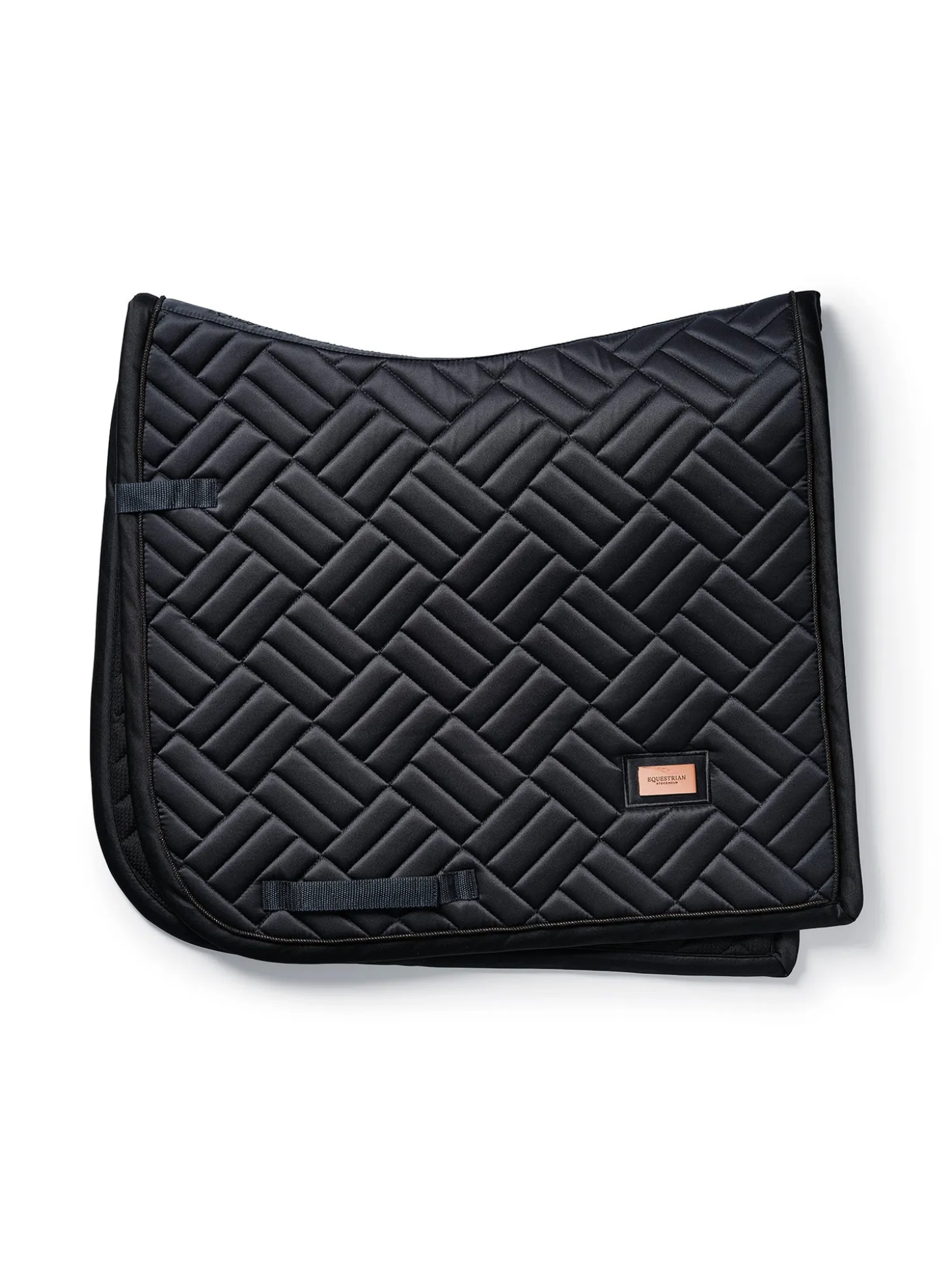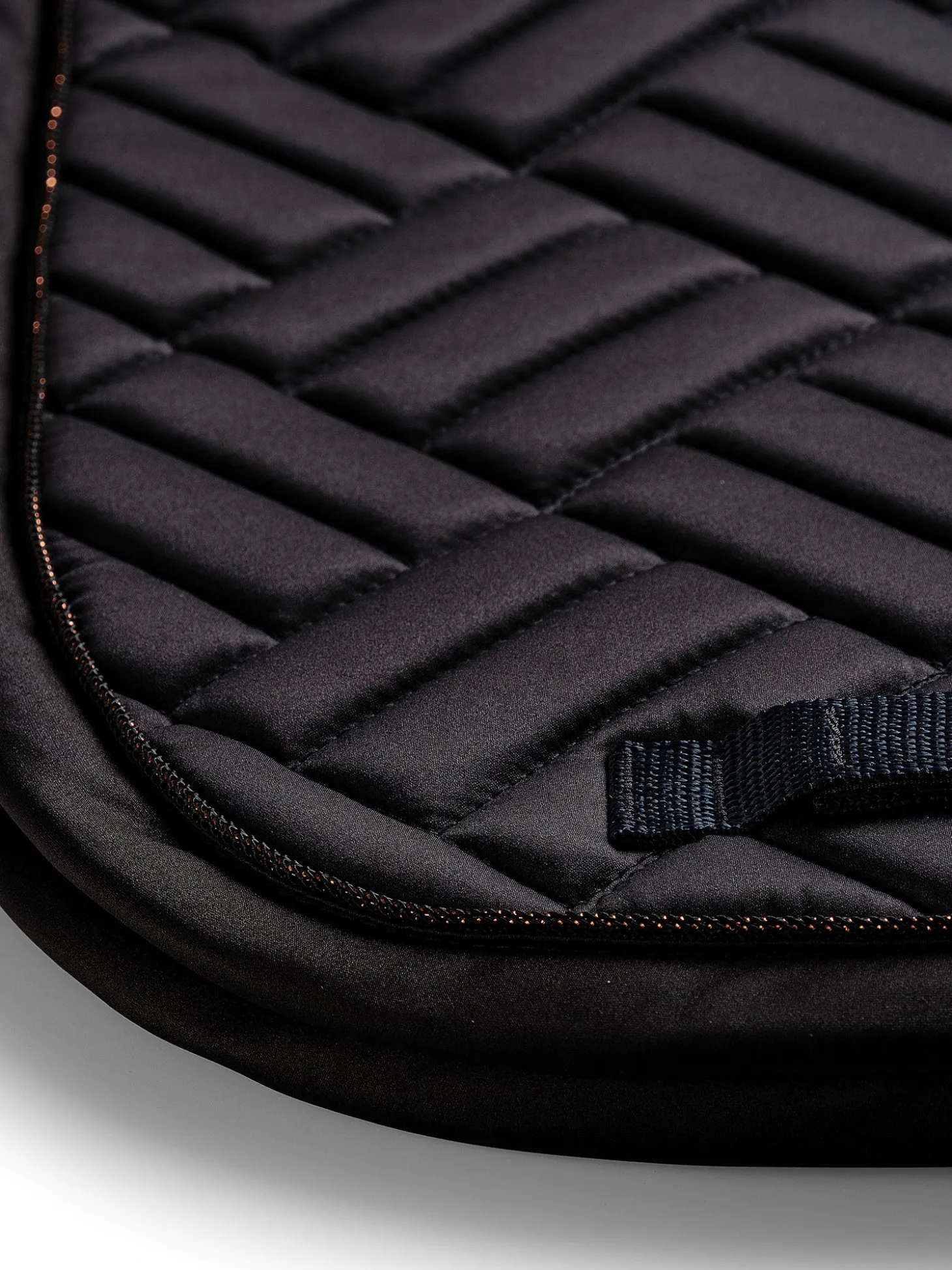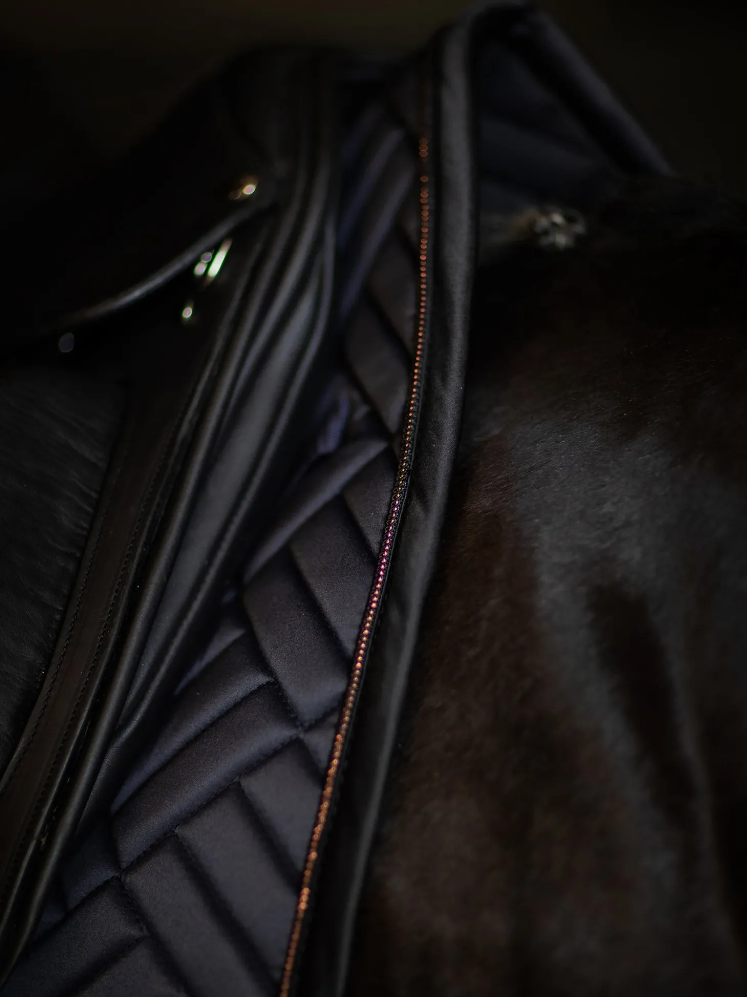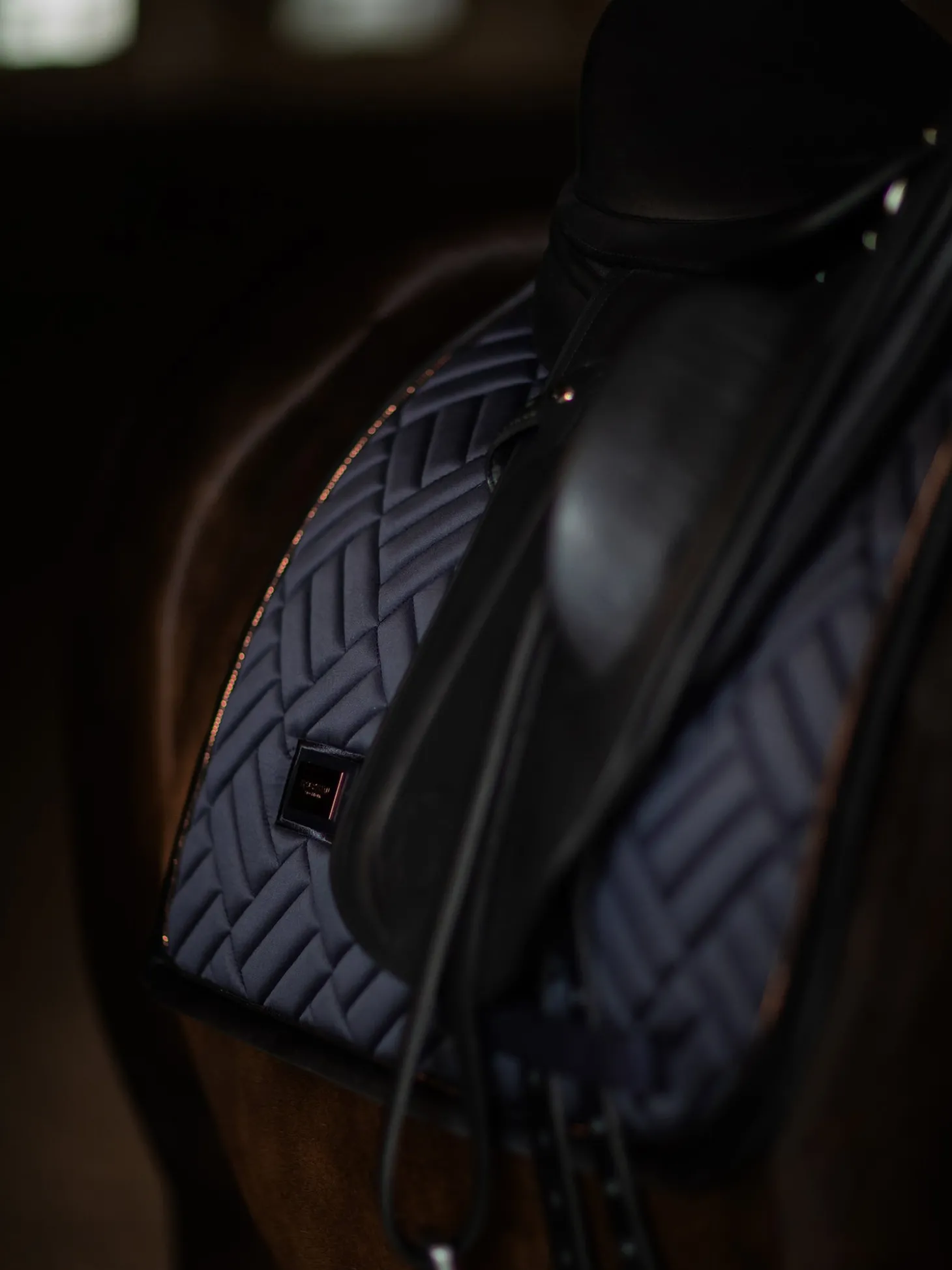 Elegante Schabracke mit moderner Steppung in dunklem Ozeanblau mit schwarzen und roségoldenen Details. Verziert mit dem Equestrian Stockholm Abzeichen in Roségold. Das Bambusmaterial ist aufgrund seiner thermoregulierenden Wirkung das ganze Jahr über perfekt – kühlend im Sommer und wärmend im Winter. Außerdem ist es schnelltrocknend, feuchtigkeitsableitend und antibakteriell.