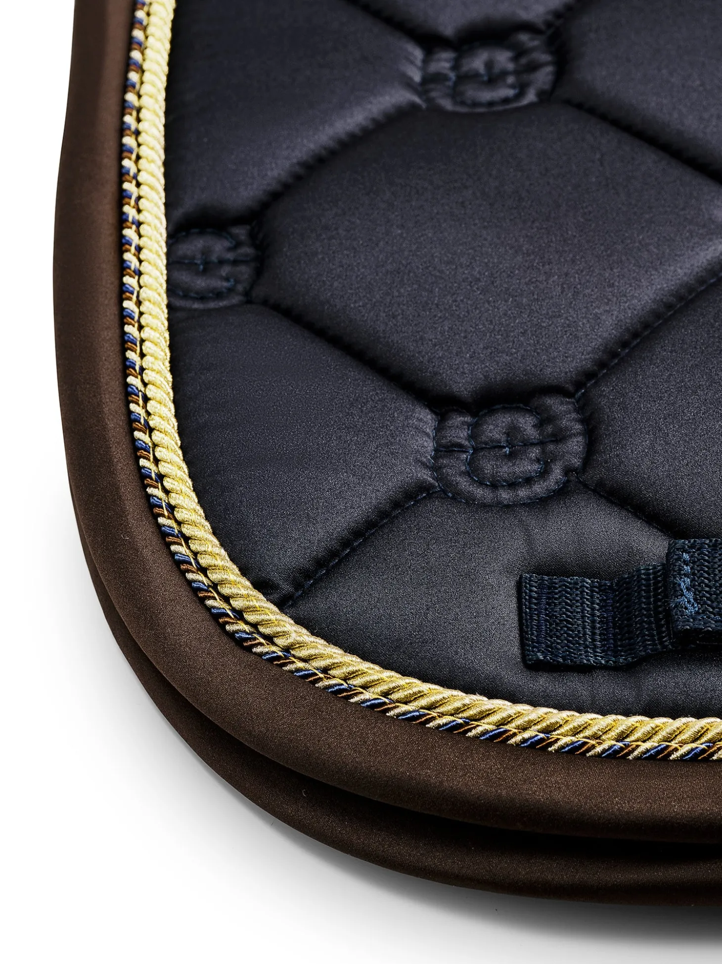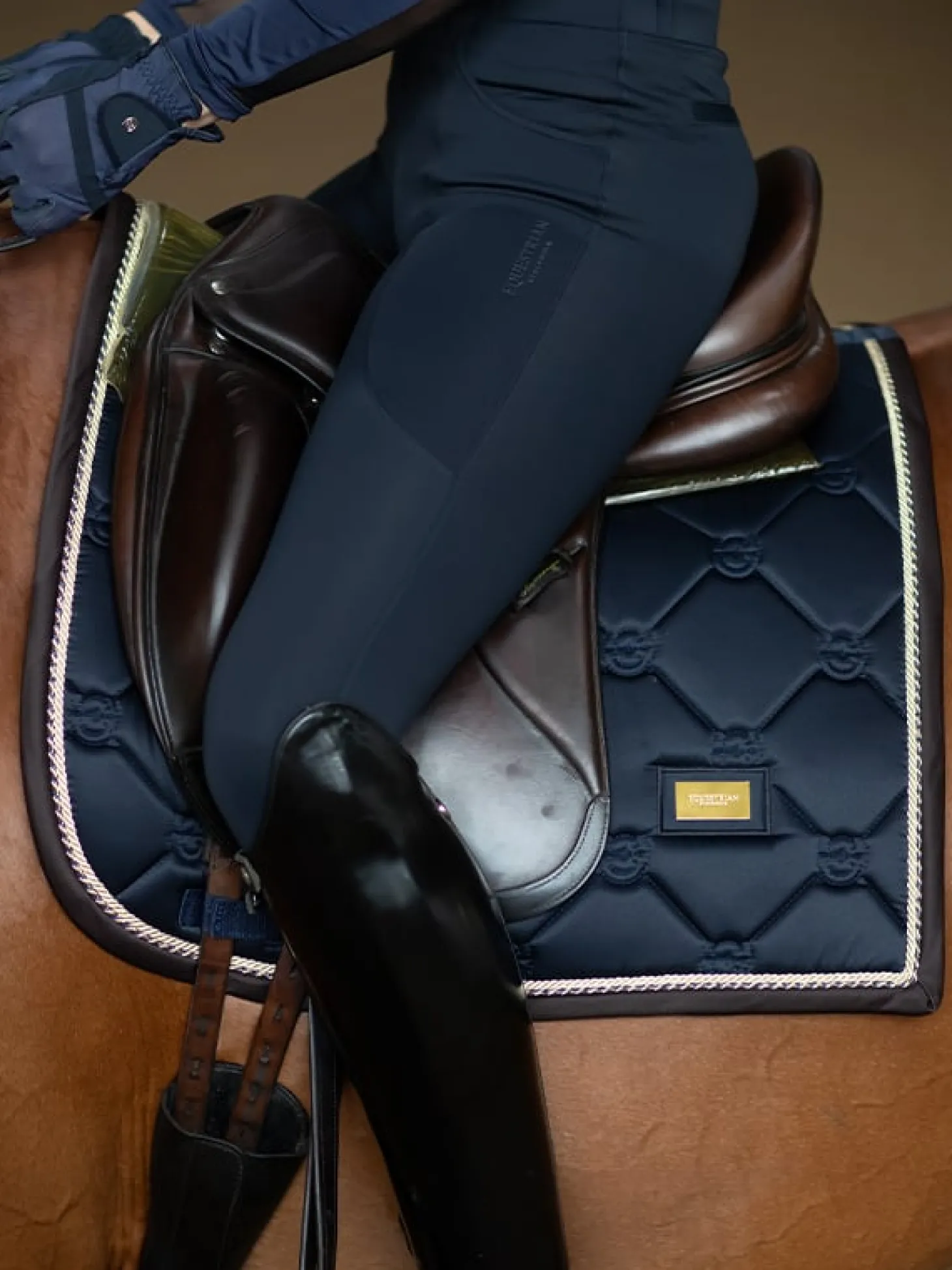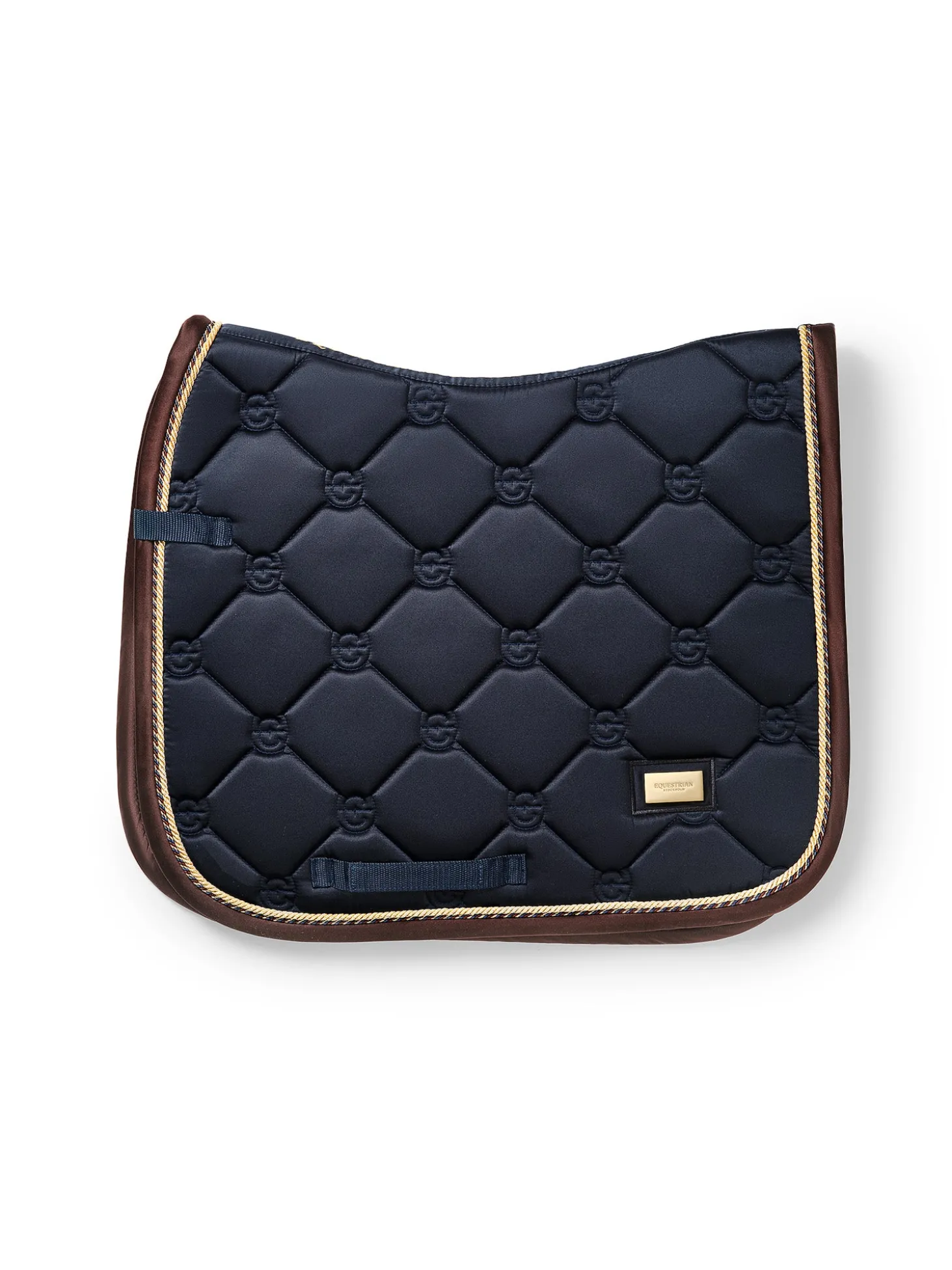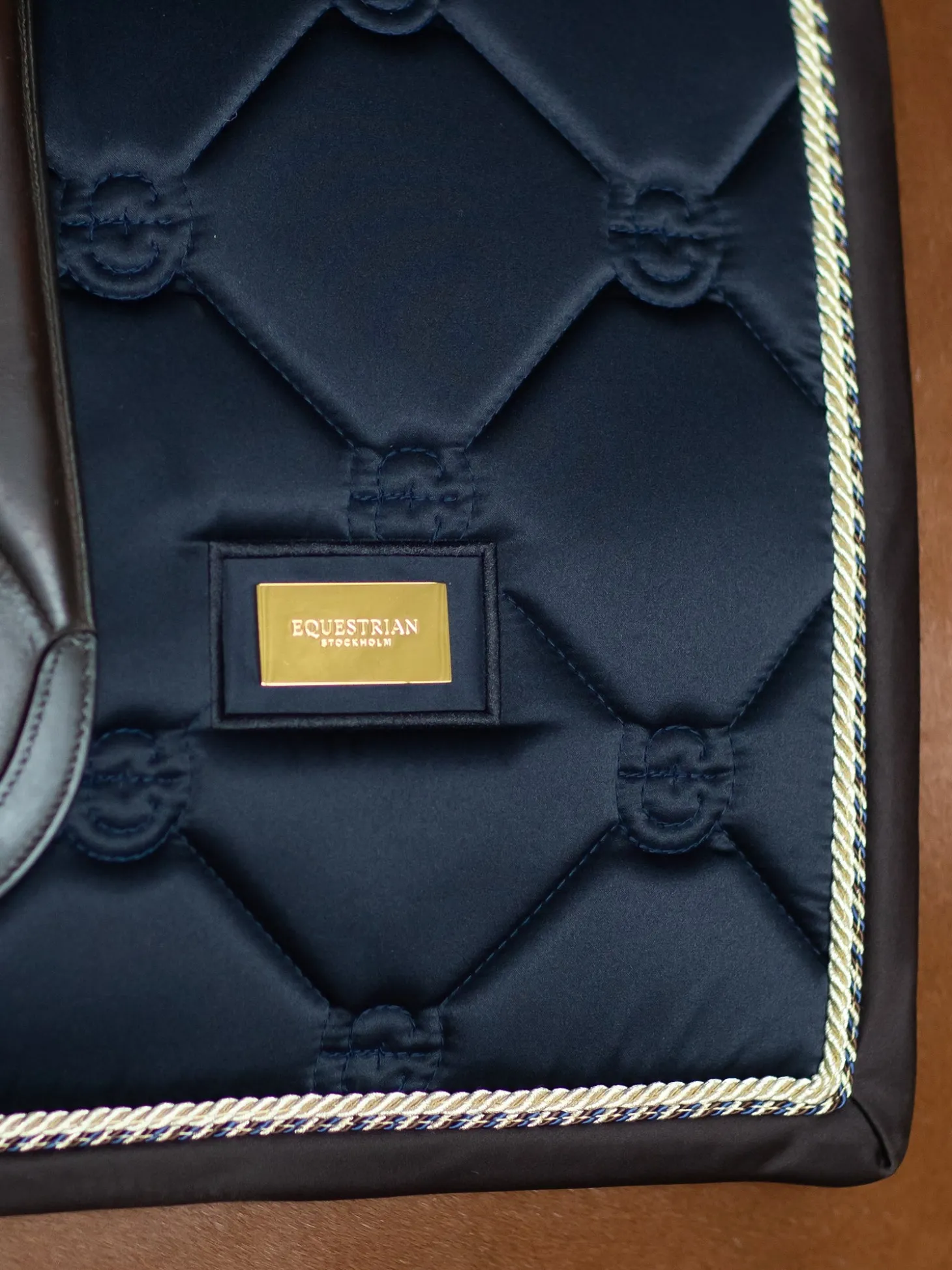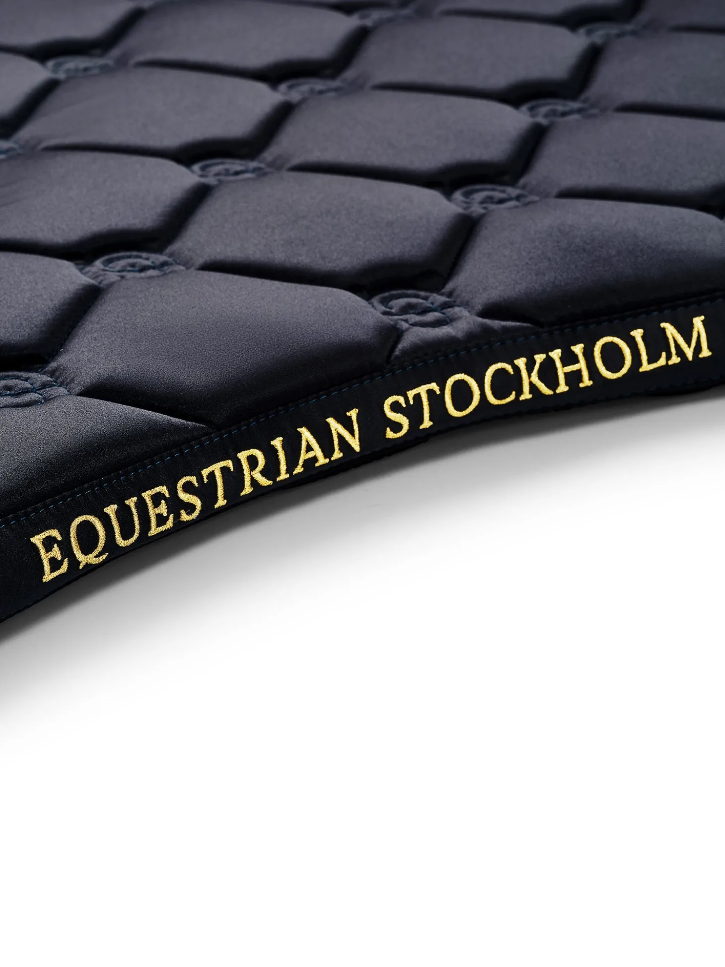 Die hochwertige Dressurschabracke in Shiny Navy ist ideal für das Training. Das Material der Schabracke ist glänzend und schmutzabweisend und hat schöne goldfarbene Details und ein Muster mit dem Logo von Equestrian Stockholm.