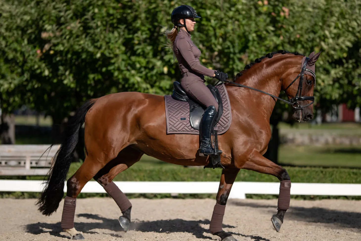 Hochwertige Fleece-Bandagen in einem stilvollen Braun mit einem Hauch von Lila. Verziert mit Ton-in-Ton-Satin-Details und einem Equestrian Stockholm-Abzeichen in Chrom. Kombinieren Sie die Bandagen mit der Schabracke und der Fliegenhaube aus der Amaranth-Kollektion, um einen glamourösen Look zu kreieren. Verkauft im Viererset