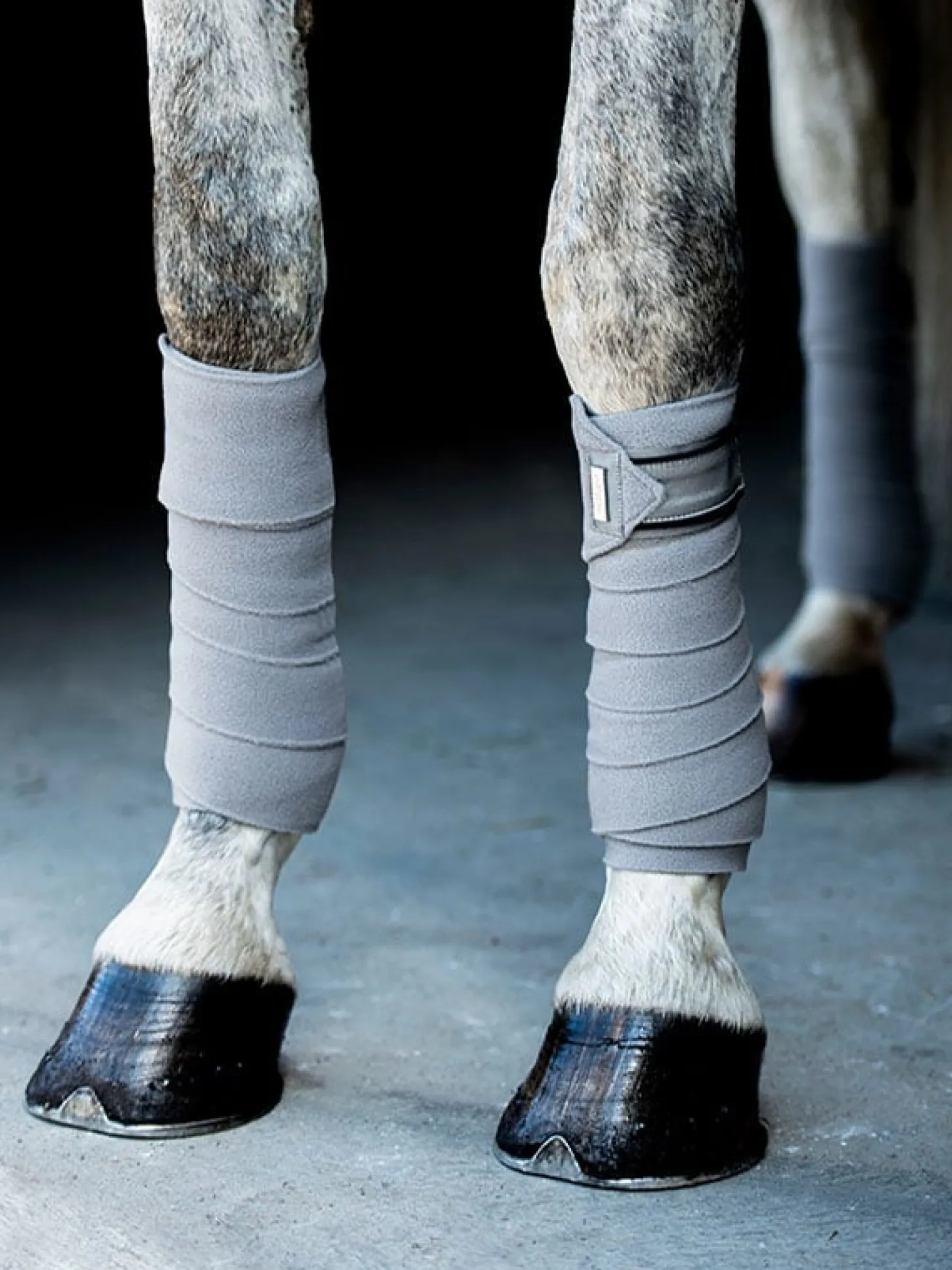 Luxuriöse, weiche Bandagen aus grauem Vlies mit feinen Details in Silber und Blau. Kombinieren Sie die Bandagen mit der Schabracke und einer Fliegenhaube für den perfekten Look. Wird als Vierer- Set verkauft.