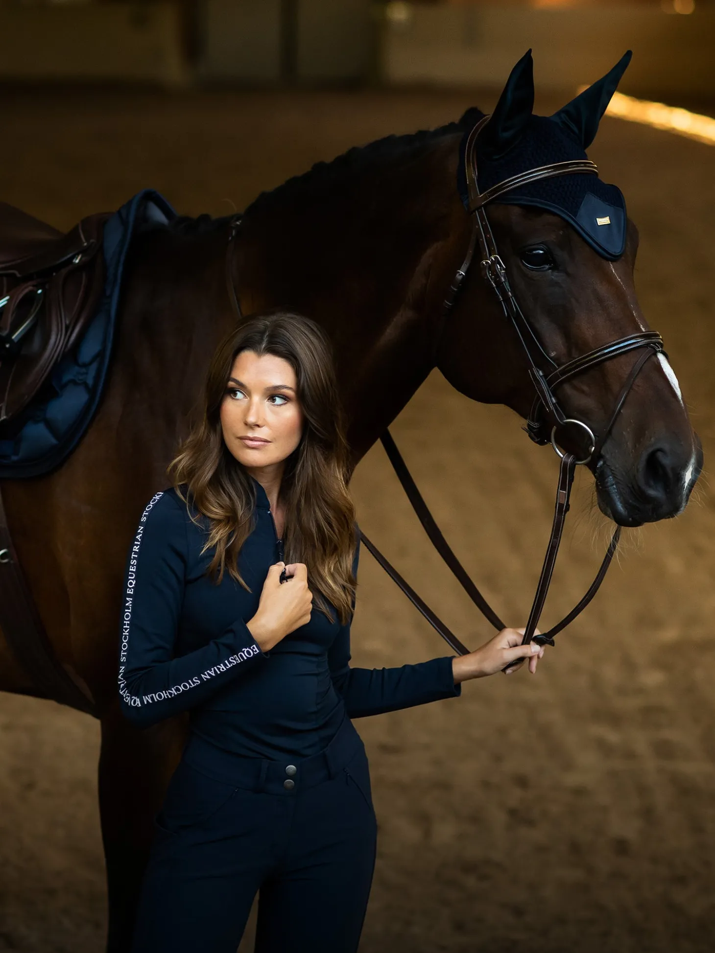 Luxuriöse gehäkelte Fliegenhaube in stilvollem Marineblau. Verziert mit einem marineblauen Satinaufnäher auf der Vorderseite, schönen weichen marineblauen Paspeln und einem Equestrian Stockholm Abzeichen in Silber. Die Fliegenhaube bietet sowohl Insektenschutz als auch Geräuschdämmung. Der elastische Stoff an den Ohren sorgt für zusätzlichen Komfort. Perfekt passend zu der Schabracke aus der Modern Tech Navy Kollektion.