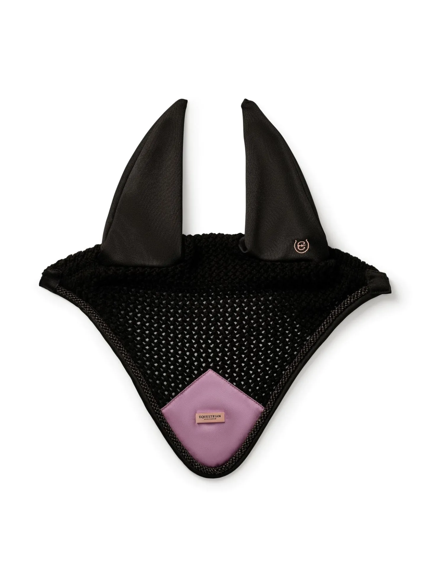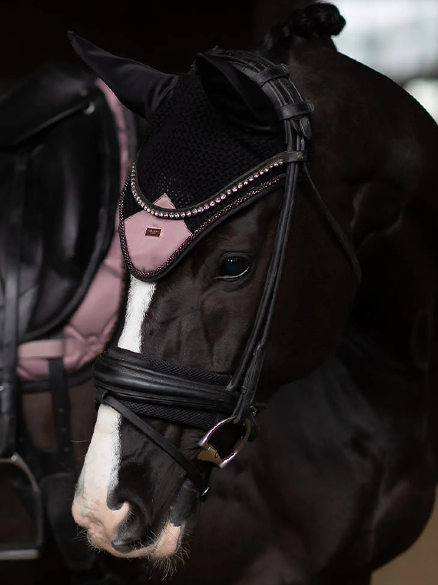 Luxuriöse gehäkelte Fliegenhaube in elegantem Rosa. Verziert mit einem rosafarbenen Satinaufnäher auf der Vorderseite, schönen Paspeln und der Randeinfassung in Schwarz. Gestylt mit dem Equestrian Stockholm Abzeichen in Roségold. Die Fliegenhaube bietet sowohl Insektenschutz als auch Geräuschdämmung. Sie hat einen elastischen Stoff an den Ohren für zusätzlichen Komfort. Die Fliegenhaube passt perfekt zu der Schabracke aus der Anemone Kollektion.