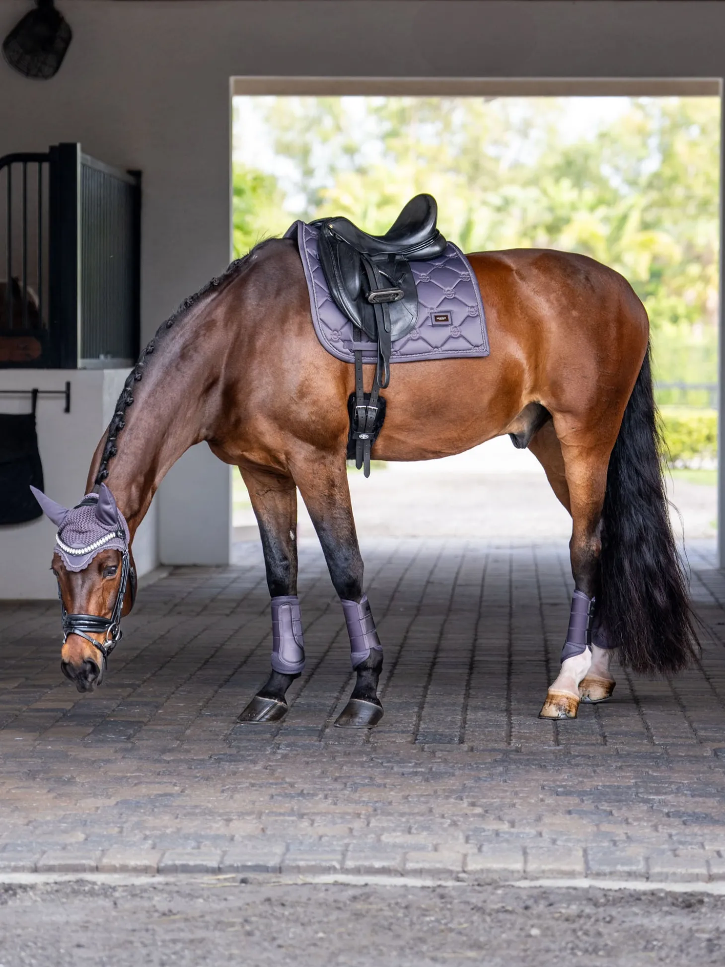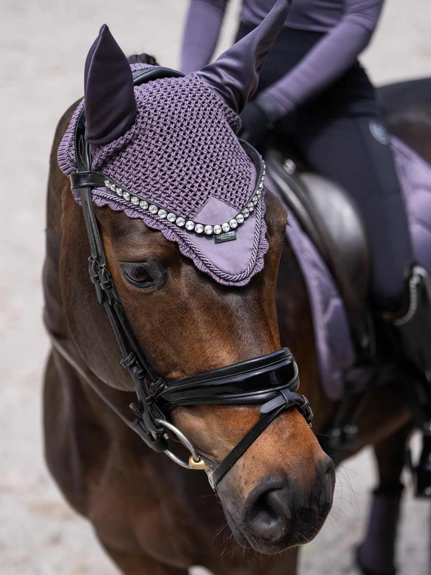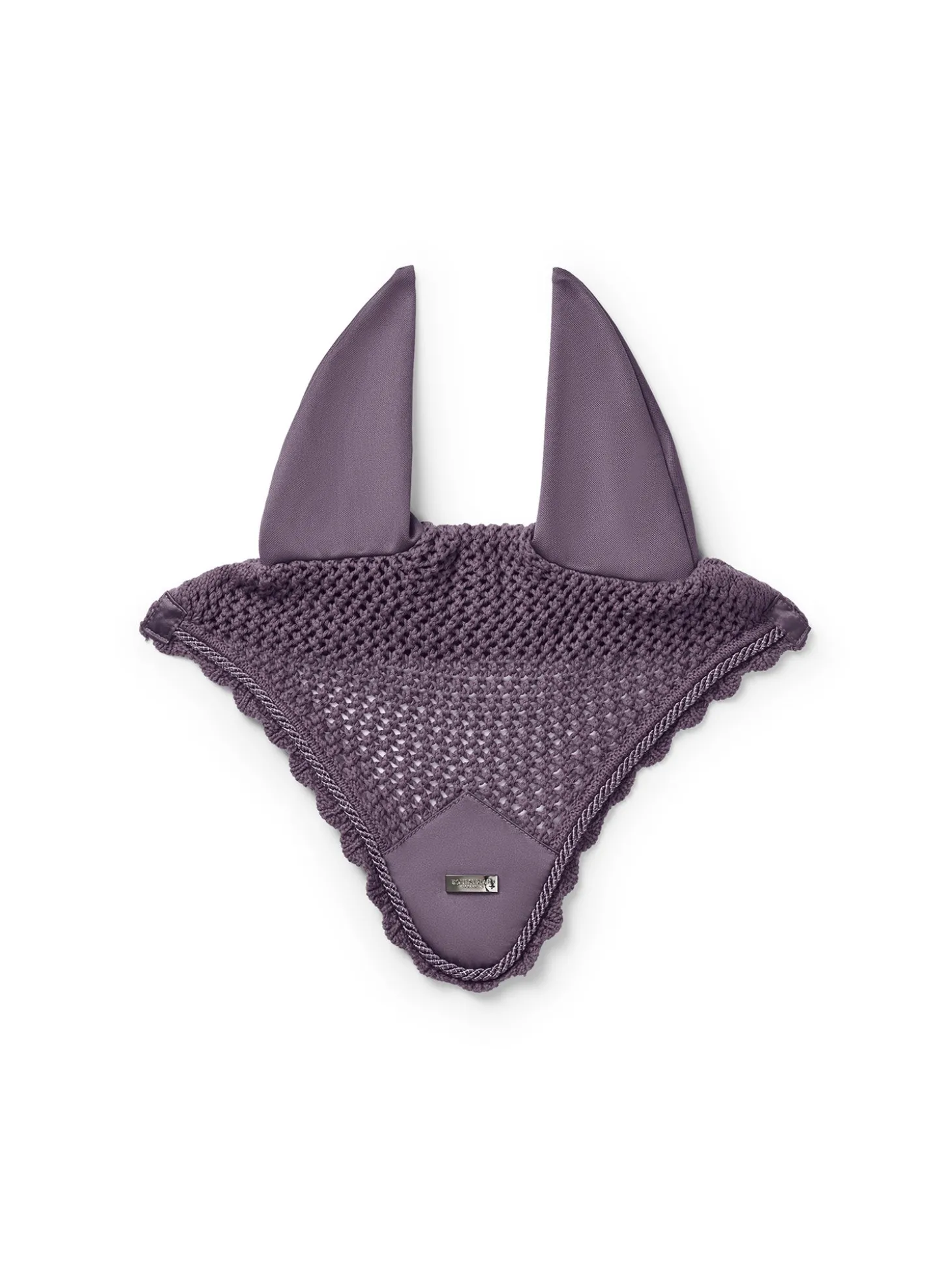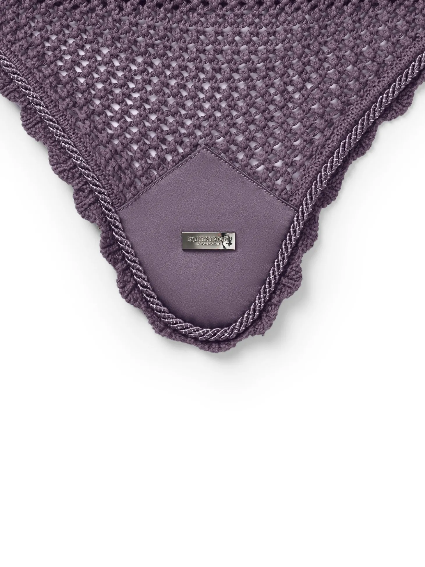 Luxuriöse gehäkelte Fliegenhaube in einem stilvollen dunklen Violett. Verziert mit einem Ton-in-Ton-Satinaufnäher auf der Vorderseite, einer schönen dunkelvioletten Paspelierung und einem Equestrian Stockholm Abzeichen in Silber. Die Fliegenhaube bietet sowohl Schutz vor Insekten als auch Geräuschreduzierung und verfügt über einen elastischen Stoff an den Ohren für zusätzlichen Komfort.