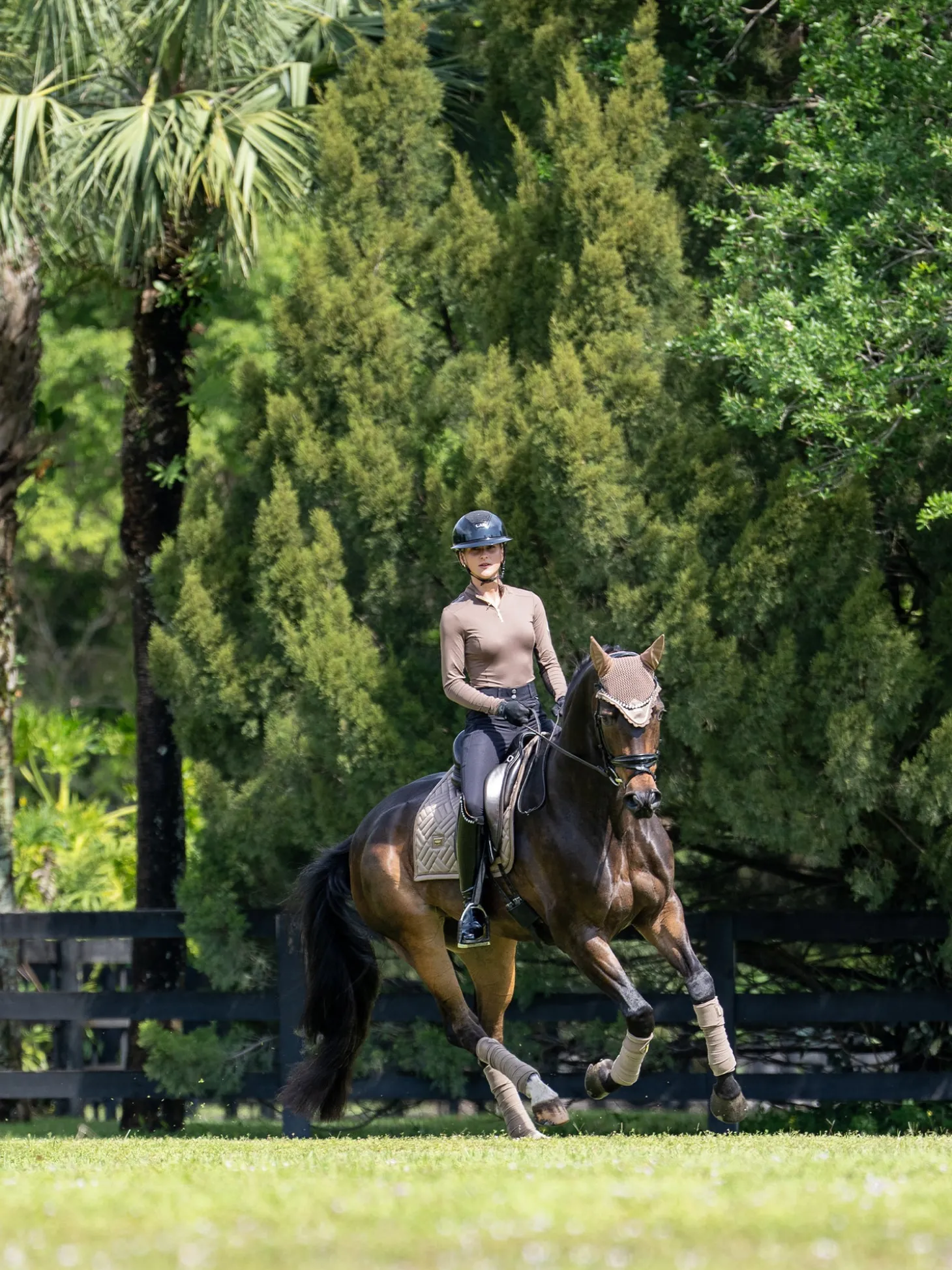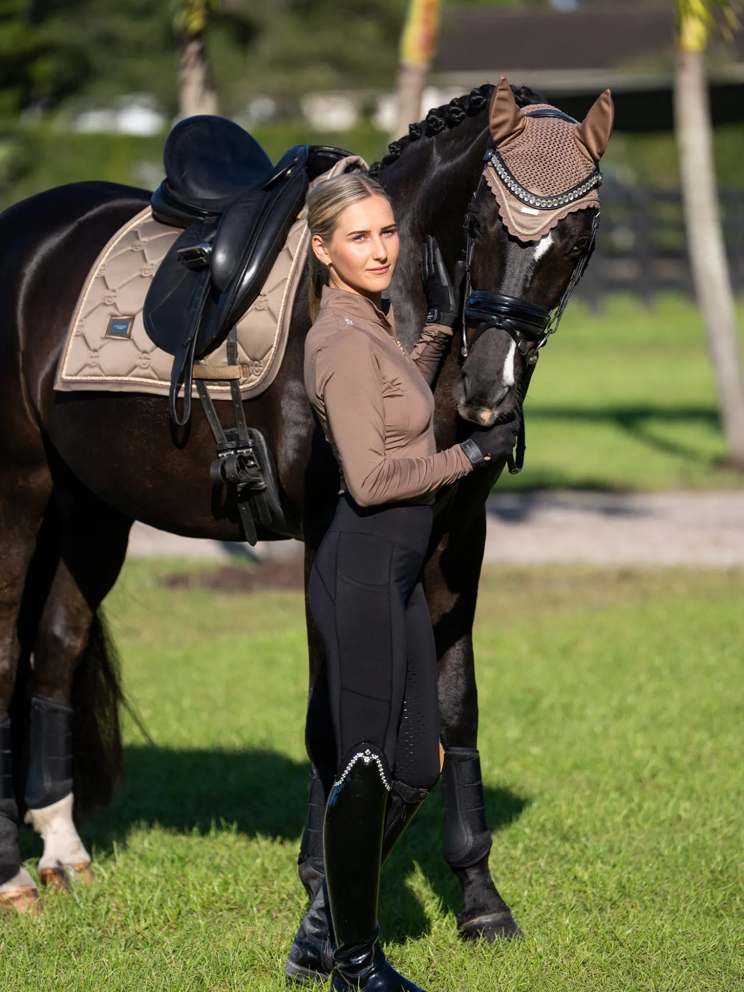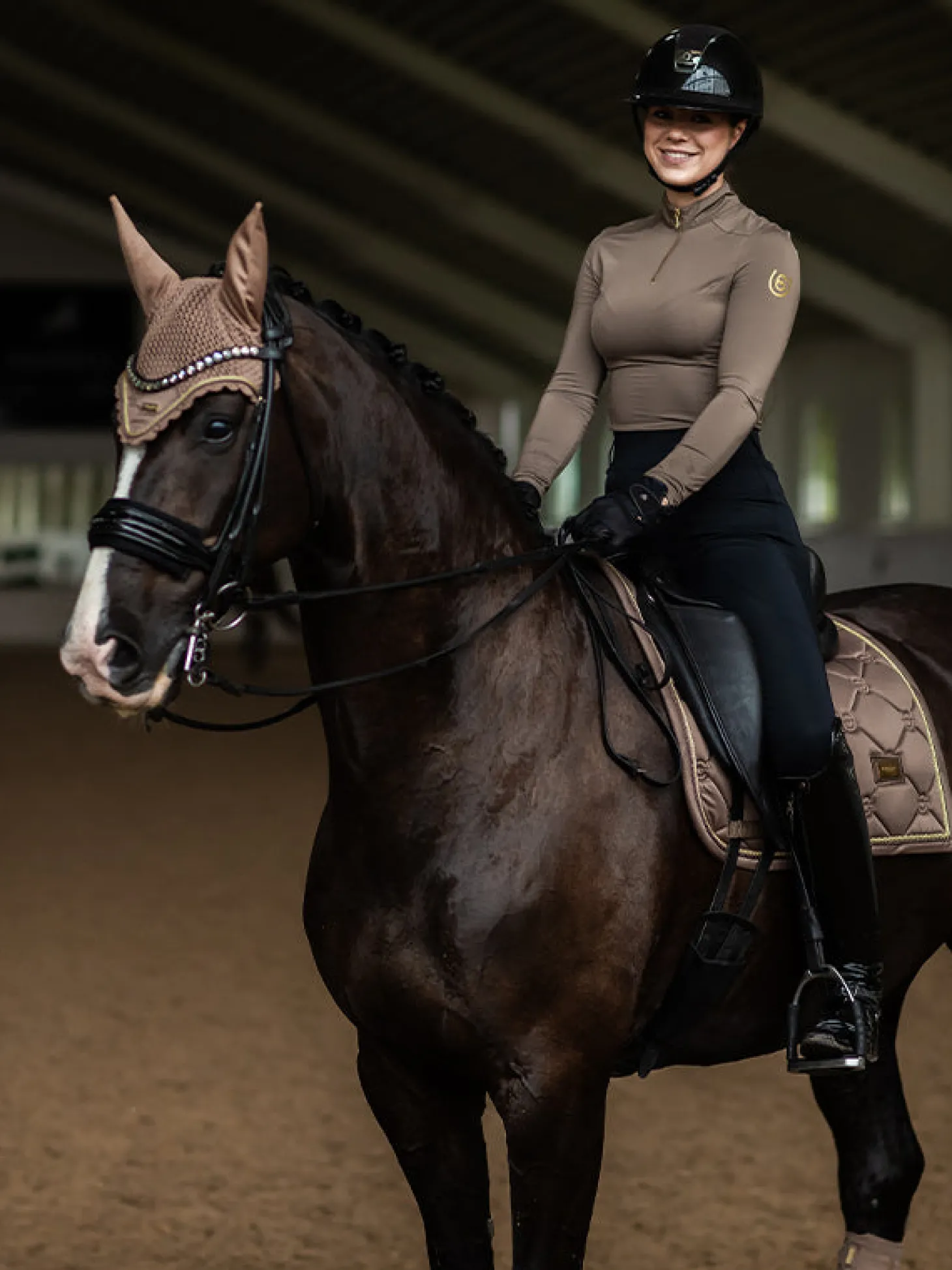 Hochwertige Fliegenhaube in Champagne mit goldfarbener Paspelierung und Metallbadge. Passt perfekt zur Champagne Schabracke.
