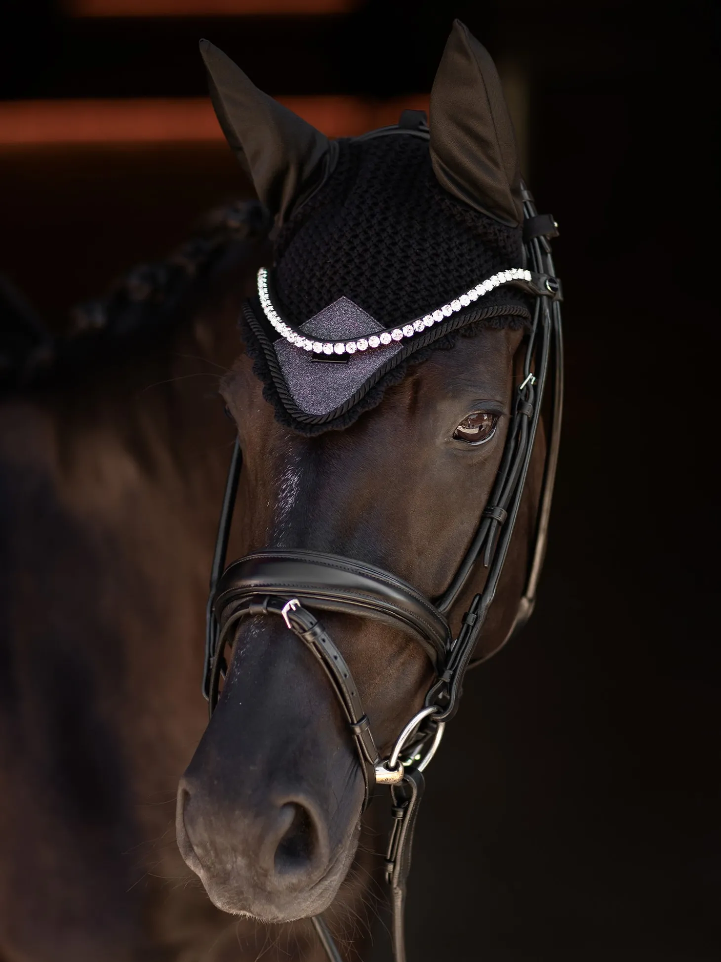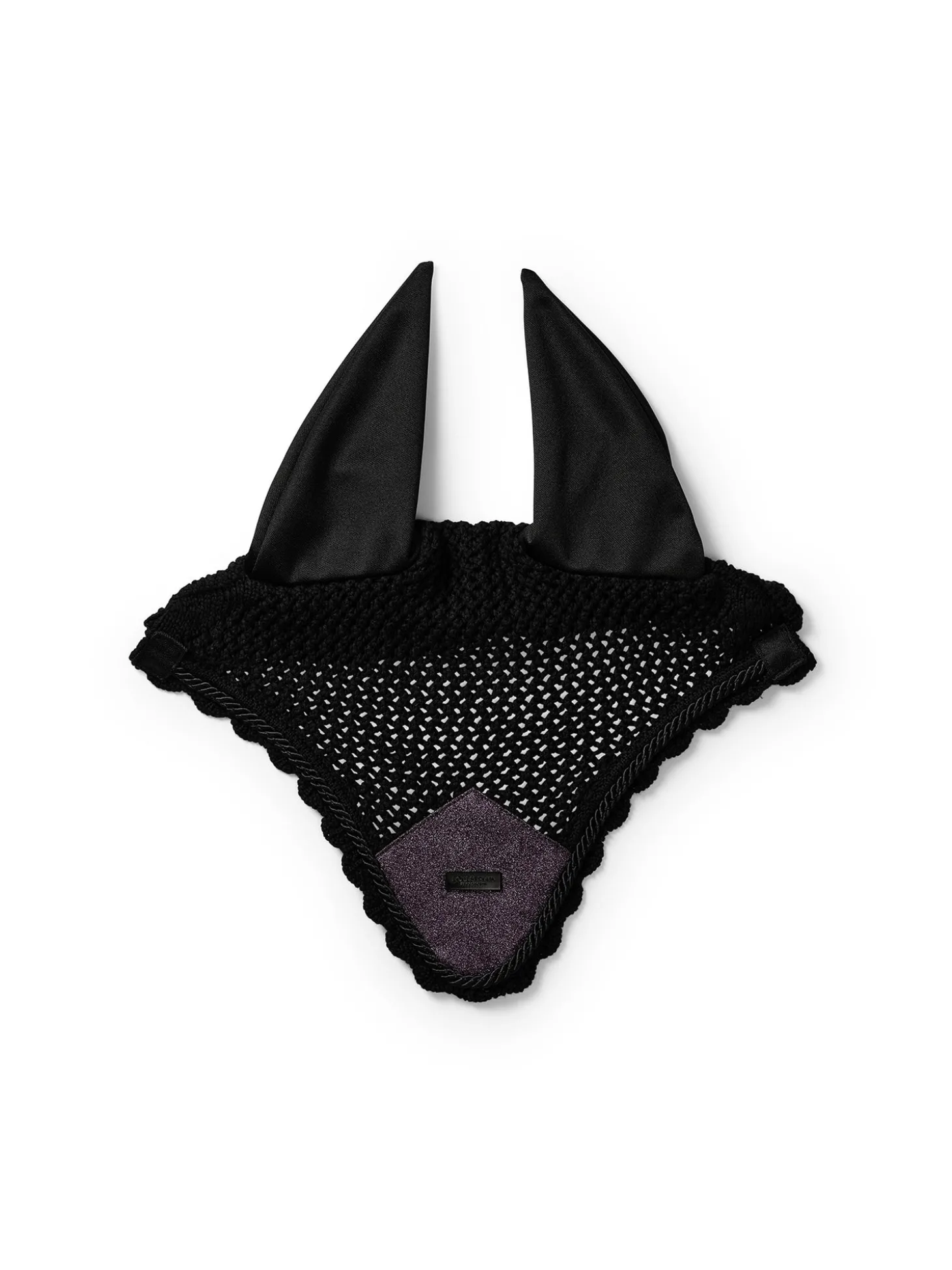 Gehäkelte Fliegenhaube in stilvollem Schwarz. Verziert mit einem glitzernden lila Aufnäher auf der Vorderseite, schönen Paspeln und unserem Equestrian Stockholm Abzeichen in Schwarz. Die Fliegenhaube bietet sowohl Insektenschutz als auch Geräuschdämmung. Sie hat einen elastischen Stoff an den Ohren für zusätzlichen Komfort.