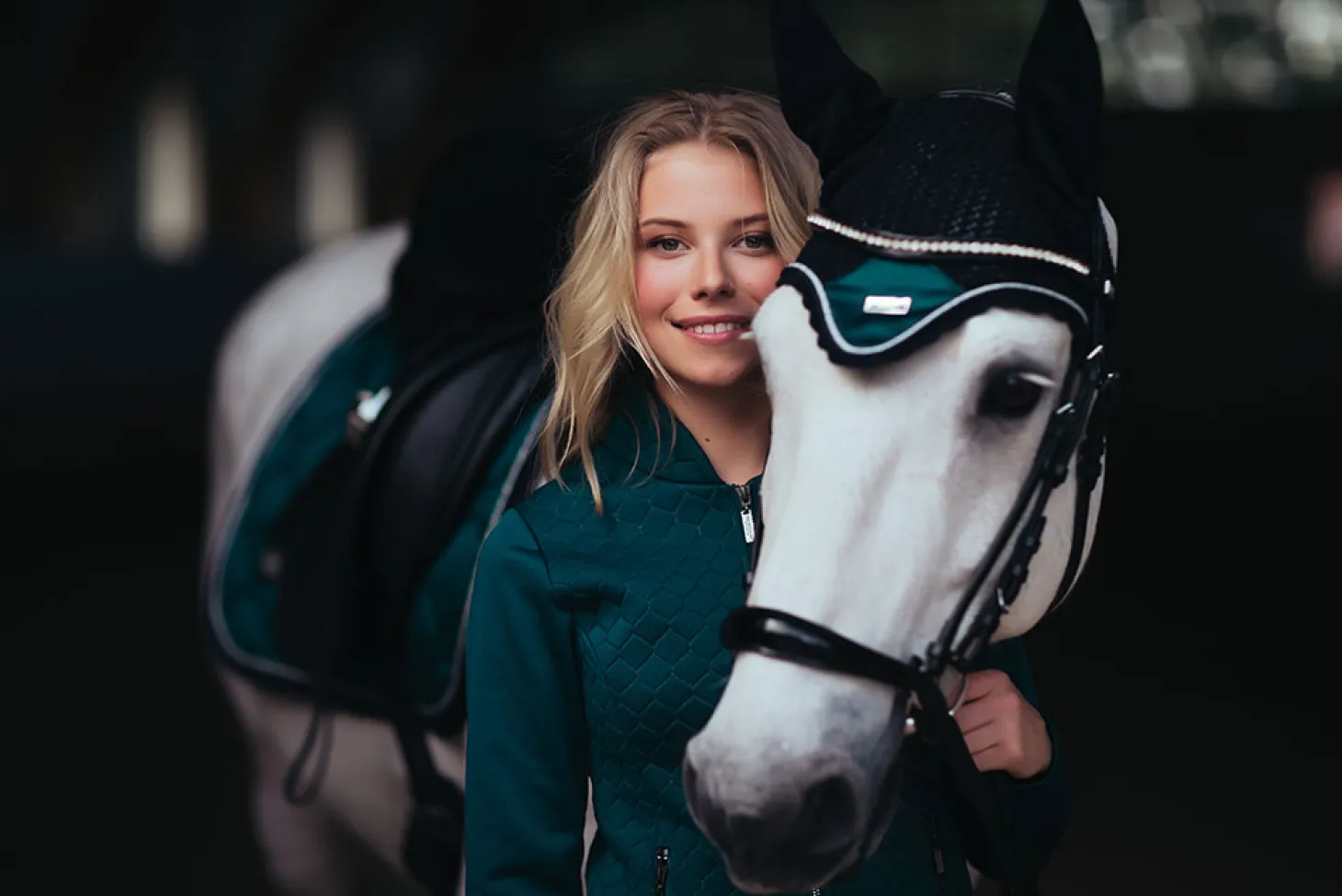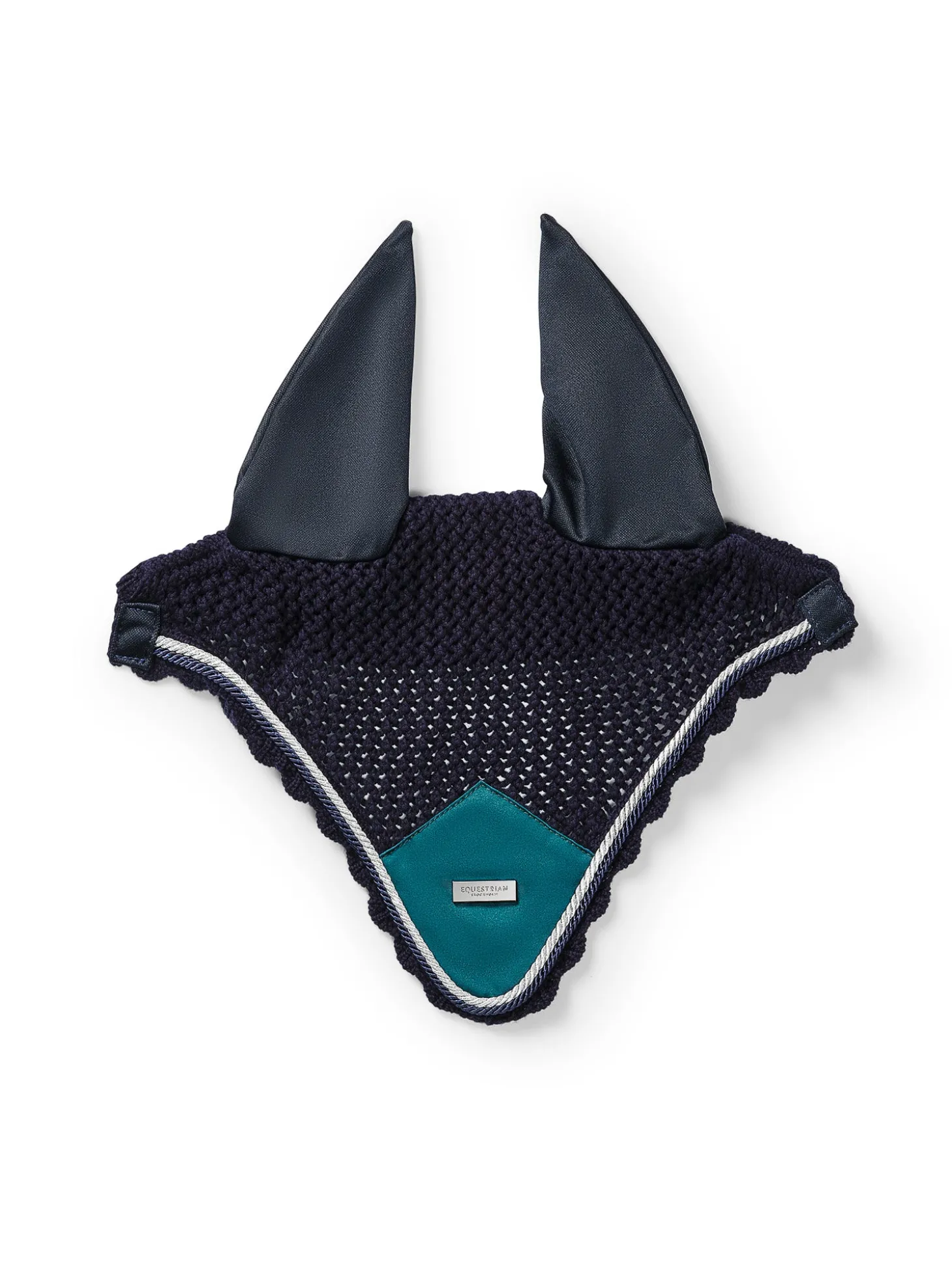 Hochwertige Fliegenhaube in Navy mit silberfarbener Paspelierung und silberfarbenem Metallbadge. Die wunderschönen Details in Emerald passen ideal zur Schabracke „Emerald“! Gehäkelte Fliegenhaube mit Stretch-Stoff an den Ohren, um Wundscheuern entgegenzuwirken.