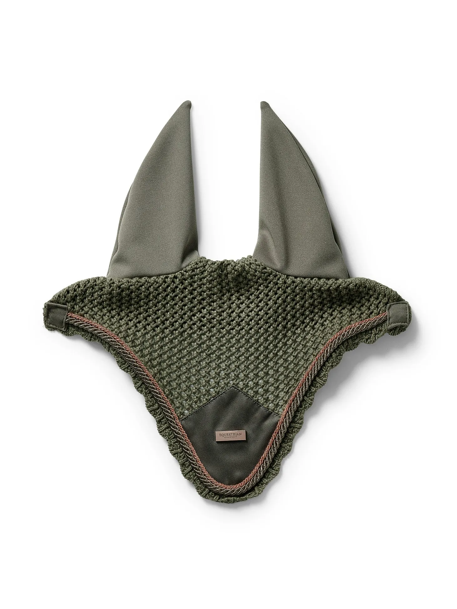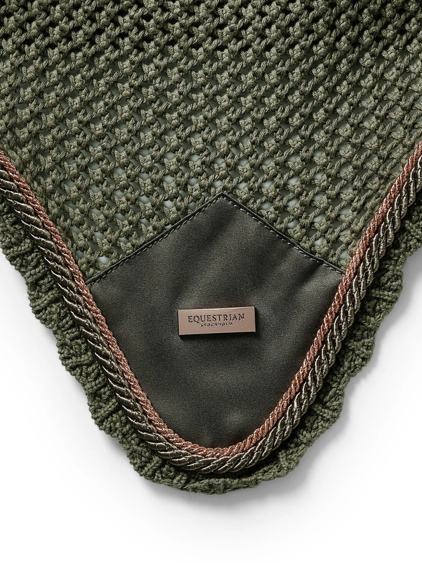 Luxuriöse gehäkelte Fliegenhaube in Olivgrün. Verziert mit einem grauen Satinaufnäher auf der Vorderseite, schönen roségoldenen Paspeln und einem Equestrian Stockholm Abzeichen in Roségold. Daie Fliegenhaube bietet sowohl Insektenschutz als auch Geräuschdämmung und hat elastischen Stoff an den Ohren für zusätzlichen Komfort. Die Fliegenhaube passt perfekt zu der Schabracke aus der Striking Valley Kollektion.