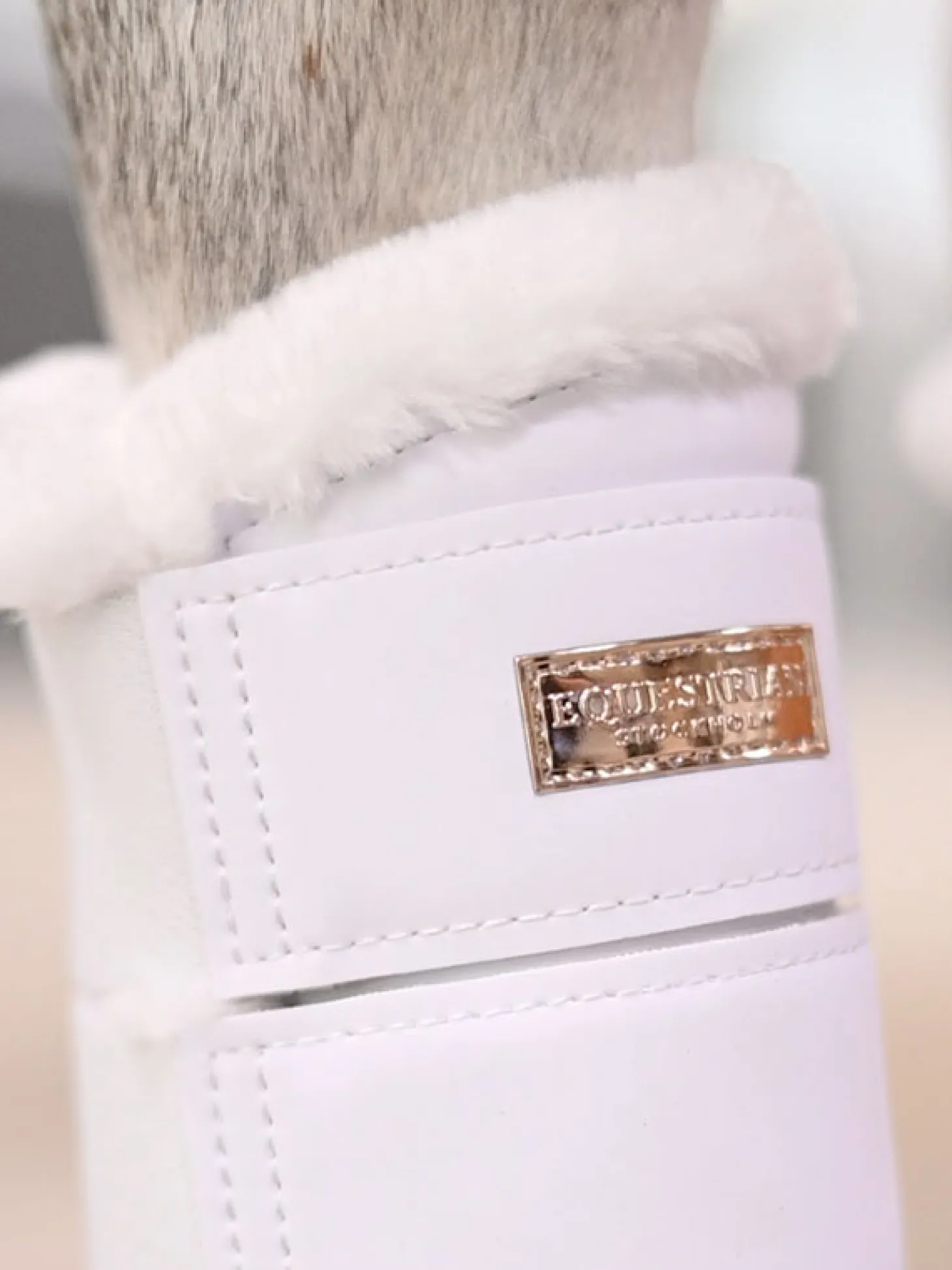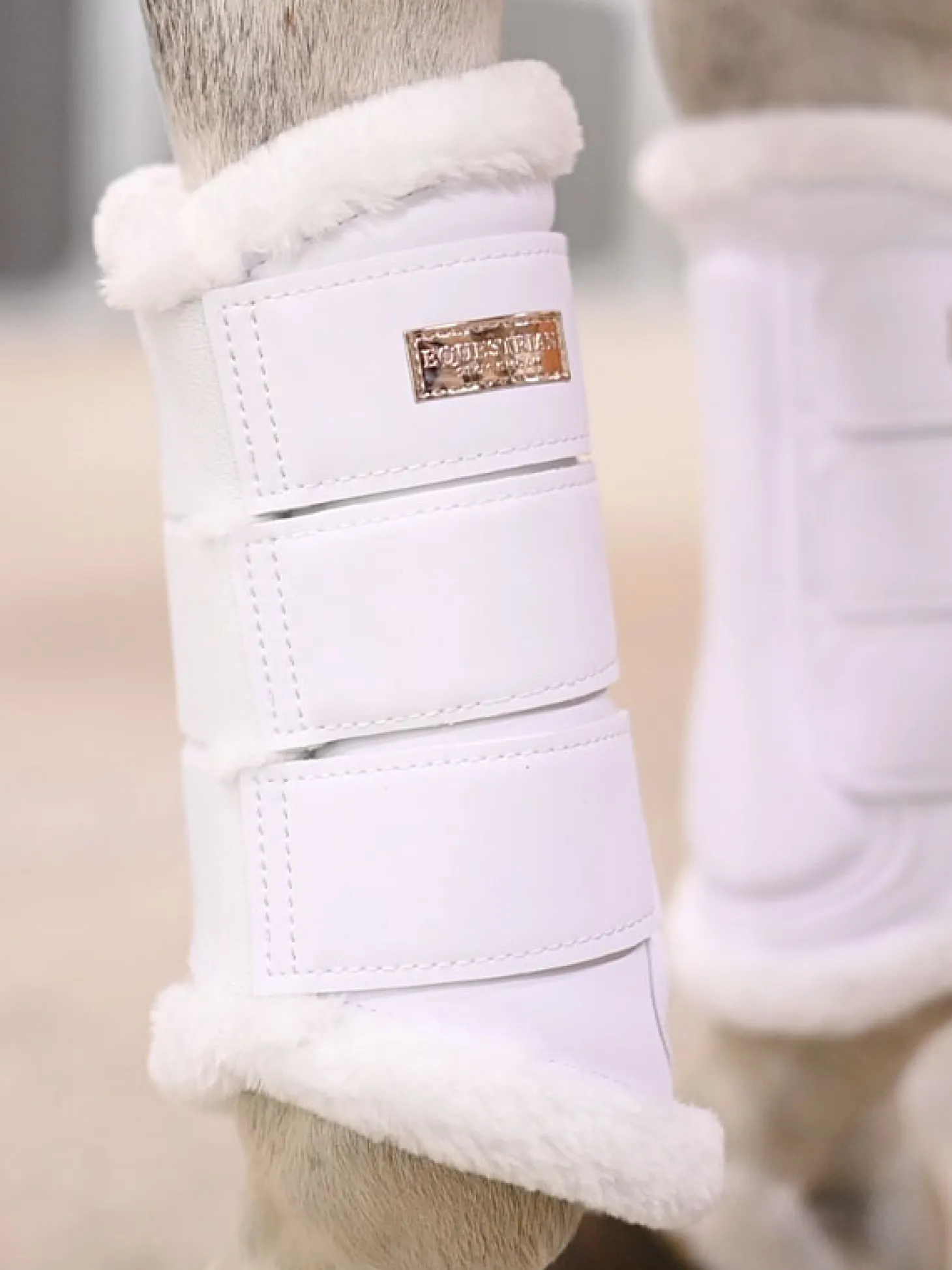 Hochwertige Gamaschen mit Rundum-Passform, in klassischem Weiß mit roségoldenen Details. Hergestellt aus synthetischem PU-Leder mit mattem Finish. Weiches Innenfutter für die Beine des Pferdes. Elastische Klettverschlussriemen mit dem stilvollen Equestrian Stockholm-Logo. Die Gamaschen werden paarweise verkauft und passen sowohl vorne als auch hinten.