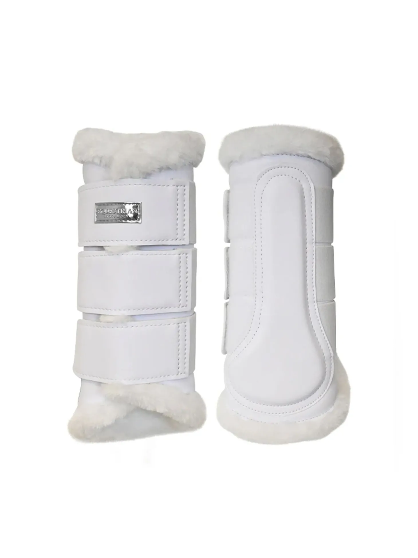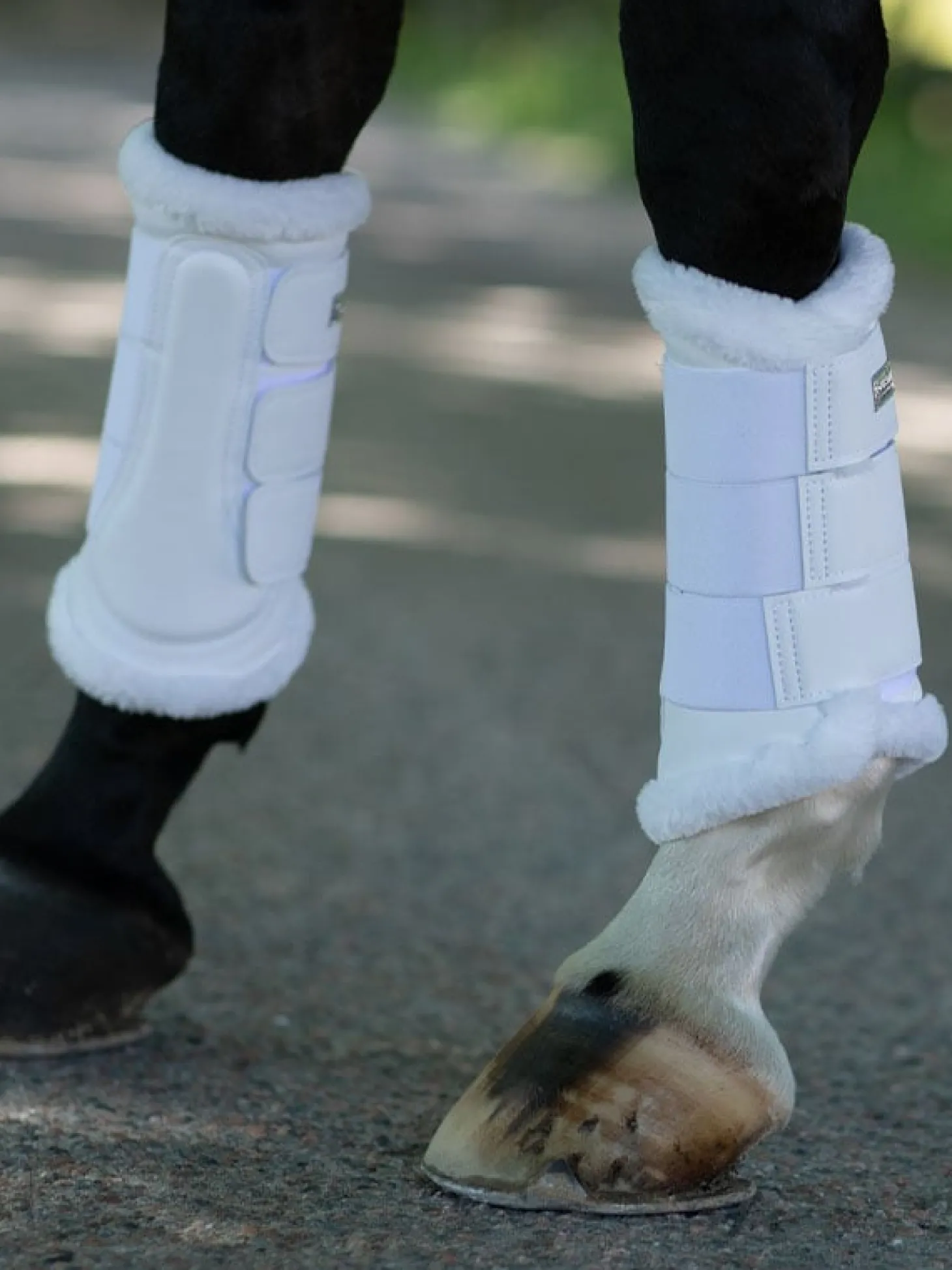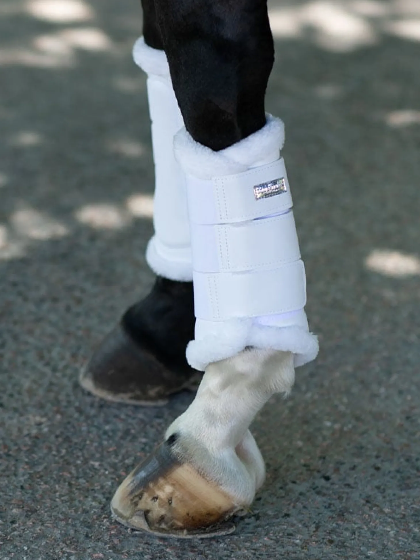 Hochwertige Gamaschen mit Rundum-Passform, in klassischem Weiß mit silbernen Details. Hergestellt aus synthetischem PU-Leder mit mattem Finish. Weicher Teddy auf der Innenseite gegen die Beine des Pferdes. Elastische Klettverschlüsse mit dem stilvollen Equestrian Stockholm Logo. Kombinieren Sie die Gamaschen mit anderen Produkten aus unseren Turnierkollektionen für einen kompletten Look. Die Gamaschen werden paarweise verkauft und eignen sich sowohl für die Vorder- als auch für die Hinterbeine.