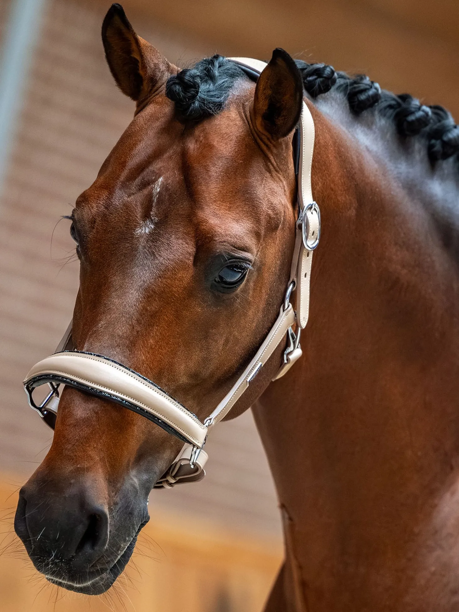 Das anatomische Lederhalfter von Equestrian Stockholm wurde mit einem breiteren Genickstück entwickelt, das anatomisch gepolstert ist, um den Druck auf eine größere Fläche im empfindlichen Bereich des Genicks des Pferdes zu verteilen. Die anatomisch geformte Konstruktion des Halfters sorgt für Komfort für Ihr Pferd und eignet sich perfekt für Turniere und den Transport. Die Größe lässt sich einfach und schnell sowohl auf der rechten als auch auf der linken Seite des Pferdekopfes einstellen. Unser luxuriöses anatomisches Turnierhalfter ist in einem eleganten Beige gehalten und mit wunderschönen schwarzen Kristallen entlang des gesamten Nasenriemens verziert, die Ihr Pferd fantastisch aussehen lassen und es bei Turnieren hervorstechen lassen.
