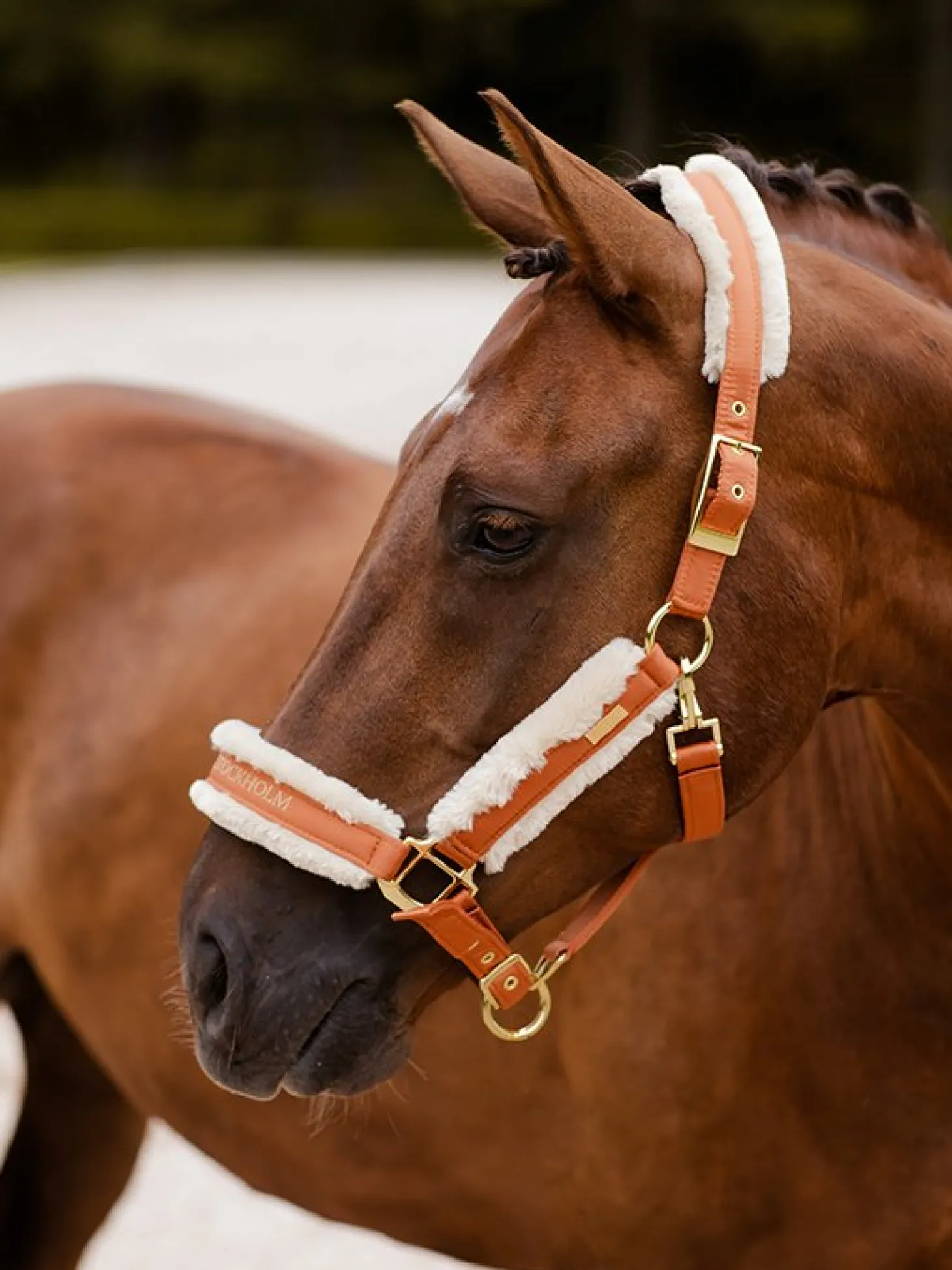 Machen Sie es sich gemütlich mit diesem exklusiven Halfter mit weichem Teddyfell. Hergestellt in einem warmen Copper Orange mit weißen Teddyfell und goldenen Schnallen. Verschönertes goldenes Equestrian Stockholm-Logo auf dem Nasenriemen.