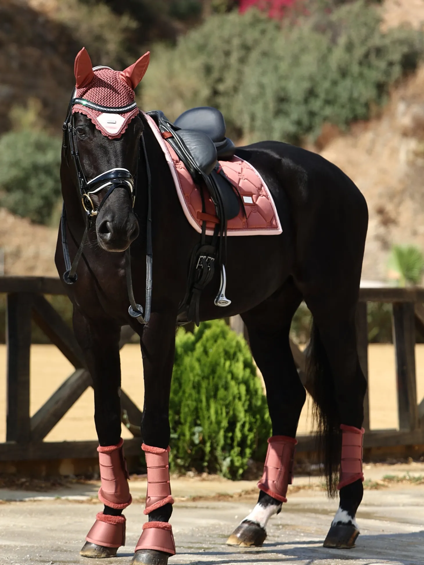 Die Hufglocken sind ca. 6 mm dick und mit Neopren gefüttert, wodurch Verletzungen an der Ferse wirksam verhindert werden. Die Hufglocken wird mit einem breiten Klettverschluss geschlossen, der mit dem bernsteinroten Logo von Equestrian Stockholm verziert ist.