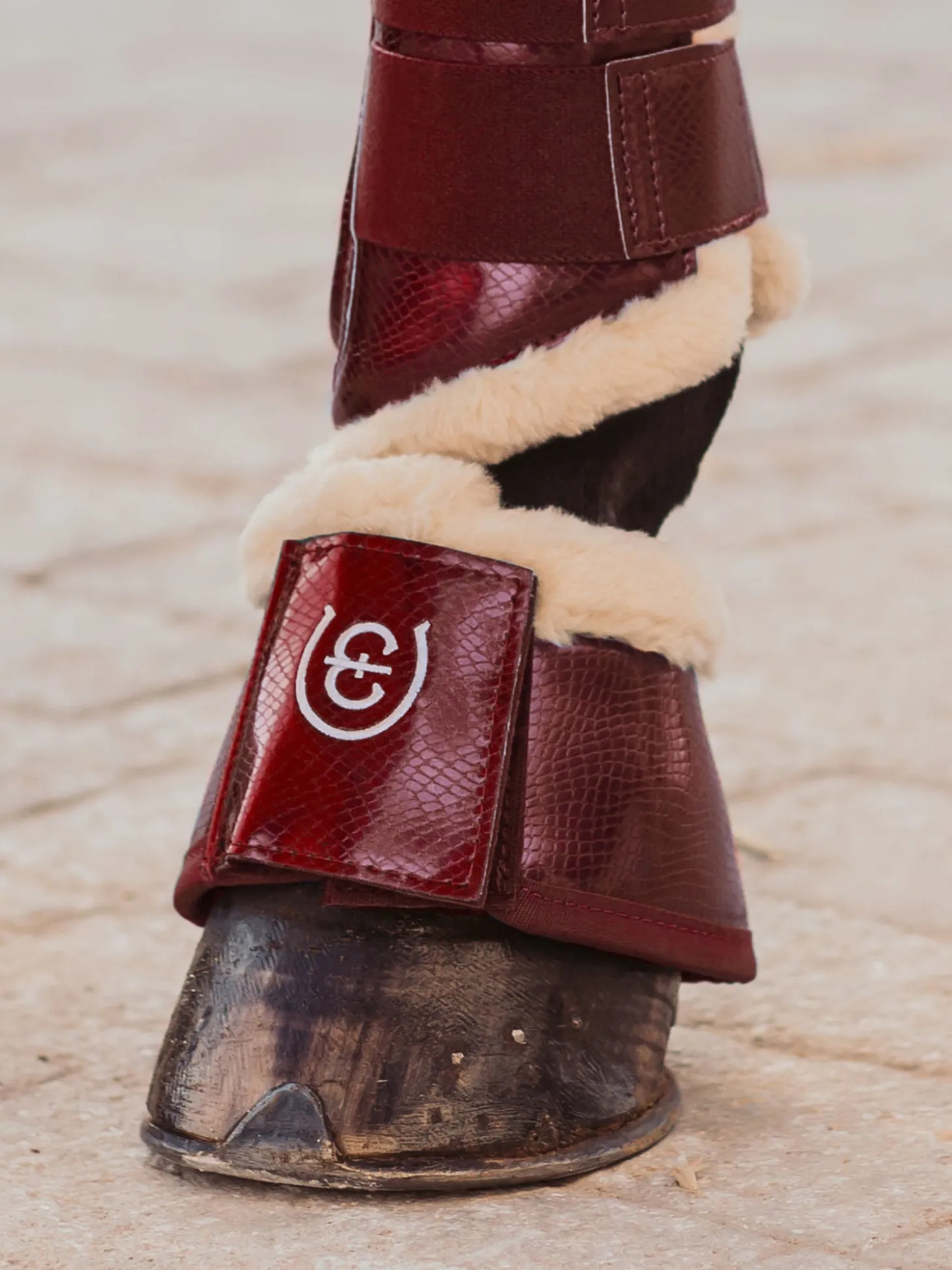 Stylische hochqualitative Hufglocken aus Schlangenleder-Imitat mit weichem Faux Fur Synthetik-Fellrand. Die Hufglocken sind etwa 6mm dick, die Innenseite ist mit Neopren ausgekleidet, welches den Hufballen effektiv vor Verletzungen schützt. Sie sind mit einem breiten Klettverschluss zu verschließen, verziert mit einem gestickten Equestrian Stockholm Logo. Außerdem passen sie perfekt den Gamaschen aus derselben Serie.