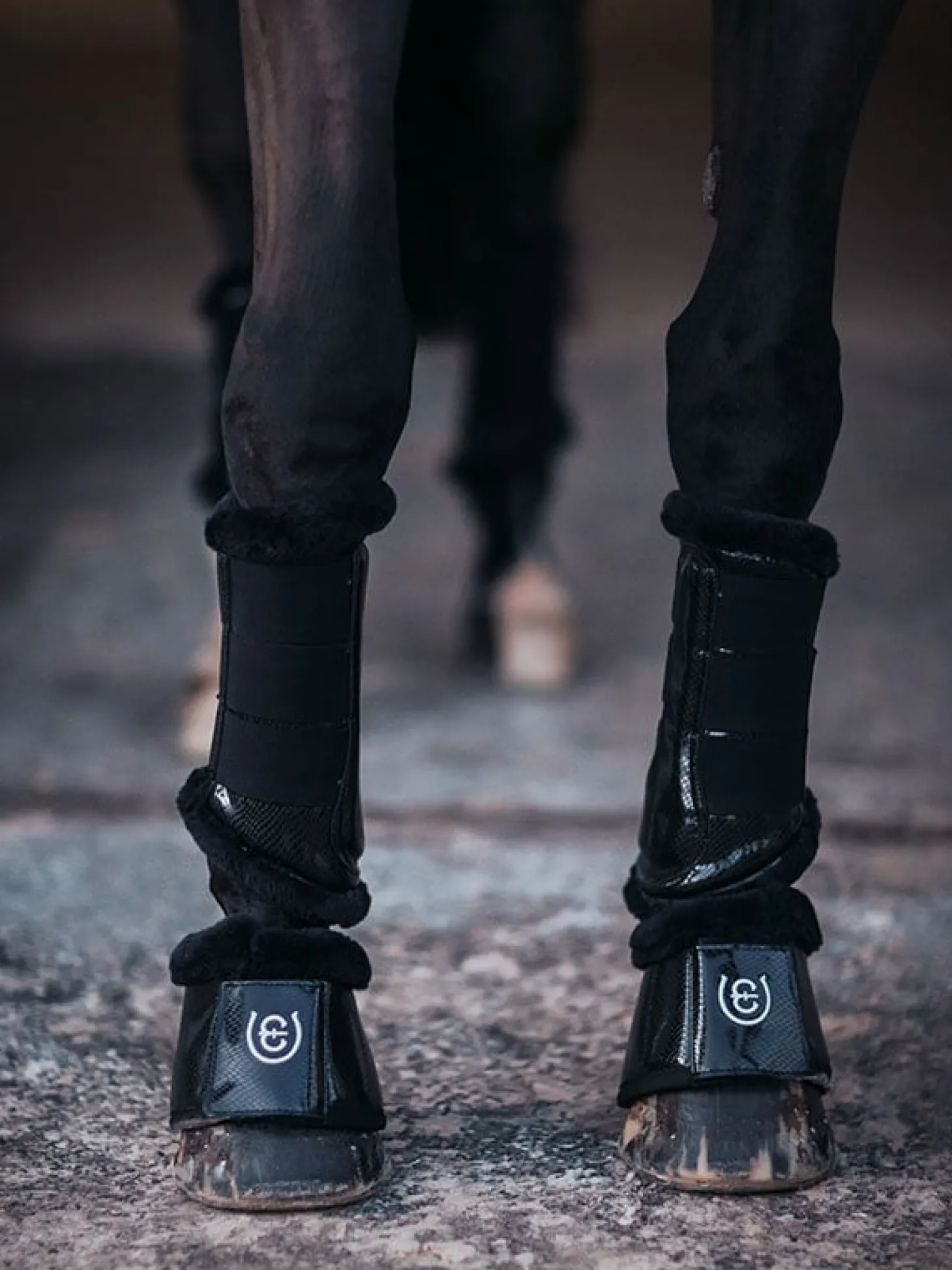 Werten Sie Ihren Stil mit diesen hochwertigen schwarzen Hufglocken aus glänzendem Kunstleder mit Kroko-Imitat auf. Das klassische schwarze Design wird durch passendes Teddyfell auf der Innenseite ergänzt, das das Pferdebein schützt.