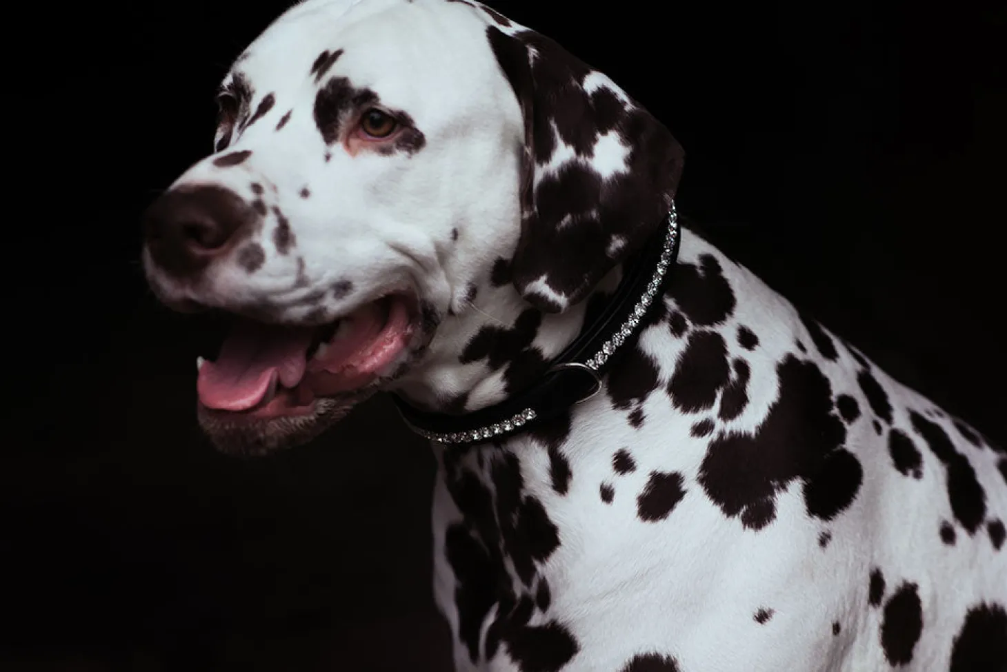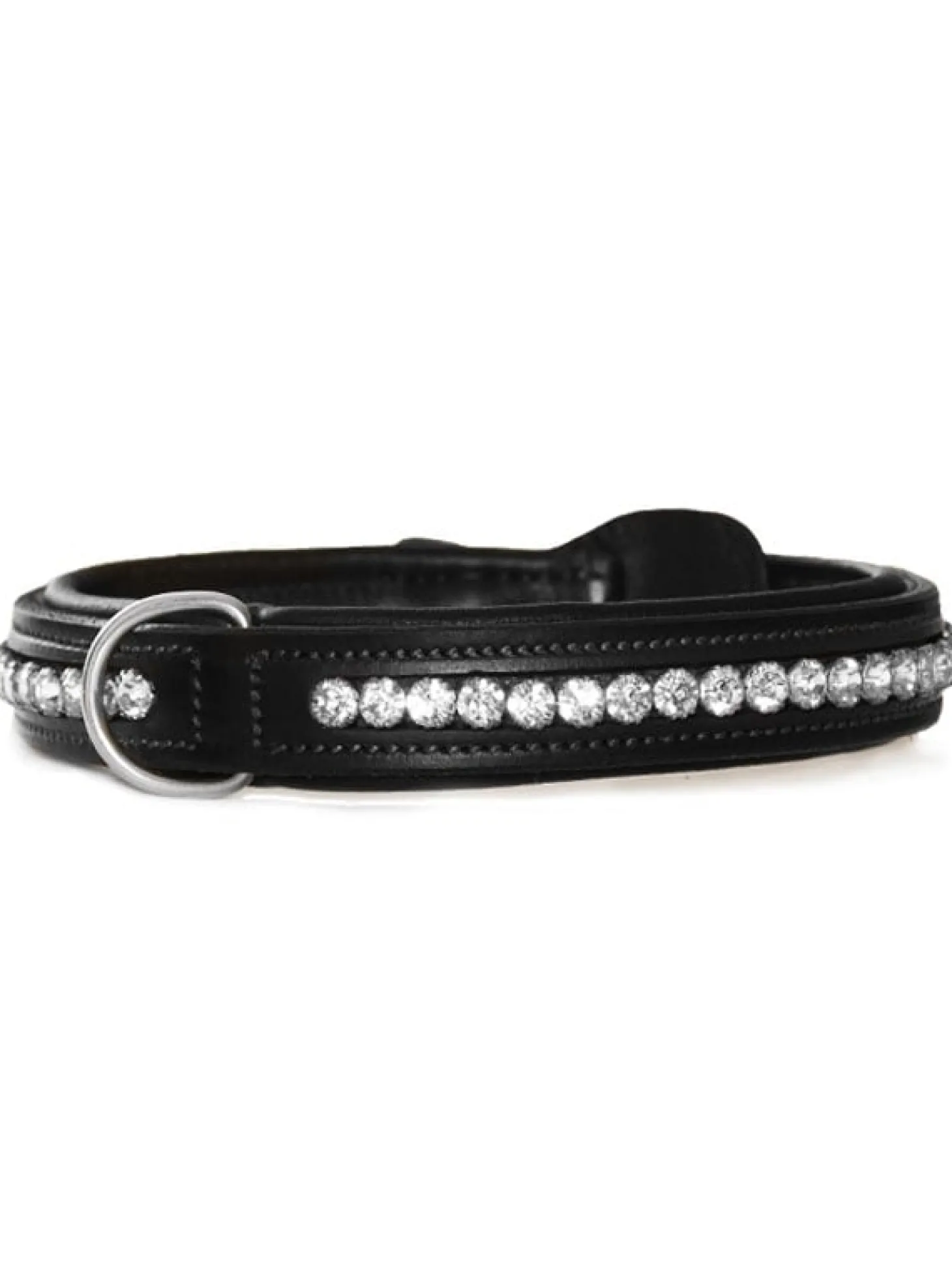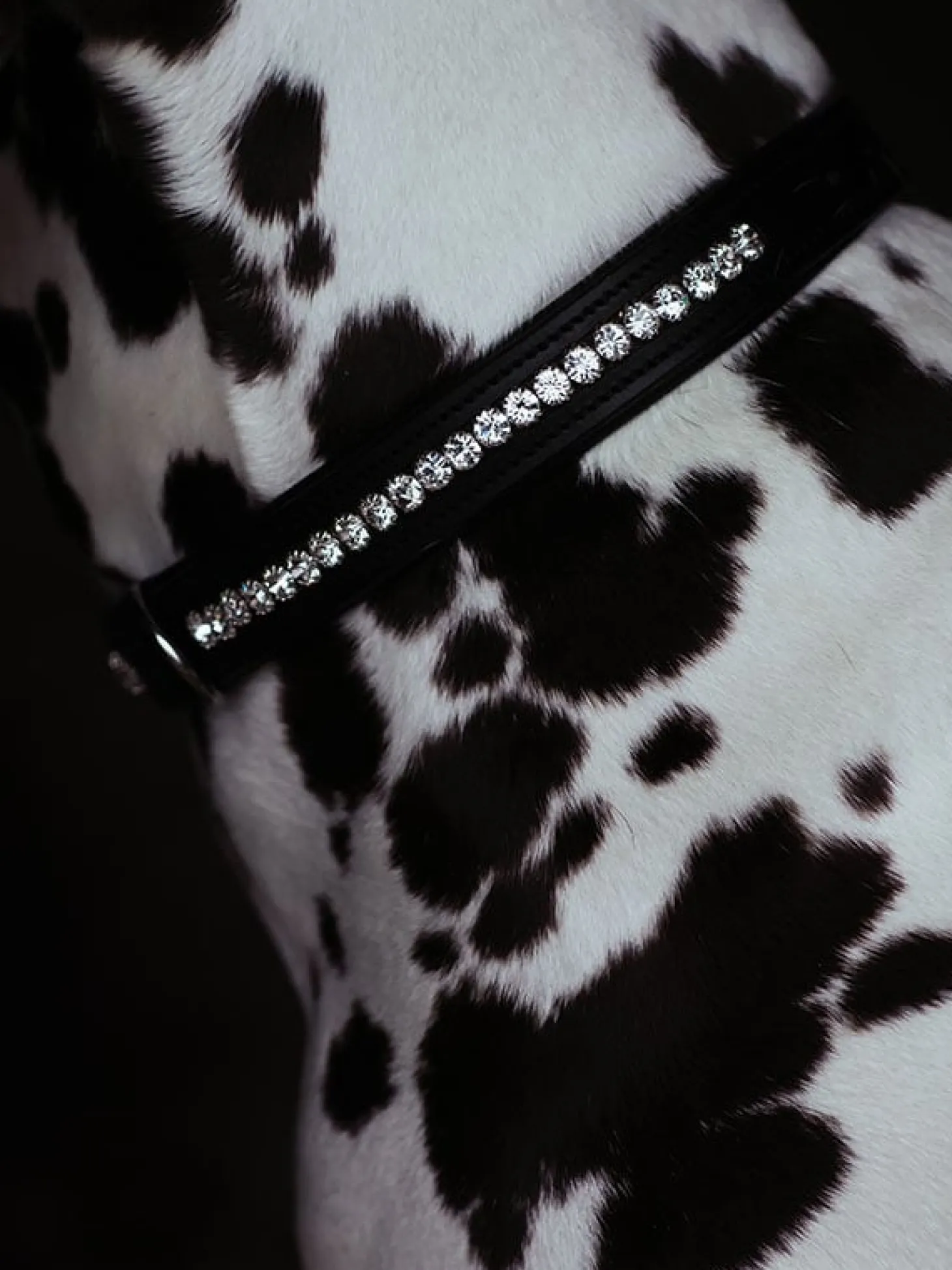 Stilvolles, verstellbares Hundehalsband aus schwarzem Leder mit silbernen Strasssteinen. Bequemes, hochwertiges Leder mit weicher Polsterung auf der Innenseite. Gut verankerte Schlaufe für die Leine. Das Halsband ist in mehreren Größen erhältlich, damit es sowohl kleinen als auch großen Hunden passt.