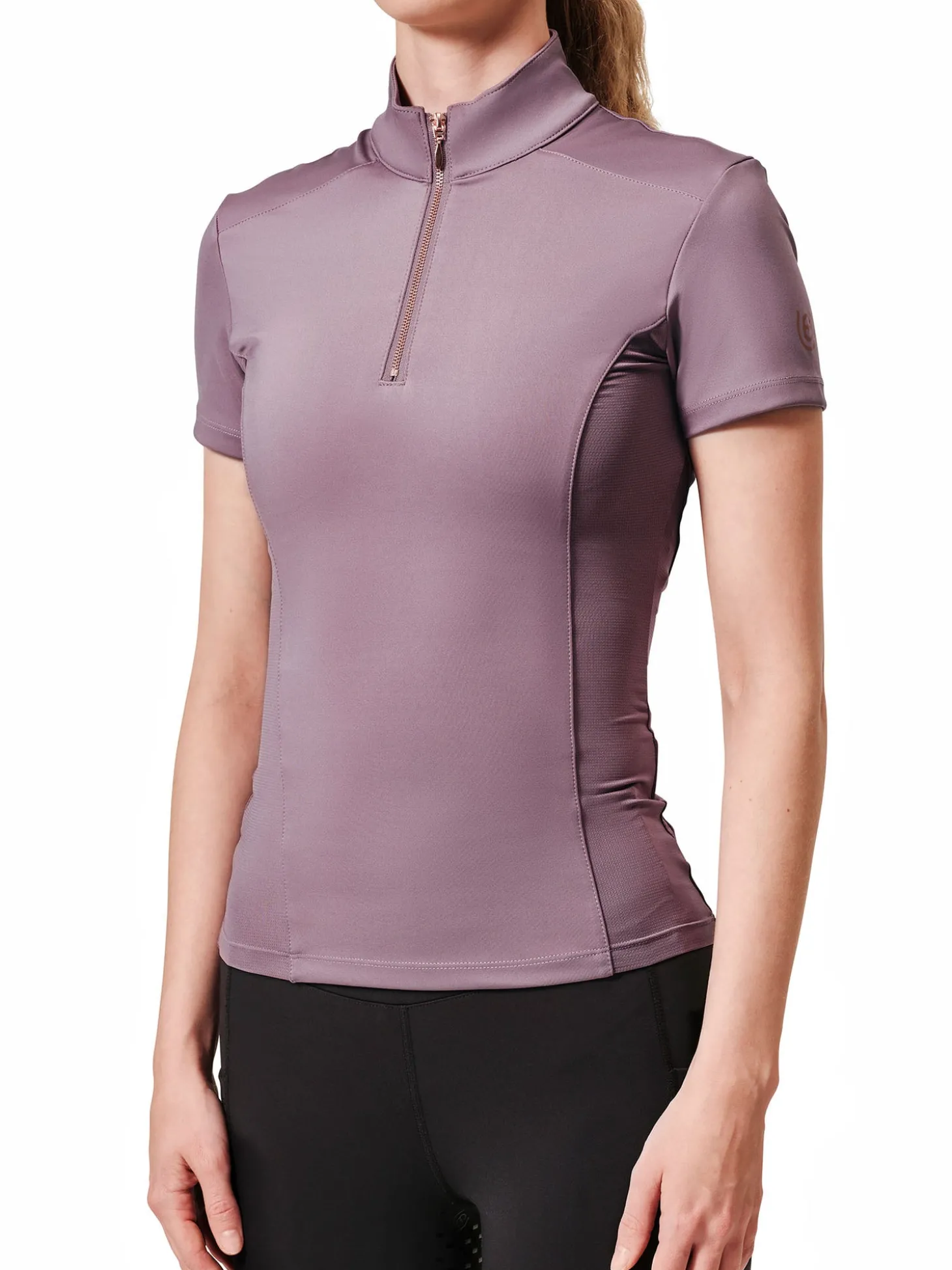 Details: Vertikales Equestrian Stockholm Logo auf dem Rücken in Roségold. Kleines roségoldenes Equestrian Stockholm Logo auf dem linken Arm.