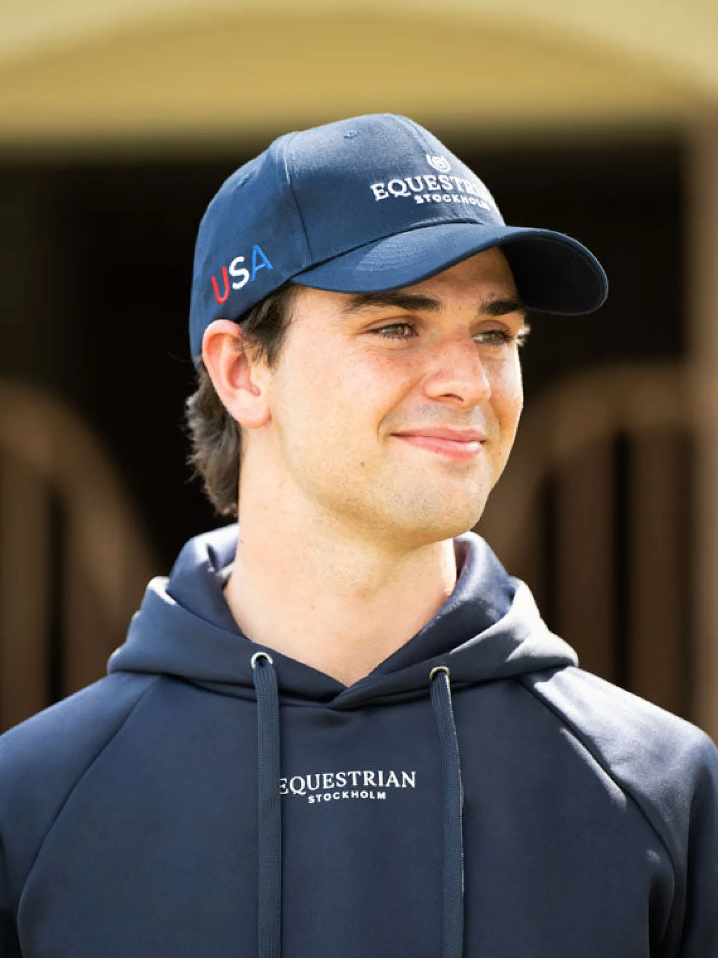 Details: Weißes Equestrian Stockholm Logo, amerikanische Flagge mittig hinten und sowohl auf der linken als auch auf der rechten Seite.