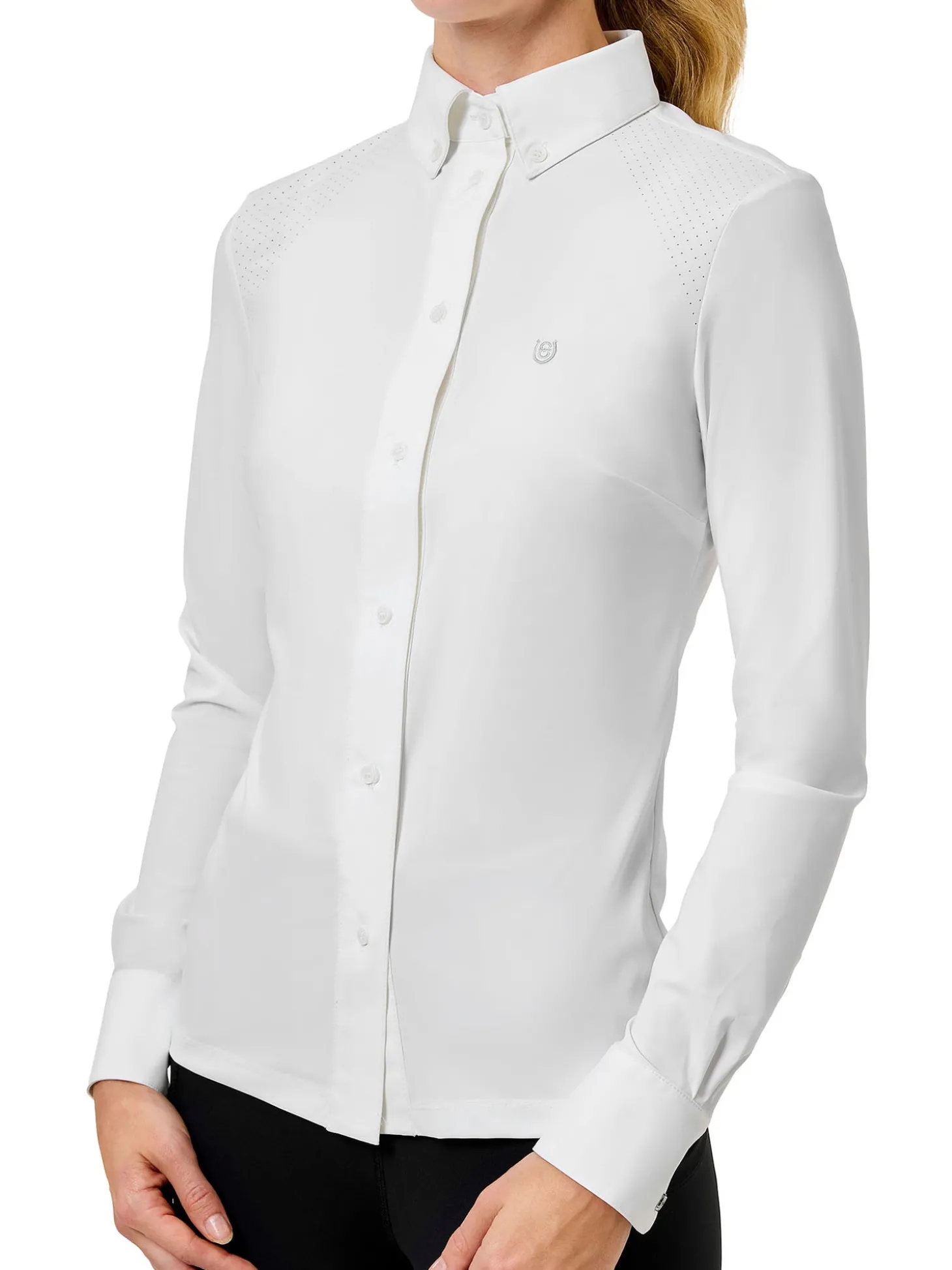 Crafted from performance material with a cooling handfeel and enhanced breathability through laser-cut holes, this piece ensures superior comfort. Designed for the elegant rider, it perfectly combines functionality with timeless style.