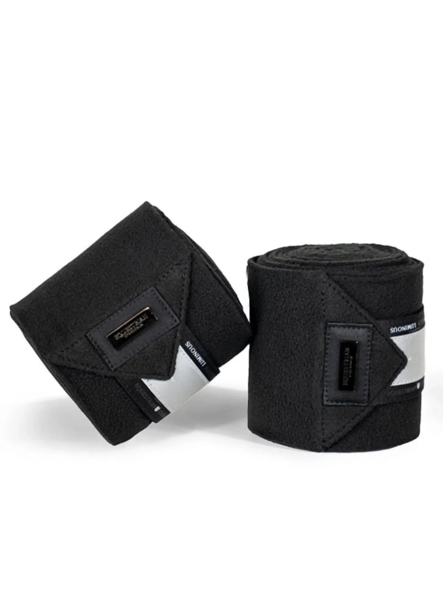 Hochwertige Fleecebandagen in schönem Schwarz. Verziert mit reflektierenden Details und dem Equestrian Stockholm Abzeichen in Tiefschwarz. Kombinieren Sie die Fleecebandagen mit der Schabracke und der Fliegenhaube aus der Kollektion Luminous Black für einen glamourösen Look. Verkauft im Viererset.