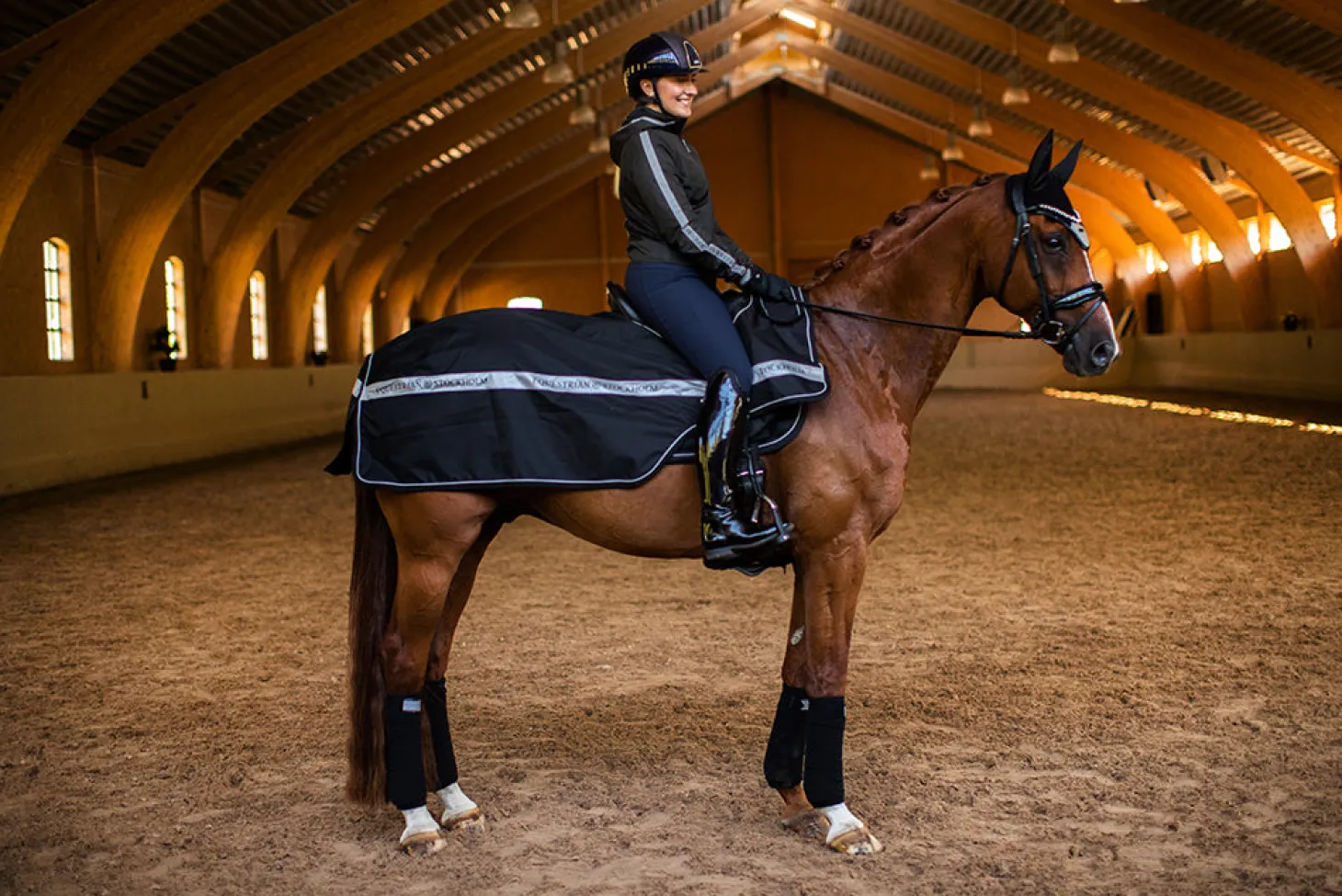 Details: Reflektierendes Band / Ränder der reflektierenden Bänder mit reflektierendem und verchromtem Equestrian Stockholm Logo verziert