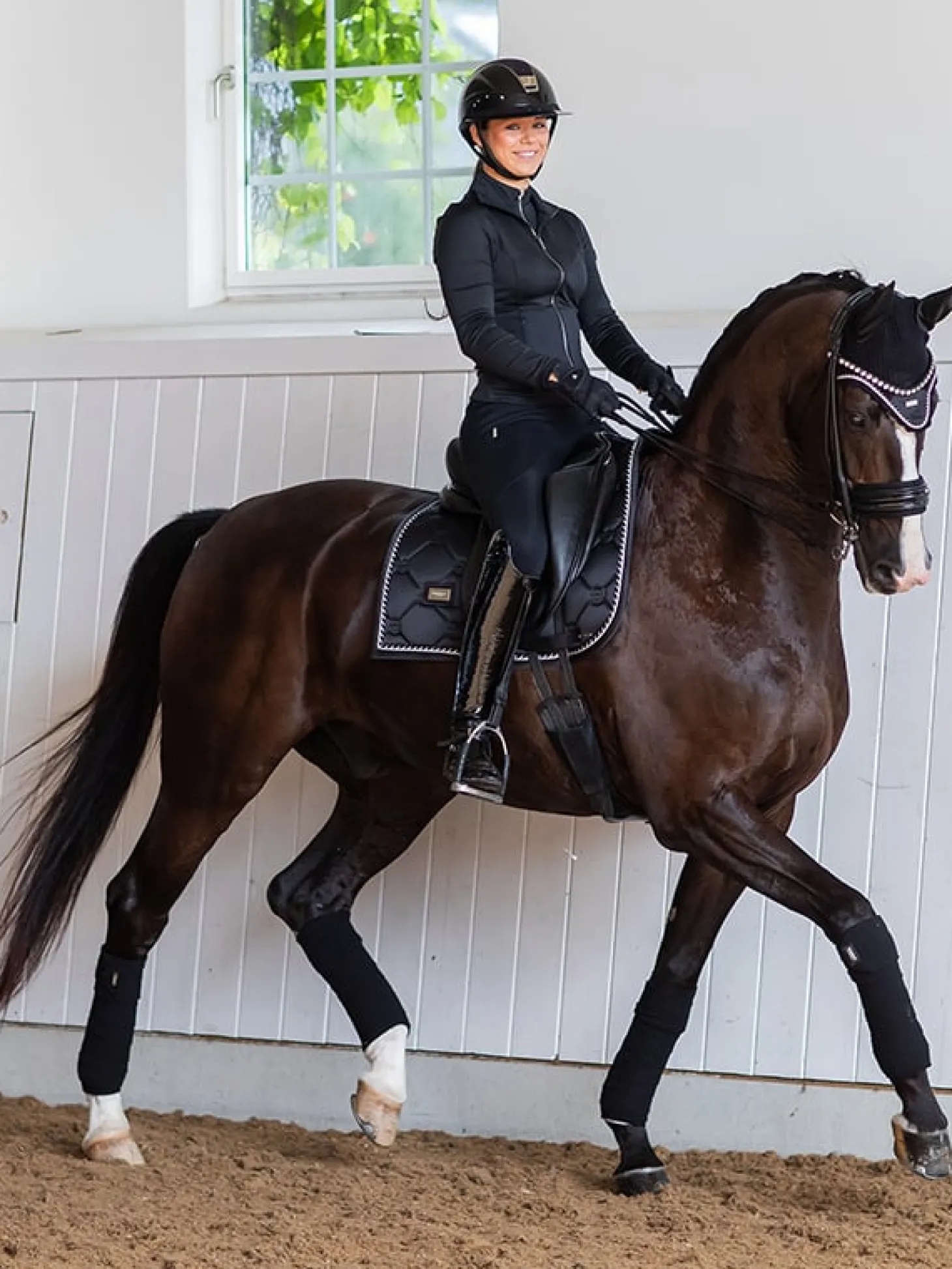 Wir stellen unsere revolutionäre Kompressionsreithose vor, die für den modernen Reiter entwickelt wurde. Sie ist in eleganten Schwarz gehalten und mit einem silbernen Equestrian Stockholm-Abzeichen verziert. Unser 4-Wege-Stretch-Gewebe bietet unvergleichlichen Komfort und ermöglicht es Ihnen, sich frei zu bewegen, während Sie das Gefühl einer vollen Kompression erleben. Der formende Effekt unterstreicht Ihre Figur und sorgt für maximalen Komfort, während Sie gleichzeitig stilvoll aussehen.