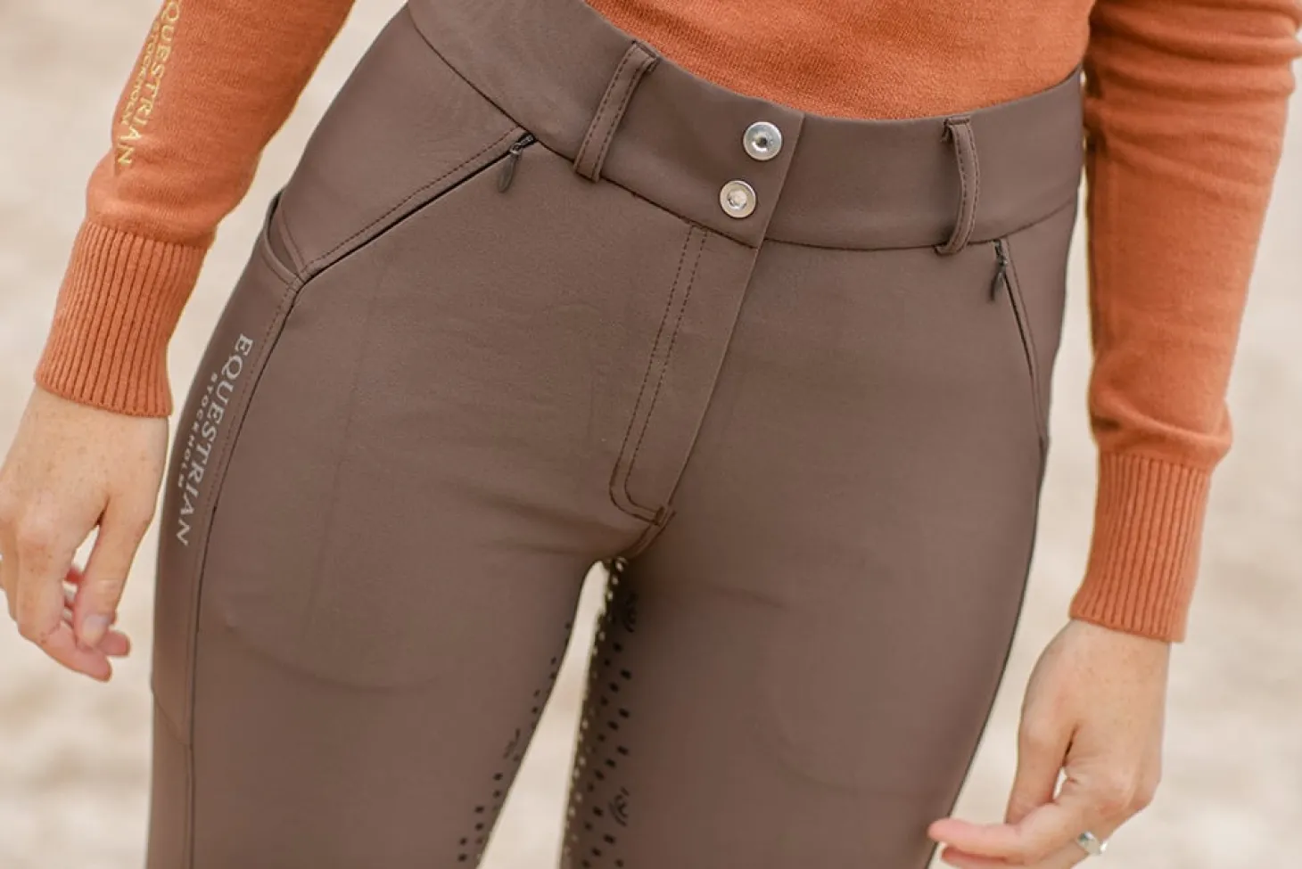 Braune Reithosen mit mittelhohem Bund. Die Reithosen sind mit 4-Wege-Stretch in einem weichen Stoff für ultimativen Komfort und Passform erstellt. Vier gut dimensionierte Taschen, zwei mit einem Reißverschluss und zwei Handytaschen an den Seiten. ;Verziert mit zwei Kristallknöpfen auf der Vorderseite. Erhältlich in einer größeren Größenauswahl. Fällt normal aus.