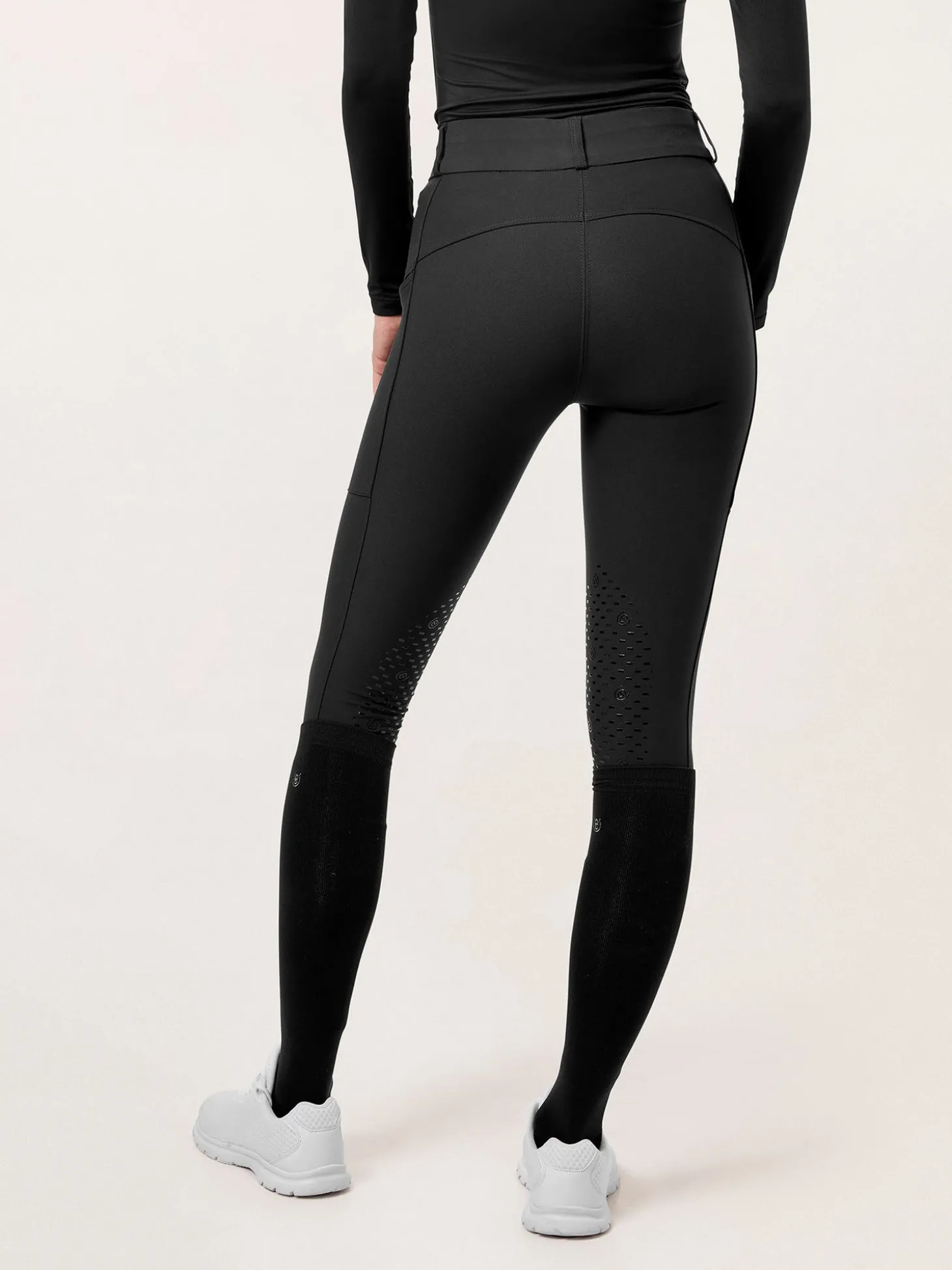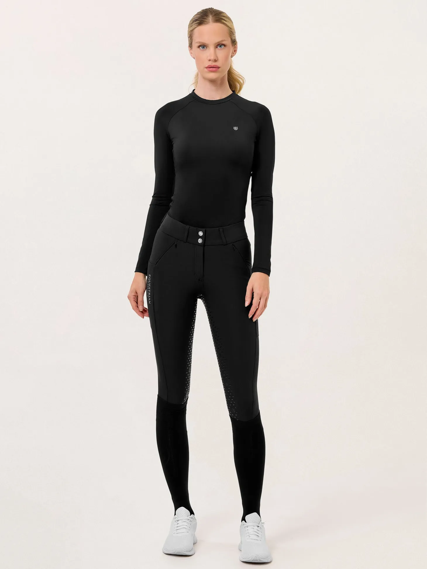 Klassische schwarze Reithosen mit mittelhohem Bund.
