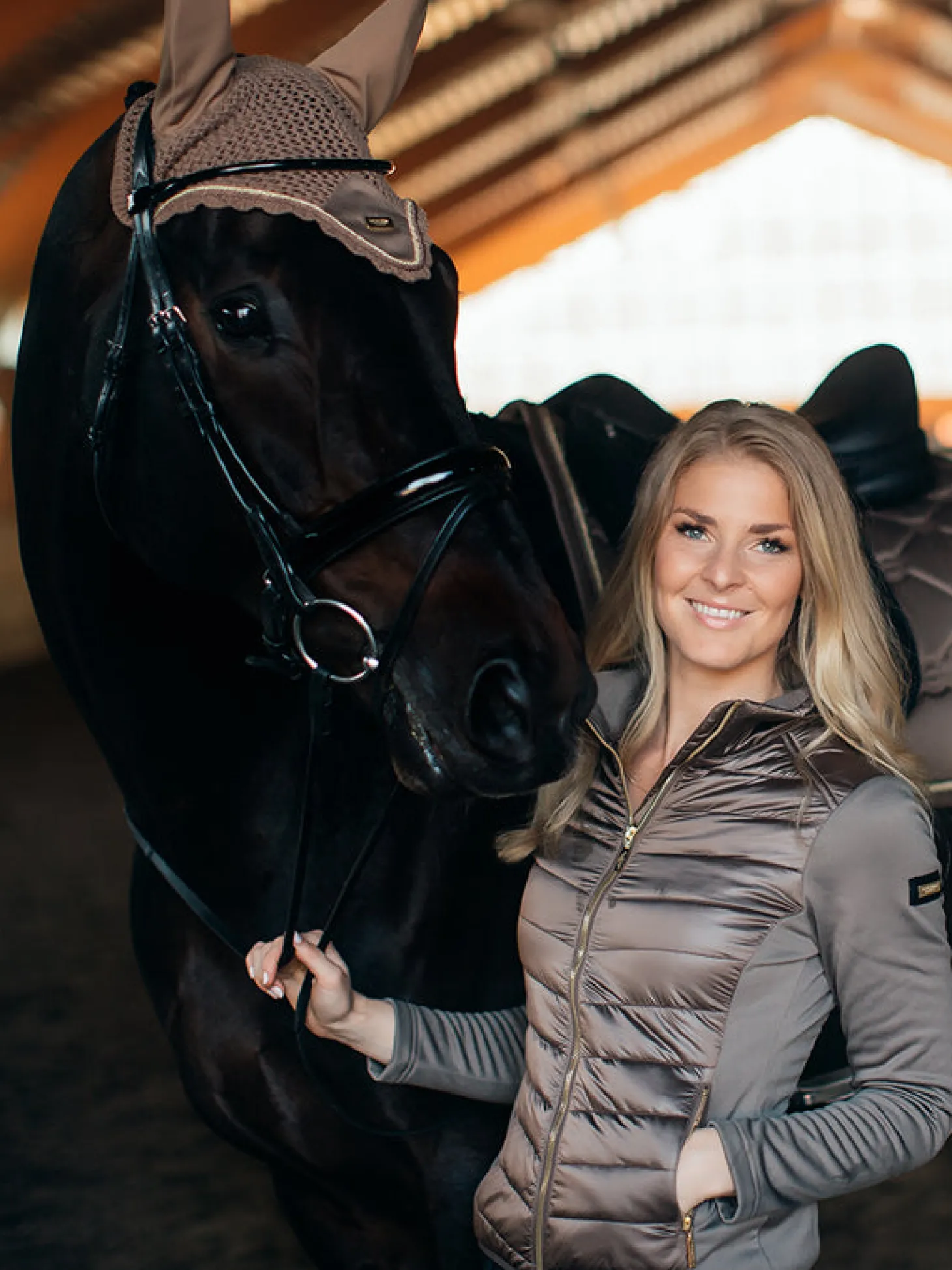 Luxuriöse beigefarbene Multifunktionsjacke in sportlich-elegantem Design mit goldenen Details. Die Vorder- und Rückseite sind aus einem glänzenden und strapazierfähigen Stoff mit Metallic-Finish gefertigt. Ärmel und Seiten sind aus dehnbarem Fleece gefertigt.