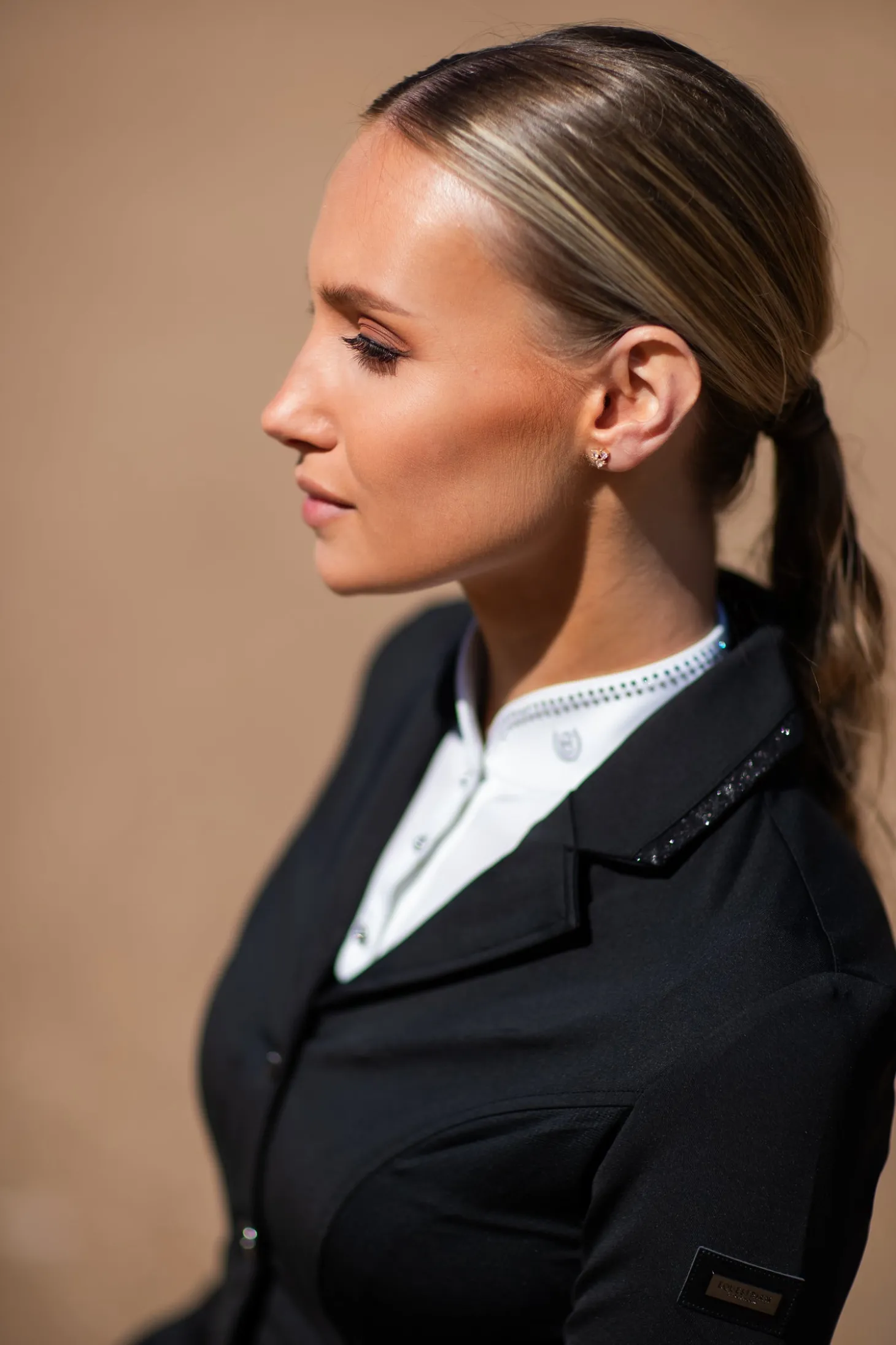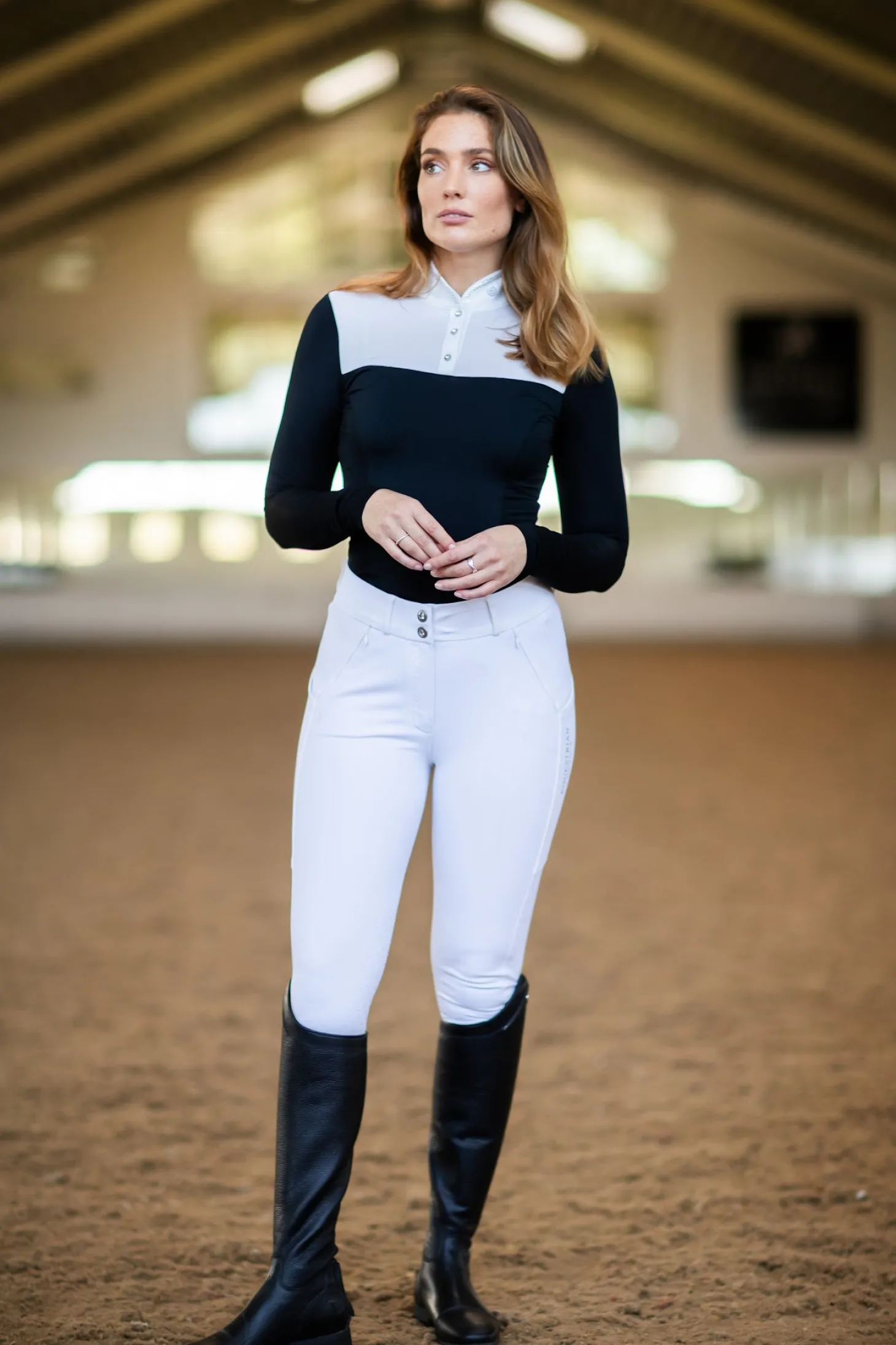 Das Revenew Competition Top ist in elegantem Schwarz mit weißen Details gehalten. Verziert mit schönen Kristallen entlang der Kragenkante und Kristallknöpfen auf der Vorderseite, die Sie von der Masse abheben werden, wenn Sie an einem Turnier teilnehmen.