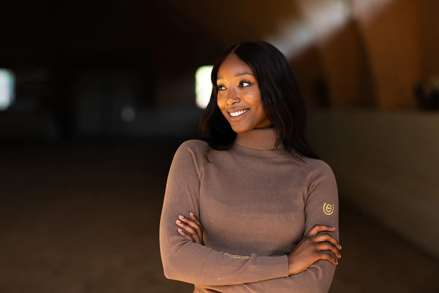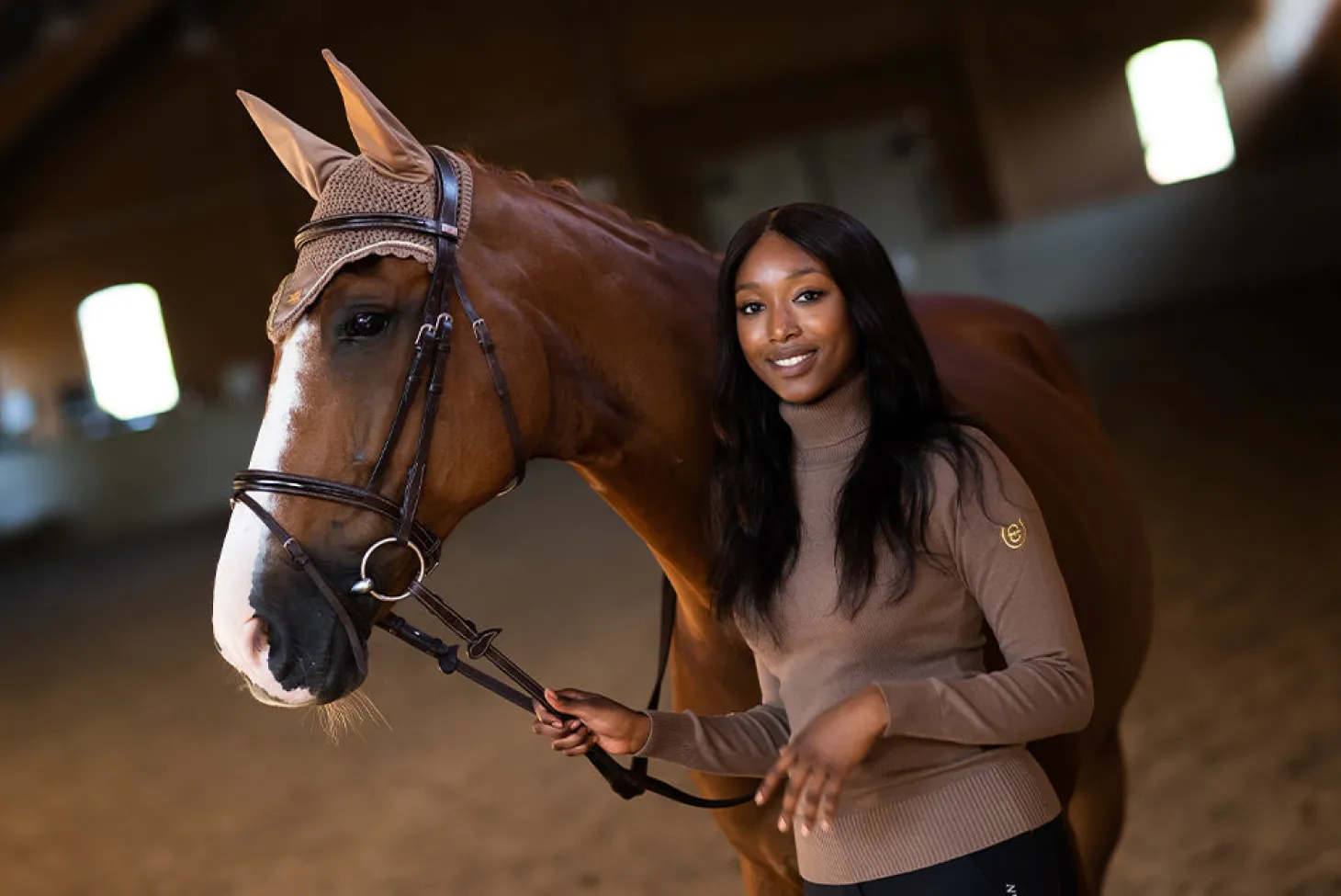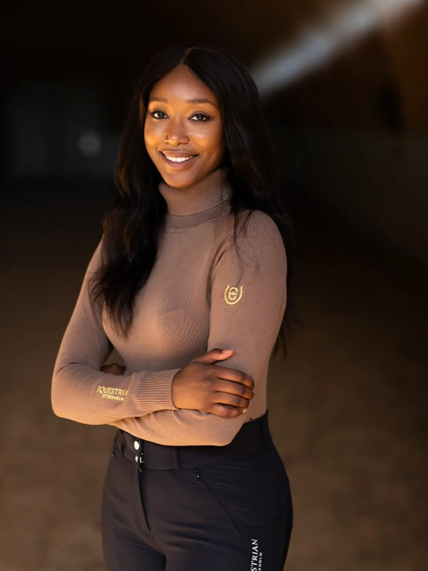 Details: Zwei goldene Equestrian Stockholm Logos, ein gesticktes Logo auf dem rechten Ärmel und ein kleines Logo auf dem linken Ärmel.