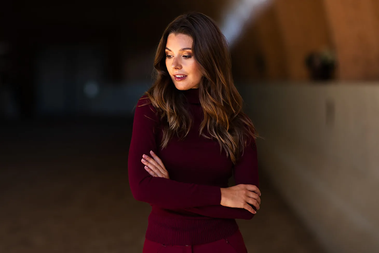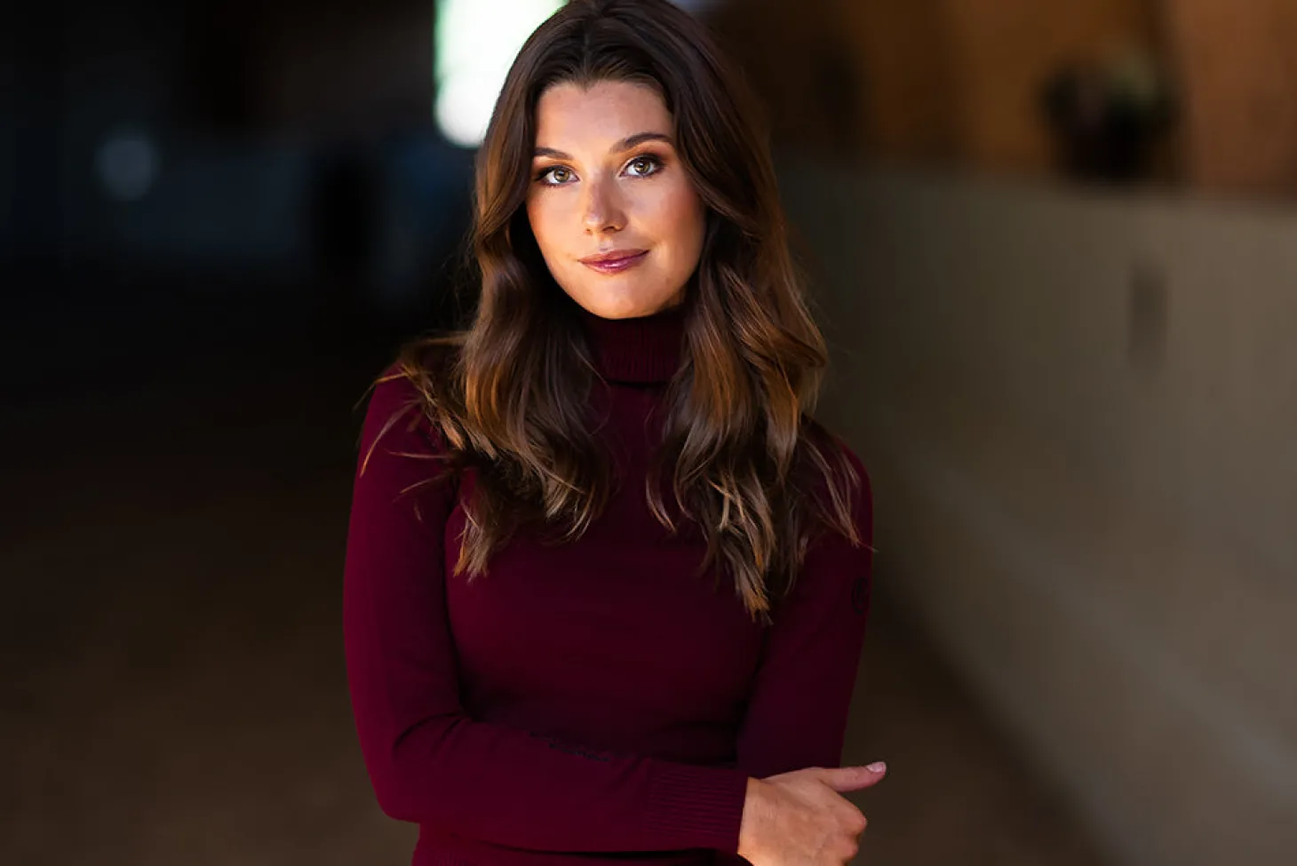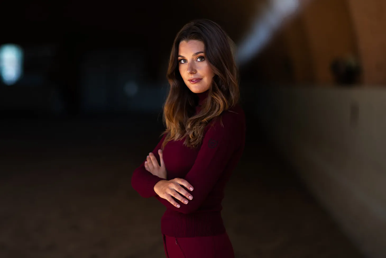 Stylisches Strick Poloshirt in Tiefrot mit schwarzen Details. Das Oberteil hält Sie an kühleren Tagen im Stall und beim Training bequem und warm.