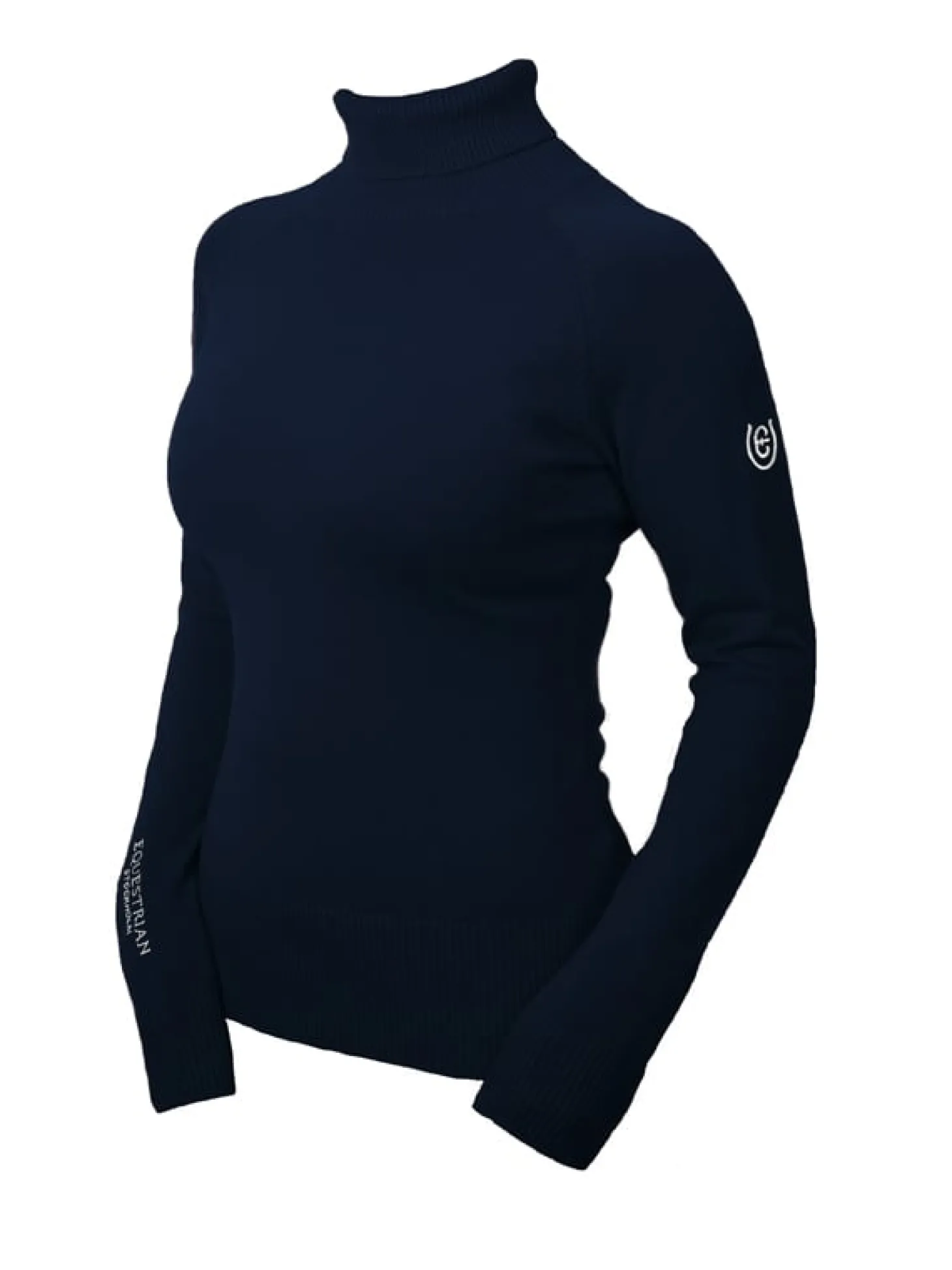 Stylisches Strick Poloshirt in Marineblau mit silbernen Details. Das Oberteil hält Sie an kühleren Tagen im Stall und beim Training bequem und warm.
