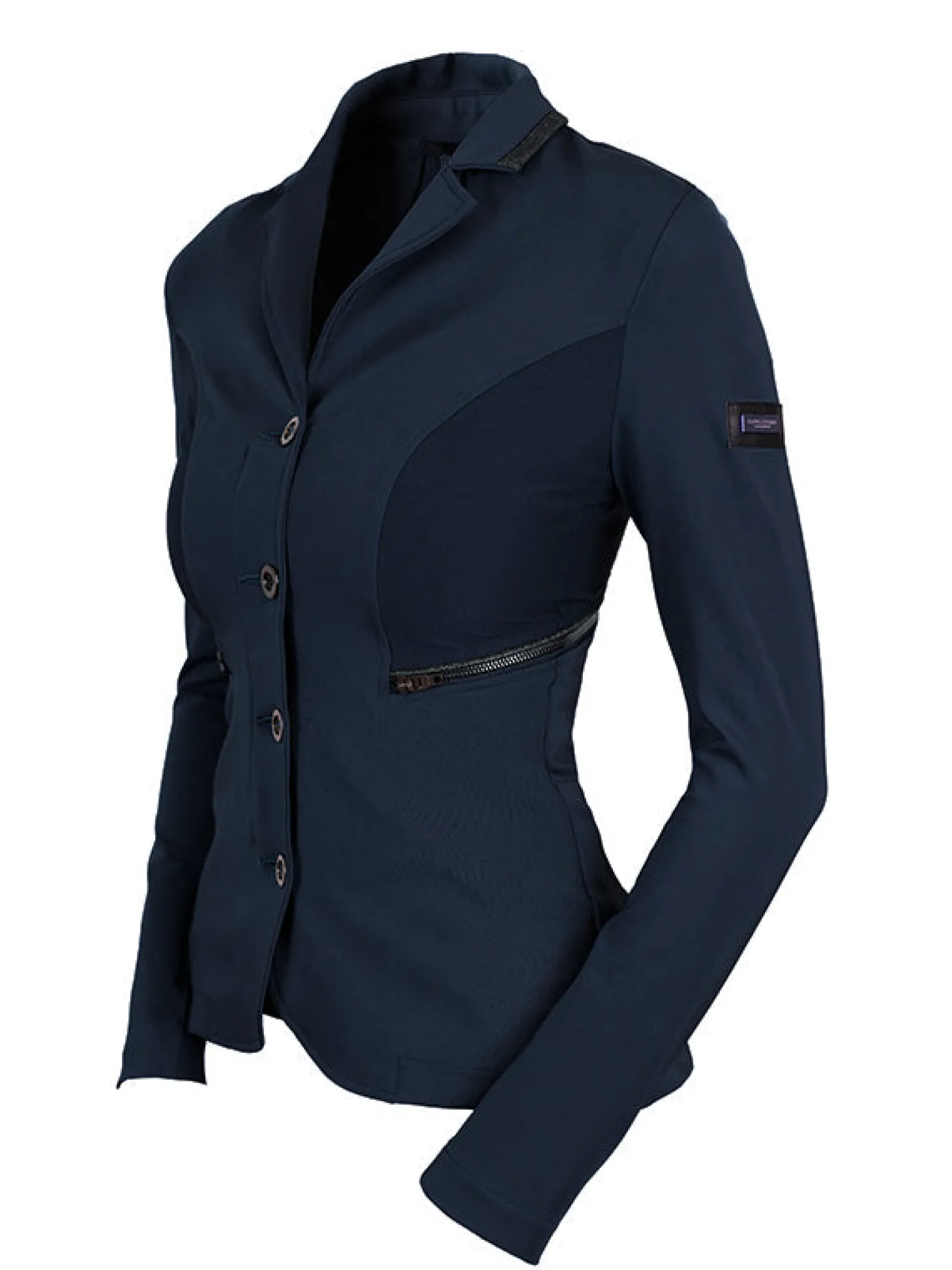 So bleiben Sie während der Turniere kühl, bequem und stilvoll. Die Jacke ist in schönem Marineblau gehalten und mit kleinen, schönen schwarzen Glitzerdetails verziert, die dich bei Wettkämpfen hervorstechen lassen. Die Jacke hat 4 Knöpfe auf der Vorderseite und einen versteckten Reißverschluss darunter, um einen eleganten Look zu gewährleisten. Das Tolle an dieser Jacke ist, dass sie in der Waschmaschine gewaschen werden kann. So sparen Sie Zeit und können sich auf Ihren nächsten Wettkampf konzentrieren und Ihre Träume verwirklichen.