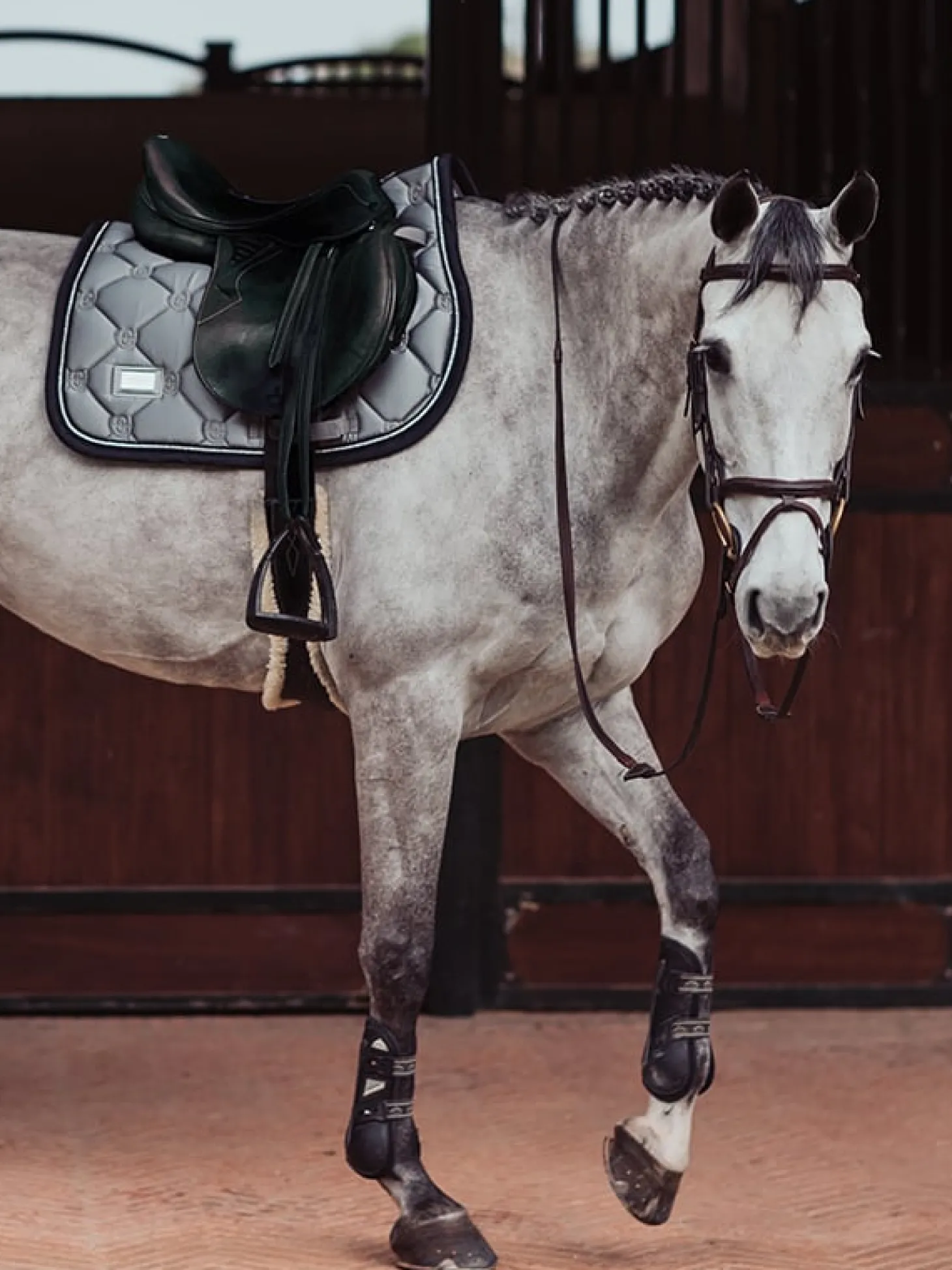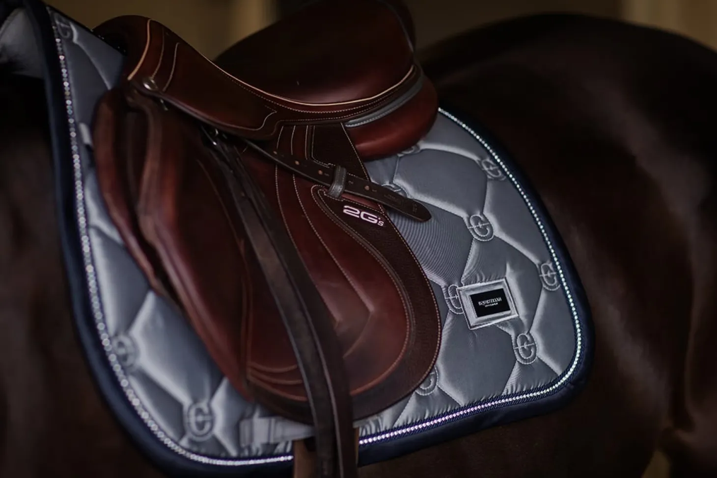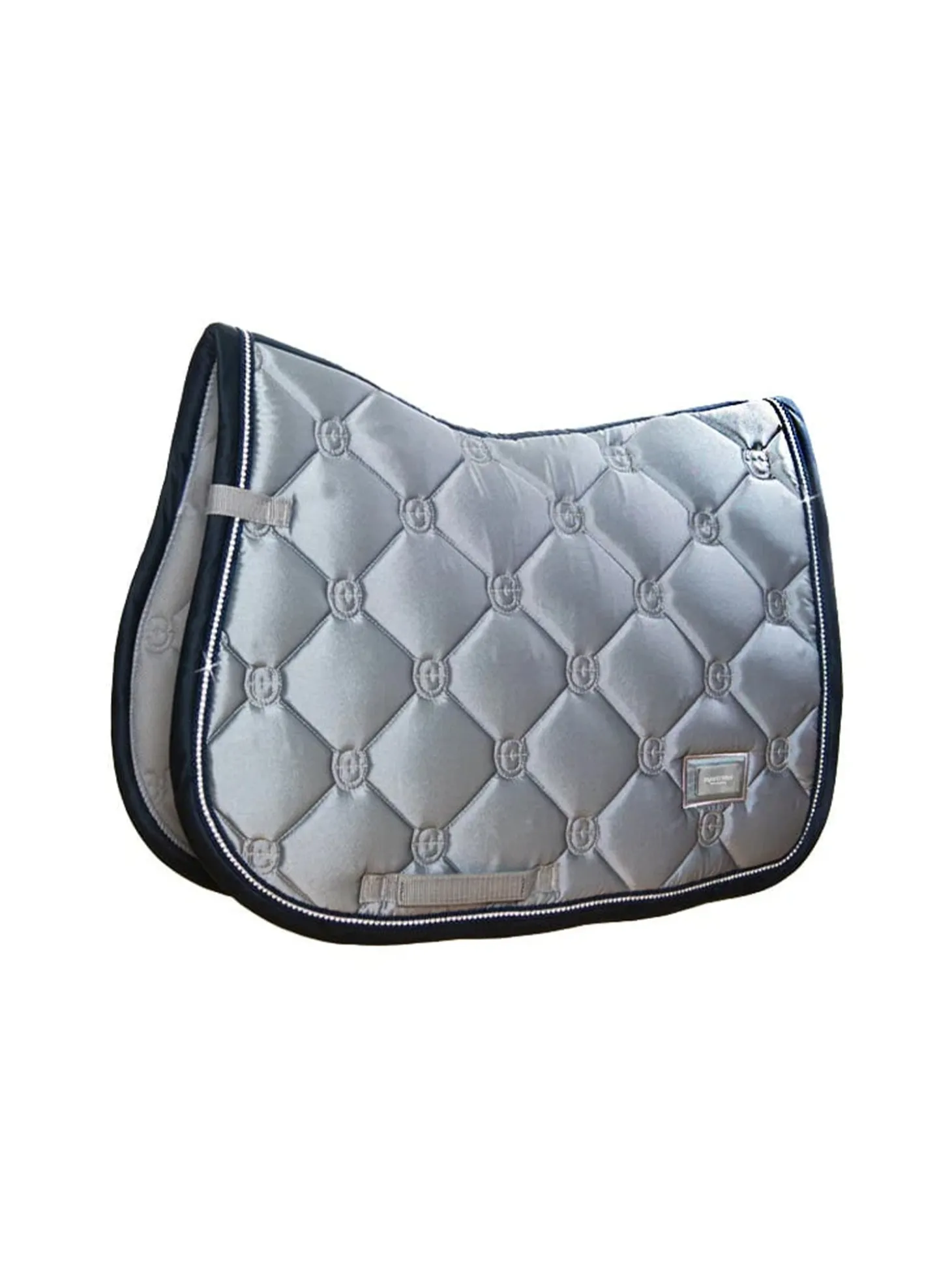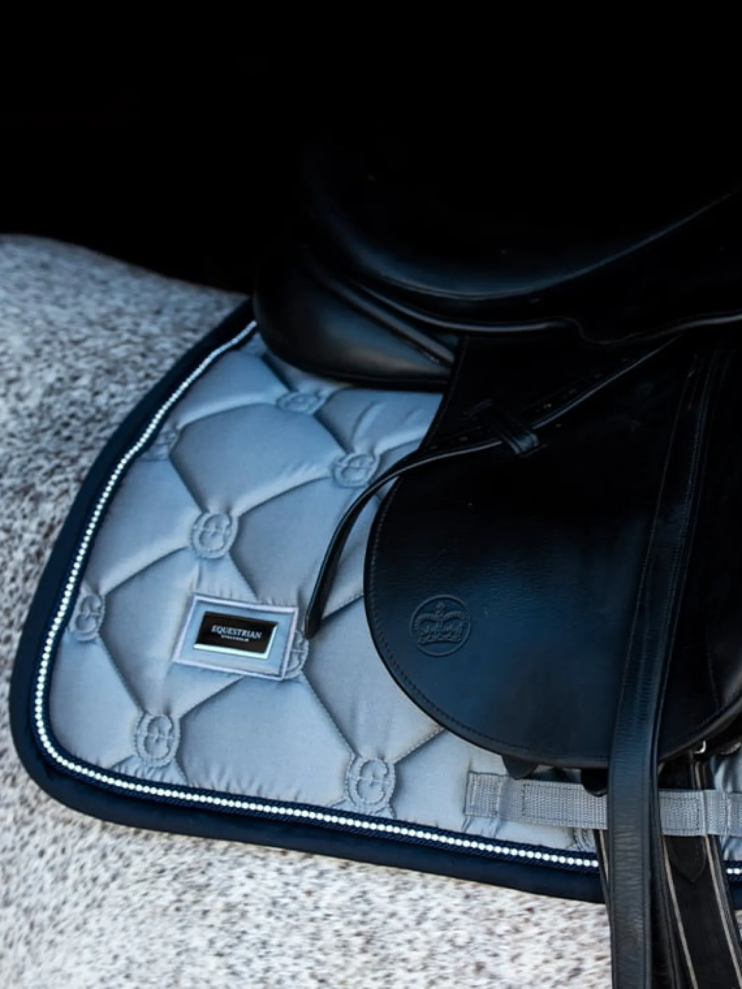 Die wunderschöne graue Springschabracke passt perfekt zu Trainingspässen und Wettkämpfen. Der Einband wird in einem tiefen Dunkelblau mit einer Paspelierung in schimmernden Strasssteinen geschmückt. Das glänzende Material auf der Außenseite verleiht der Schabracke ein luxuriöses Aussehen und die Trockenfunktion auf der Innenseite hält das Pferd bei schweißtreibenden Trainings trocken.
