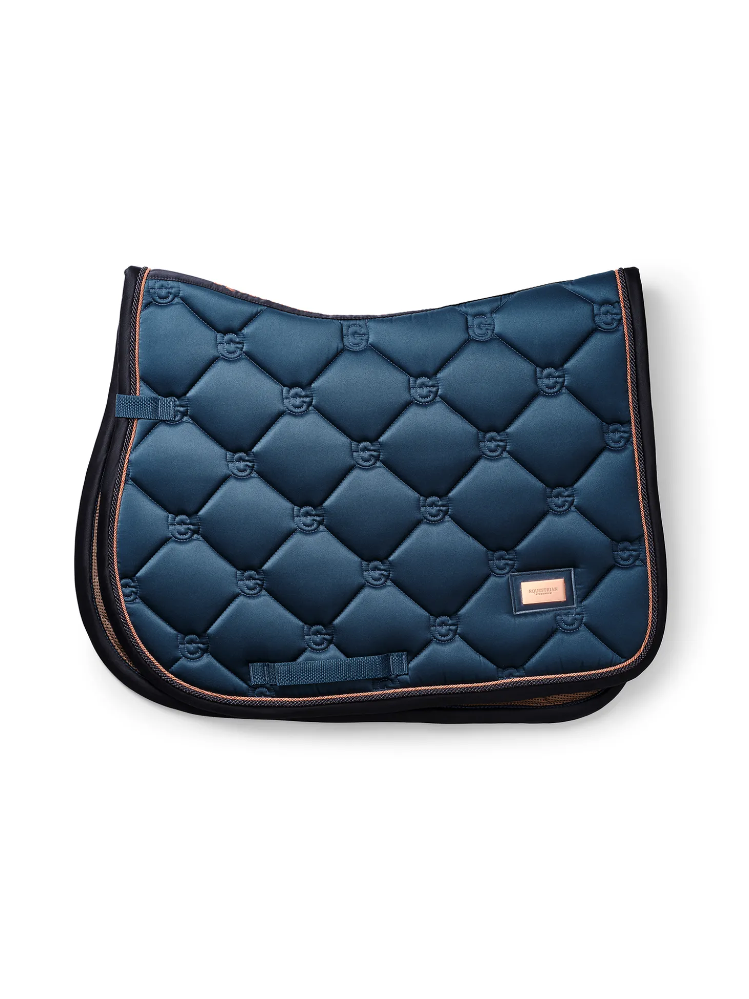 Eine exklusive Schabracke in schönem marineblauem Design mit roségoldenen und marineblauen Paspeln. Das ganze wir mit einem stilvollen roségoldenen Equestrian Stockholm Abzeichen abgerundet.