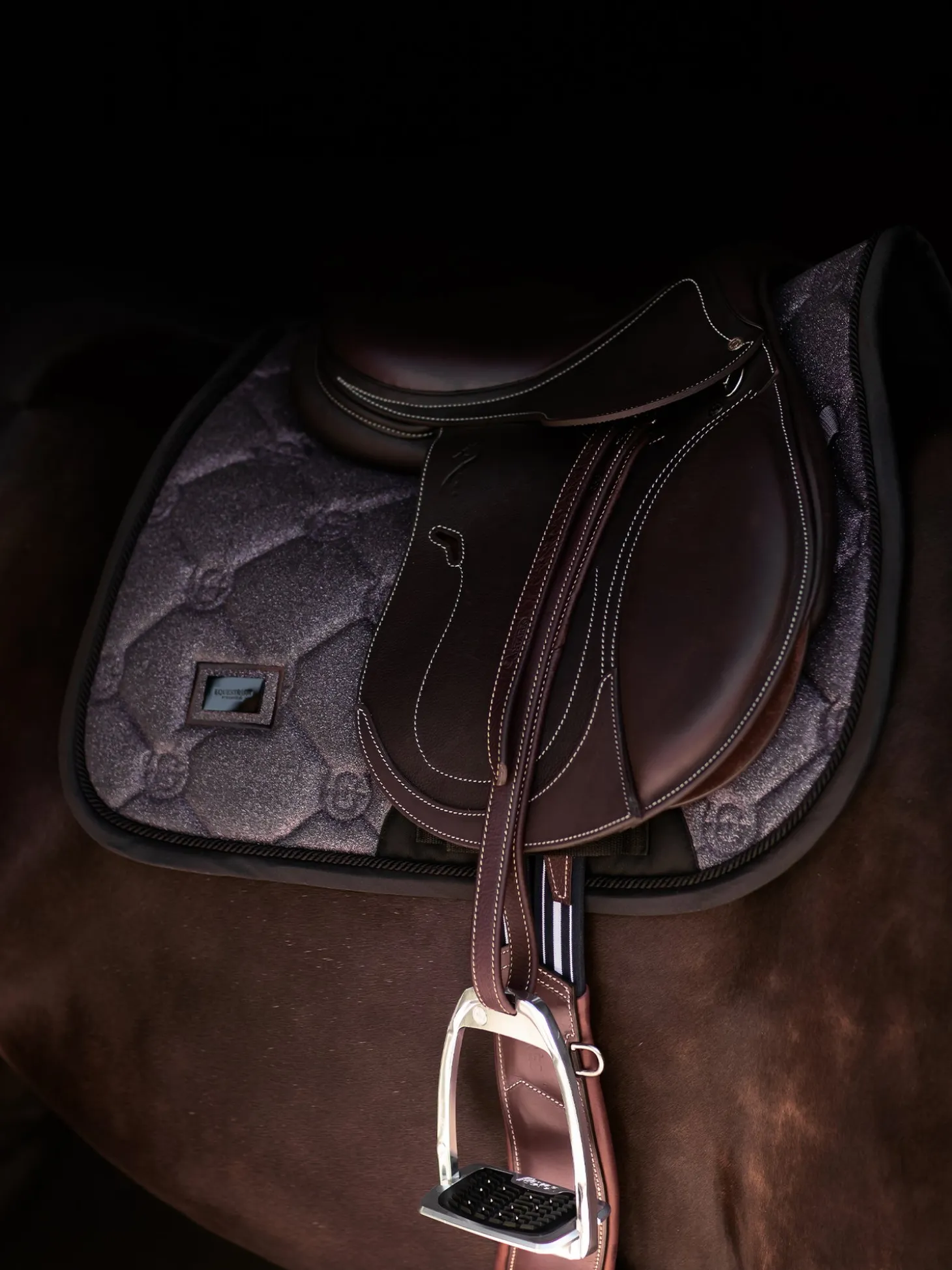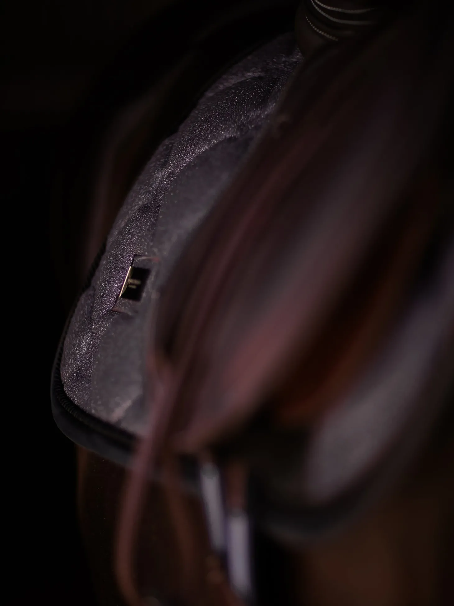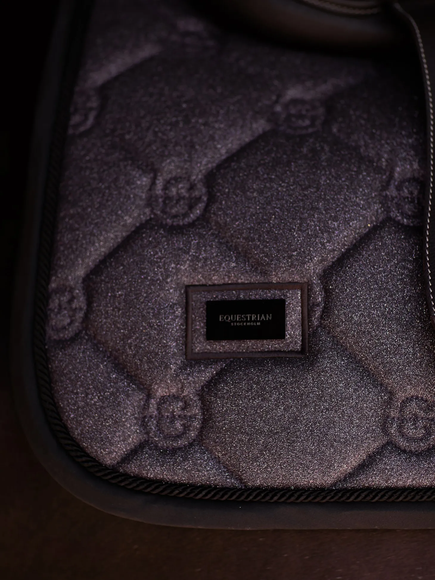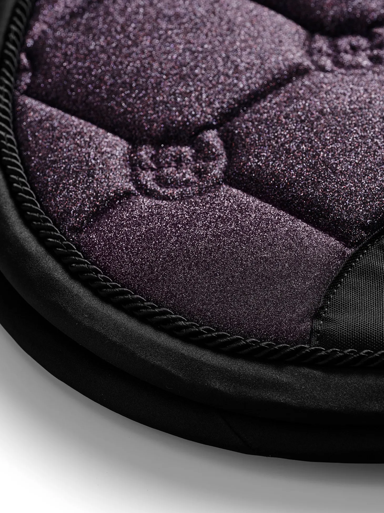 Elegante Schabracke in lila Glitzer mit schwarzen Details. Dekoriert mit unserem Equestrian Stockholm Abzeichen in schwarz. Das Material ist mit High IQ kühlen Komfort behandelt und sorgt somit für schnell trocknende und feuchtigkeitstransportierende Eigenschaften. Dies hilft Ihrem Pferd, länger trocken und frisch zu bleiben. Unter dem Klettverschluss am Sattelgurt, wo die Schabracke am stärksten beansprucht wird, haben wir einen dauerhaften Schutzstreifen angebracht.