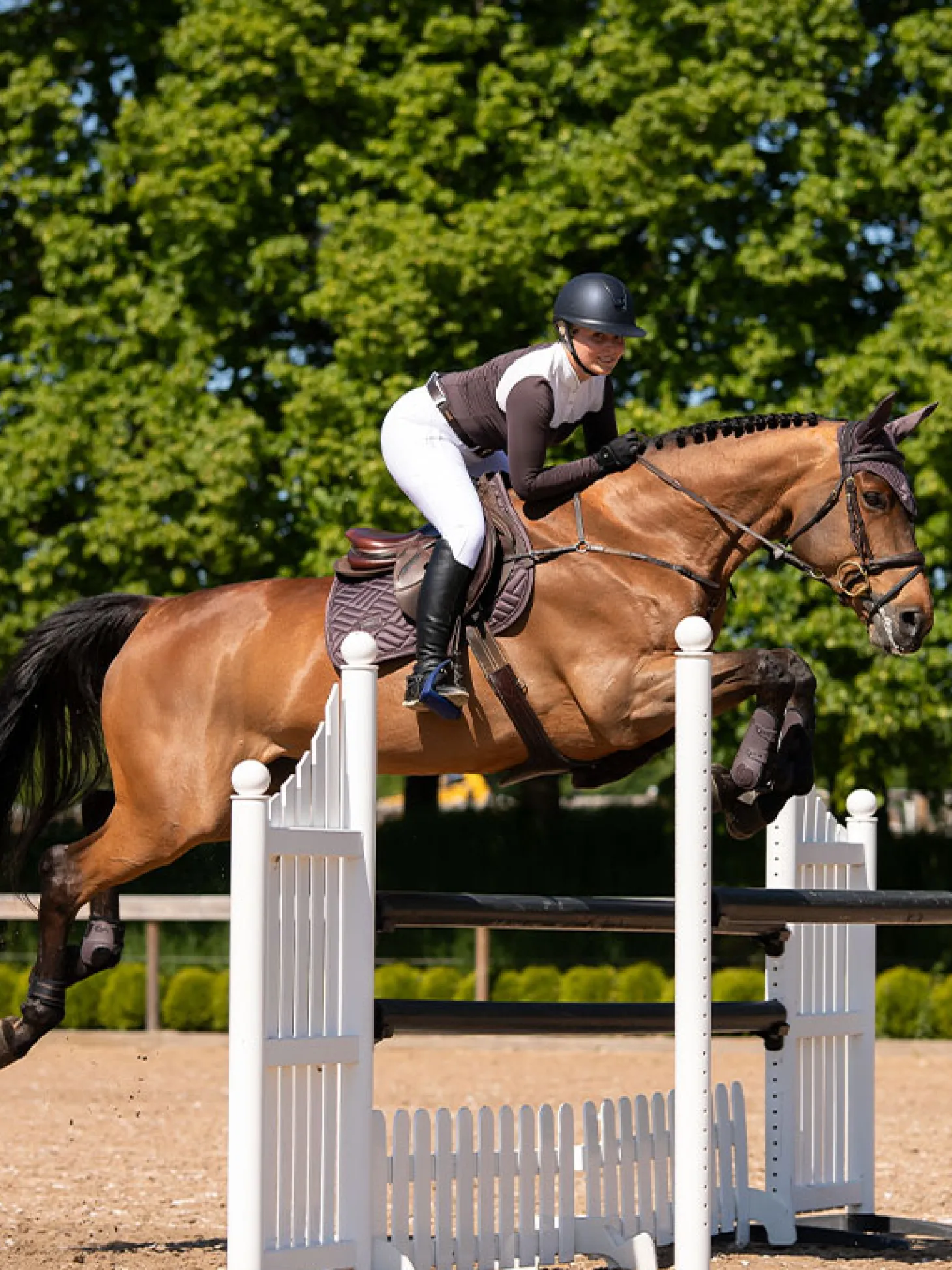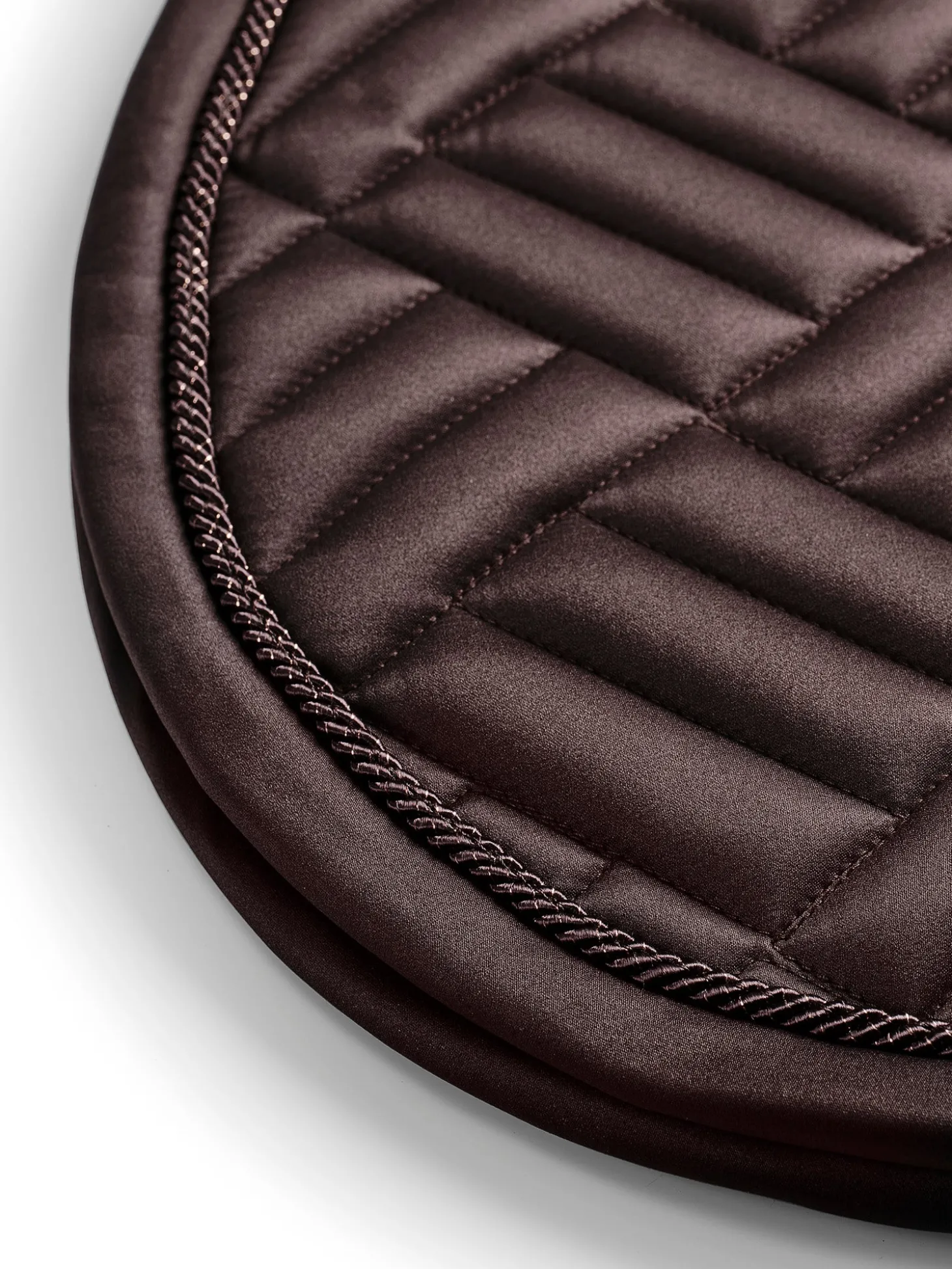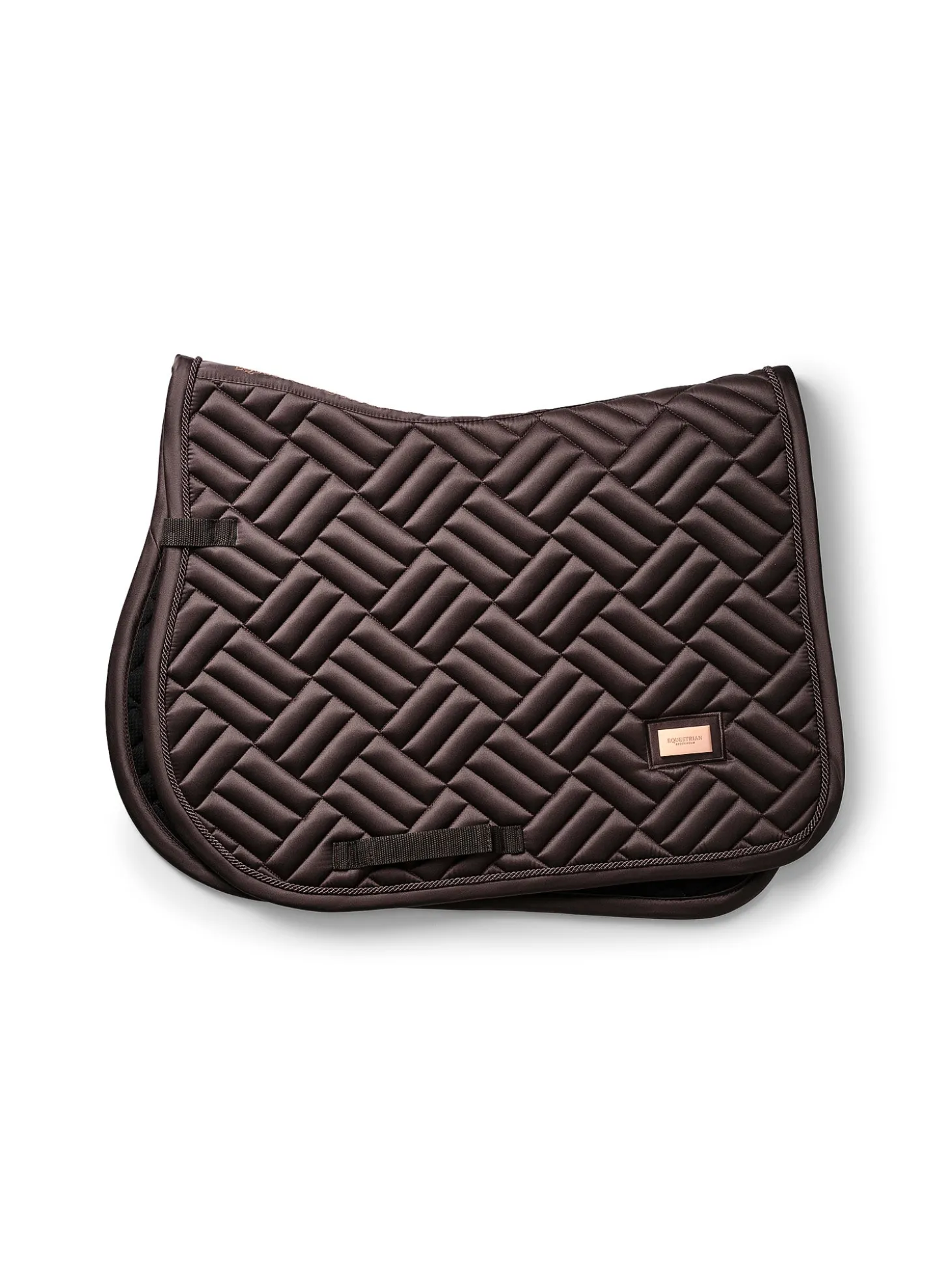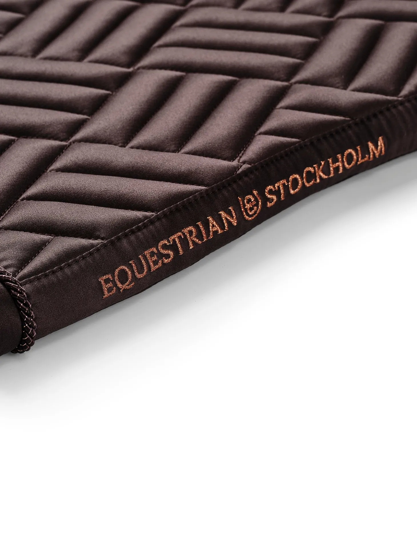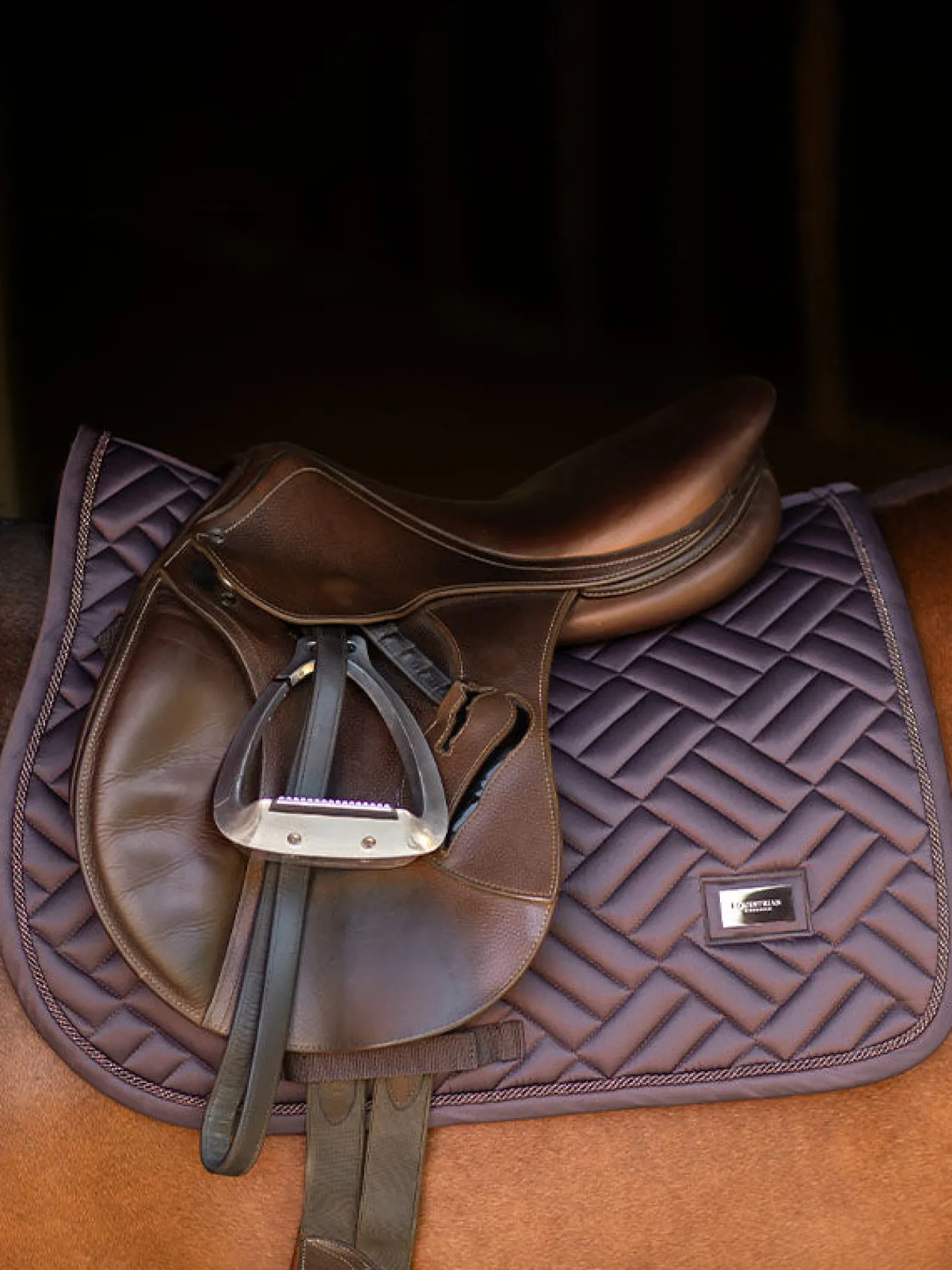 Elegante Schabracke mit moderner Labyrinth Steppung in Braun/Lila mit roségoldenen Details. Verziert mit dem Equestrian Stockholm Abzeichen in Roségold. Das Bambusmaterial ist aufgrund seiner thermoregulierenden Wirkung das ganze Jahr über perfekt – kühlend im Sommer und wärmend im Winter. Außerdem ist es schnelltrocknend, feuchtigkeitsableitend und antibakteriell. Kombinieren Sie die Schabracke mit anderen Teilen aus der Moonless Night Kollektion für einen stilvollen Look von Kopf bis Fuß.